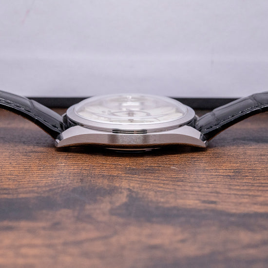 Here we have a 2020 Grand Seiko Elegance Power Reserve SBGK007G, part of their Elegance collection. The beautifully sculpted 39mm brushed and Zaratsu-polished stainless steel case sits snugly on your wrist, with thick, flat-ended tapered lugs and a slim profile. A lug-to-lug length of 43.5mm and a case thickness of 11.5mm ensure a comfortable fit. On the right side is a signed crown. A smooth Zaratsu-polished bezel holds a dual-domed sapphire crystal, AR-coated on the inside, above a stunning, crisp white dial. The outer minute track features facet-edged indexes, Zaratsu-polished markings indicating the hours. At 3 o’clock, a power reserve indicator is positioned. At 9 o’clock, a small seconds subdial is located, both complemented by razor-edged Zaratsu-polished Dauphine hands that shimmer with the dial as you rotate your wrist. At 12 o’clock, we have the applied GS and Grand Seiko printed underneath, completing this dynamic dress watch. On the reverse, a screw-down exhibition case back features engraved details of the watch around the edge, and a Grand Seiko blue lion motif is printed in the centre, showcasing the manually wound Grand Seiko Cal. 9S63, 33 jewels, beating at 28,800 beats per hour and an impressive 72-hour power reserve; the movement has been adjusted to six positions and temperatures at the factory, finished with attractive Cotes de Geneve decoration and blued screws, the movement has been developed with Micro Electro Mechanical Systems (MEMS) Technology where precise components are produced using advanced semiconductor manufacturing. It comes paired with its original 19mm Grand Seiko leather strap and a signed push-button folding buckle. The watch also includes its Grand Seiko presentation box, swing tag, and paperwork.