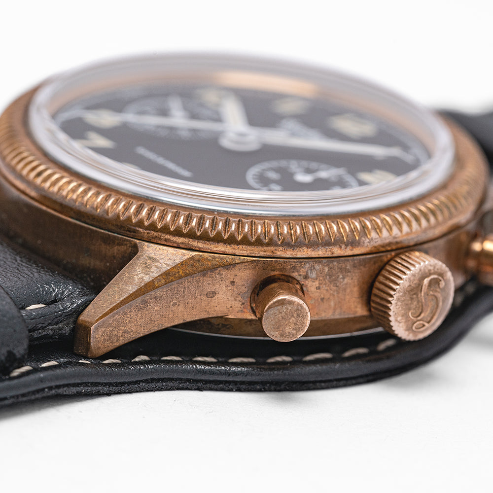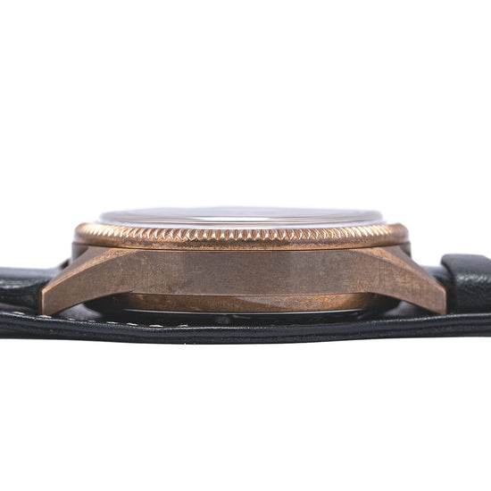 Here we have a 2020 Hanhart 417 ES Bronze Rake & Revolution Limited to 150 pieces, the watch is inspired by the Hanhart 417 Flieger or pilots chronograph made of brass and chrome famously worn by Steve McQueen while out riding one of his motorcycles. Made in collaboration with Rake and Revolution magazines founded by Wei Koh. The bronze CuSn8 case was specifically chosen due to its properties to quickly patina and has a 42mm curving over your wrist with tapered flat-ended lugs, a lug-to-lug length of 49.5mm and a case thickness of 13mm giving the watch an impressive wrist presence. Down the right side, we have the piston chronograph pushers and a signed crown in the centre. The distinctive fine-fluted bidirectional bezel with the characteristic flash of red at 12 o’clock holds a domed sapphire crystal above a matte black dial. An outer minute track is precisely executed with large Arabic numerals marking the hours coated in Super LumiNova, at 3 o’clock a 30-minute register and at 9 o’clock continuous seconds register, elegant syringe style hands are infilled with Super LumiNova and complemented by a finely tapered chronograph hand completes this vintage-inspired bi-compax chronograph. At 12 o’clock we have the Hanhart motif “23 Jewels” and at 6 o’clock “Shockproof”. On the reverse, a screw-down stainless steel case back with “Revolution” 417 Bronze Edition /150 “Hanhart” deeply engraved, inside a manually wound Sellita SW 510 M, 23 jewels, beating at 28,800 beats per hour. The watch comes fitted on its 21mm Hanhart Bund leather strap with a signed bronze buckle, the watch comes with its Hanhart presentation box, travel case and paperwork.