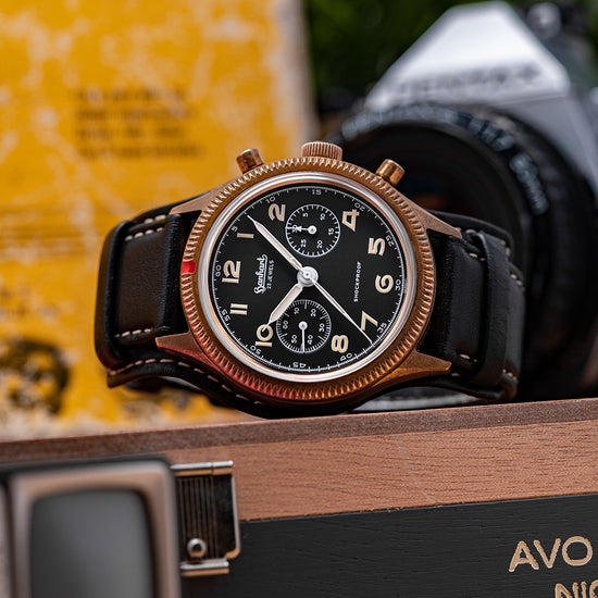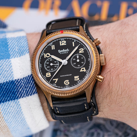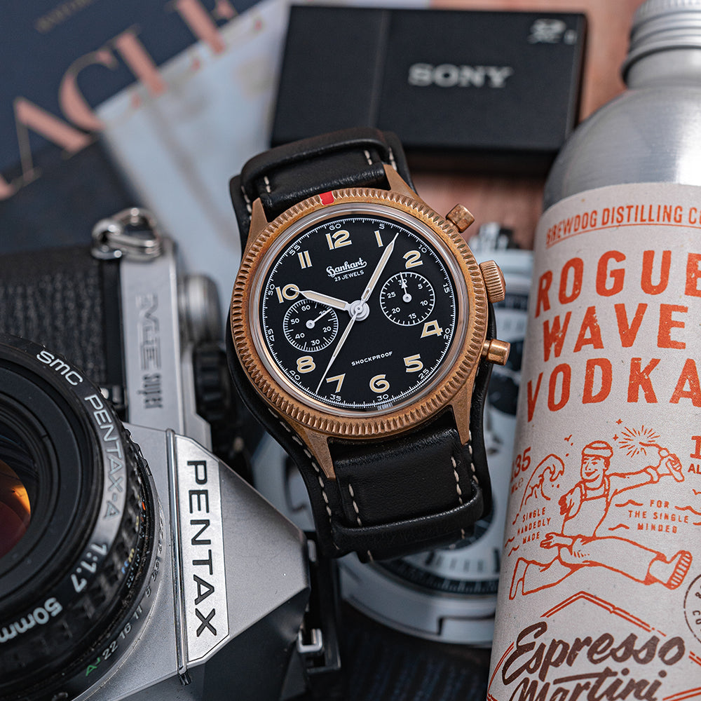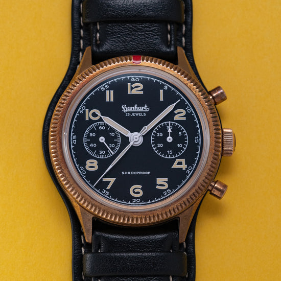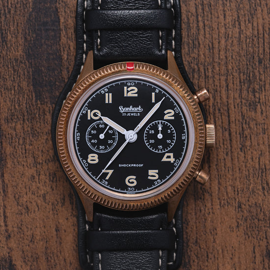 Hanhart was founded in 1882 by watchmaker Johann A. Hanhart. Situated in the small town of Diessenhofen near the River Rhine in Switzerland. In 1902 he relocated to Schwenningen in southern Germany, and Johann's son Wilhelm Julius joined the company in 1920. Innovation and efficient manufacturing techniques saw the introduction of a mechanical stopwatch in 1924. By 1926 they had increased the product range to include wristwatches. In 1938 they produced the single-button “Calibre 40”, which became the mainstay of the company. Expansion during 1939 had the company employing 200 staff. Hanhart chronographs were worn by pilots and naval officers with the production of the iconic “Calibre 41”, their first two-button chronograph. During the war years, production had to stop and Wilhelm fled to neutral Switzerland not returning to Germany until 1949. They entered the very first BaselWorld in 1952. The Hanhart Calibre 42 was developed in 1957 and was used by the Luftwaffe of Germany in 1962. Celebrating their 175th Anniversary in 2007 They created the “Opus 41” a hand-wound chronograph in platinum, equipped with an original, Hanhart “Calibre 41”, which was limited to 39 watches. Today they continue to create timepieces using the latest technology and materials whilst keeping to their founding principles.