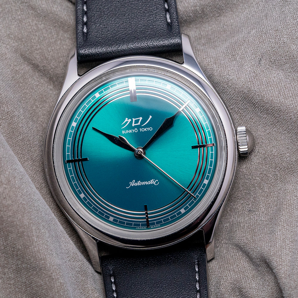 Here we have a 2020 Kurono Tokyo Green Mori, which was created to celebrate its first anniversary on the 1st of June 2020. Limited to 288 pieces, the 37mm high polished stainless steel case is gently tapered towards the lugs with a case thickness of 11mm and lug-to-lug length of 43.5mm, ensuring a comfortable fit on your wrist. The watch takes its design cues from the Art Deco timepieces of the past. On the right side is a domed crown, and a smooth polished bezel holds a domed sapphire crystal above the stunning forest green dial. Under different lighting conditions, the dial shimmers in the light as you rotate your wrist. An outer minute track is precisely printed with three engraved concentric steel rings with four applied baton indexes to catch the light in a mesmerising way. Sculpted brushed hands complemented by a tapered teardrop balanced sweeping second-hand finishing this elegantly understated vision of Japanese creativity and sensibility. The brand motif is found at 12 o’clock with Automatic at 6 o’clock. On the reverse, a screw-down case back with the brand motif and inside an automatic Miyota 90S5, 24 jewels, 28,800 beats per hour. This movement is part of the high-grade Miyota family with hand winding and hacking for your convenience. The watch comes fitted on a 20mm leather strap with a buckle and also comes with its Kurono Tokyo presentation box.