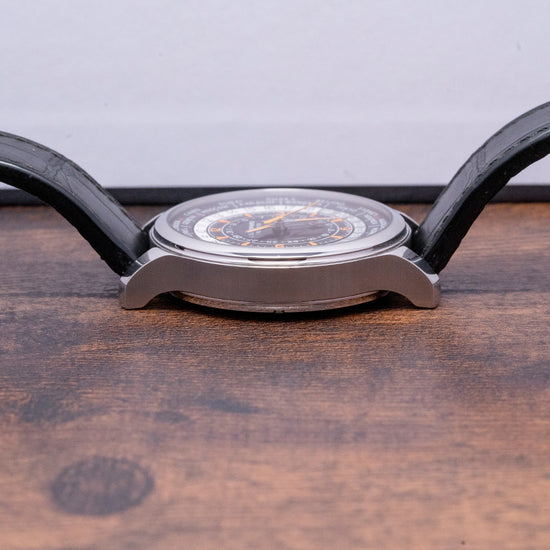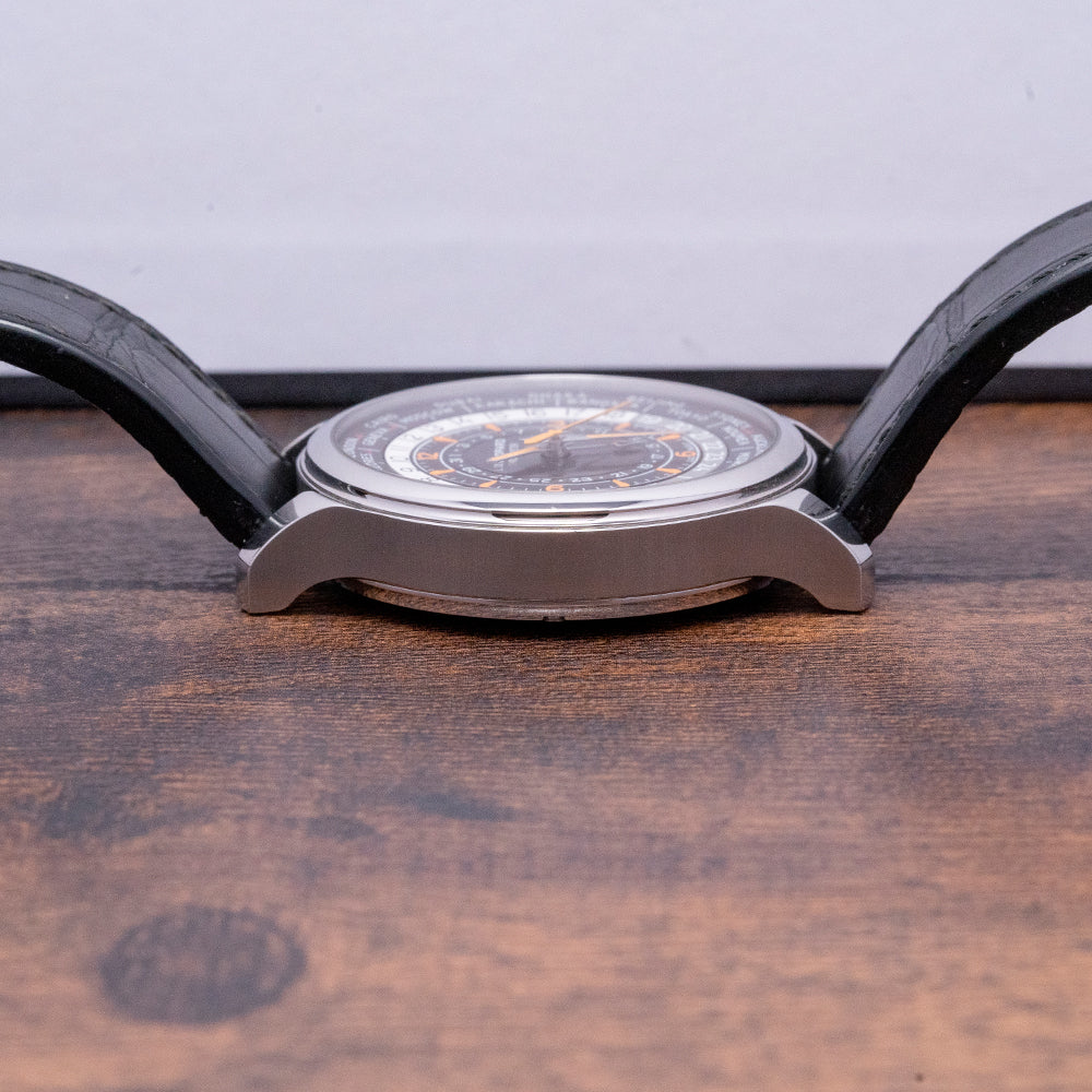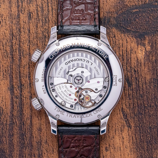 Here we have a 2020 L.U.C Chopard Time Traveller One GMT with a curvaceous 42mm polished stainless steel case, elegantly tapered lugs with a lug-to-lug length of 50mm and a case thickness of 12mm to ensure a comfortable fit on your wrist. Down the right side, we have a top-signed crown that adjusts the time and date, and the bottom crown adjusts the 24-hour GMT World Time rotating inner bezel. The beautifully sculpted smooth bezel holds a flat sapphire crystal above a striking monochromatic dial, around the edge, we have the World Time in black and a 24-hour GMT in grey and silver with contrasting white and black Arabic numerals to differentiate day and night, an inner concentric ring reminiscent of the sector dials of the past has applied 12-hour Arabic numerals and dagger indexes coated in orange Super-LumiNova marking the hours surrounding the date ring perfectly balances the form and function of the dial, the date arrow hand hits the mark and is easily read, Chopard signature sword hands complemented by an orange tapered sweeping second hand are infilled with orange Super-LumiNova complete this dynamic vintage inspired travelling companion. At 12 o’clock the L-U-Chopard motif “Chronometer” printed underneath. On the reverse, a screwed-down exhibition case back with sapphire crystal and engraved around the edge the watch’s model name, inside an automatic L.U.C Cal. 01.05-L, 39 jewels, 28,800 beats per Hour, COSC Certified movement is exquisitely decorated in Côtes de Genève. The watch comes fitted on a 20mm Chopard leather strap with a signed pin buckle and the watch comes with its Chopard presentation box, swing tag and paperwork.