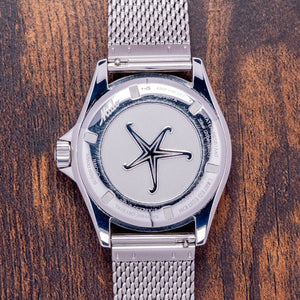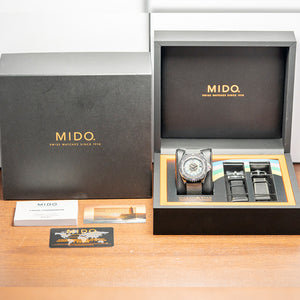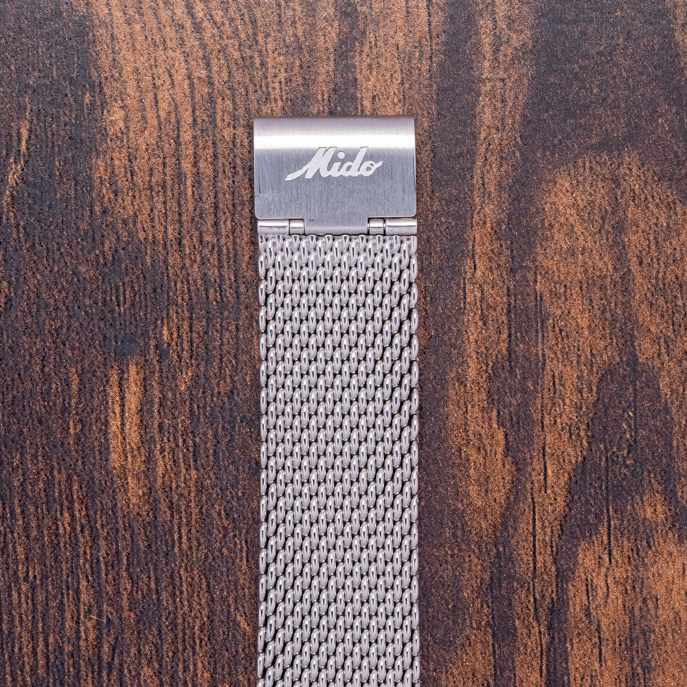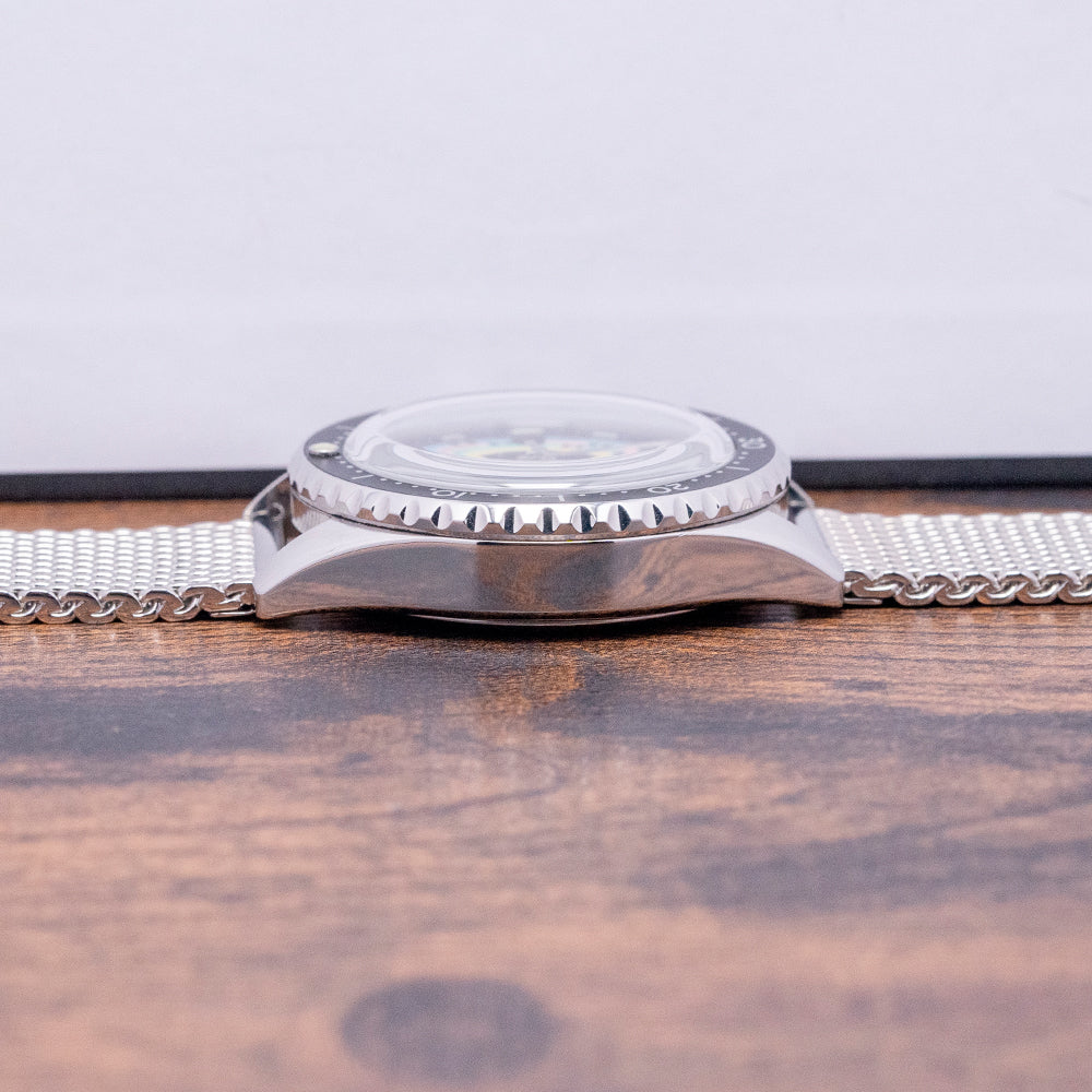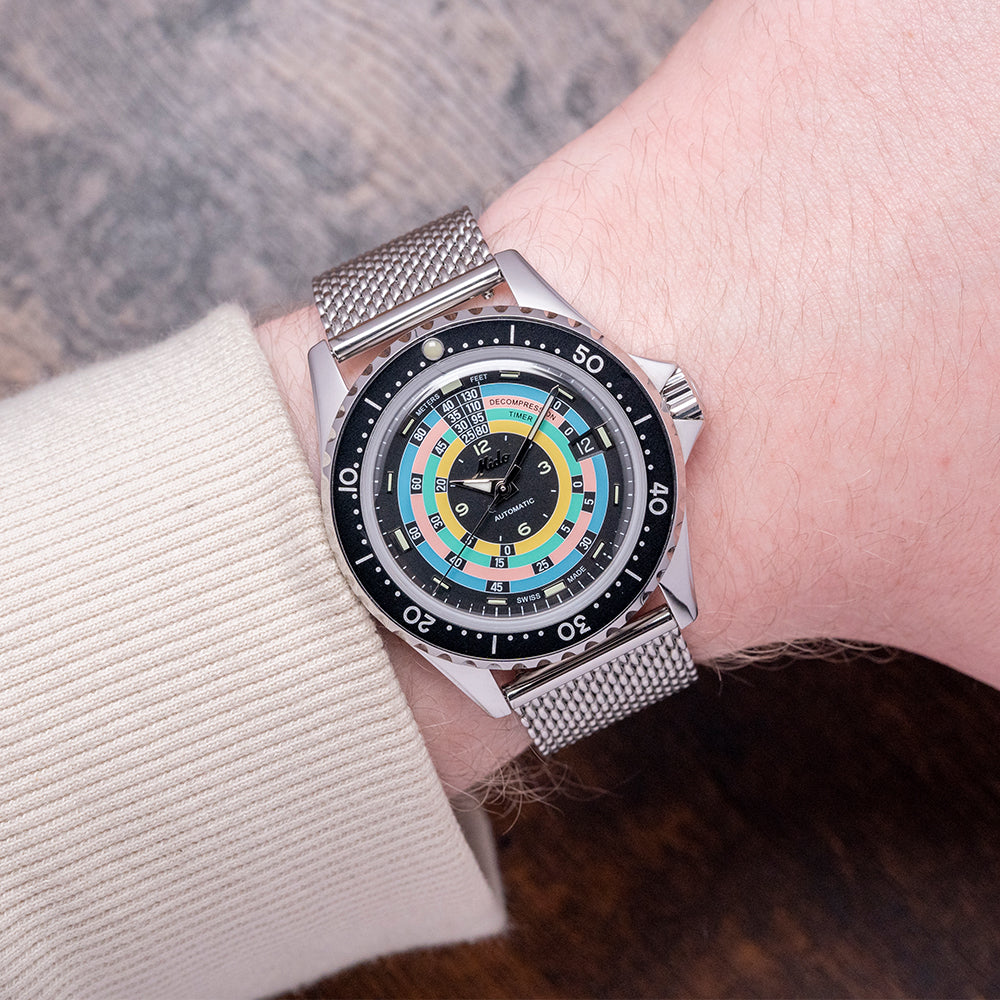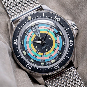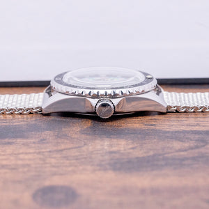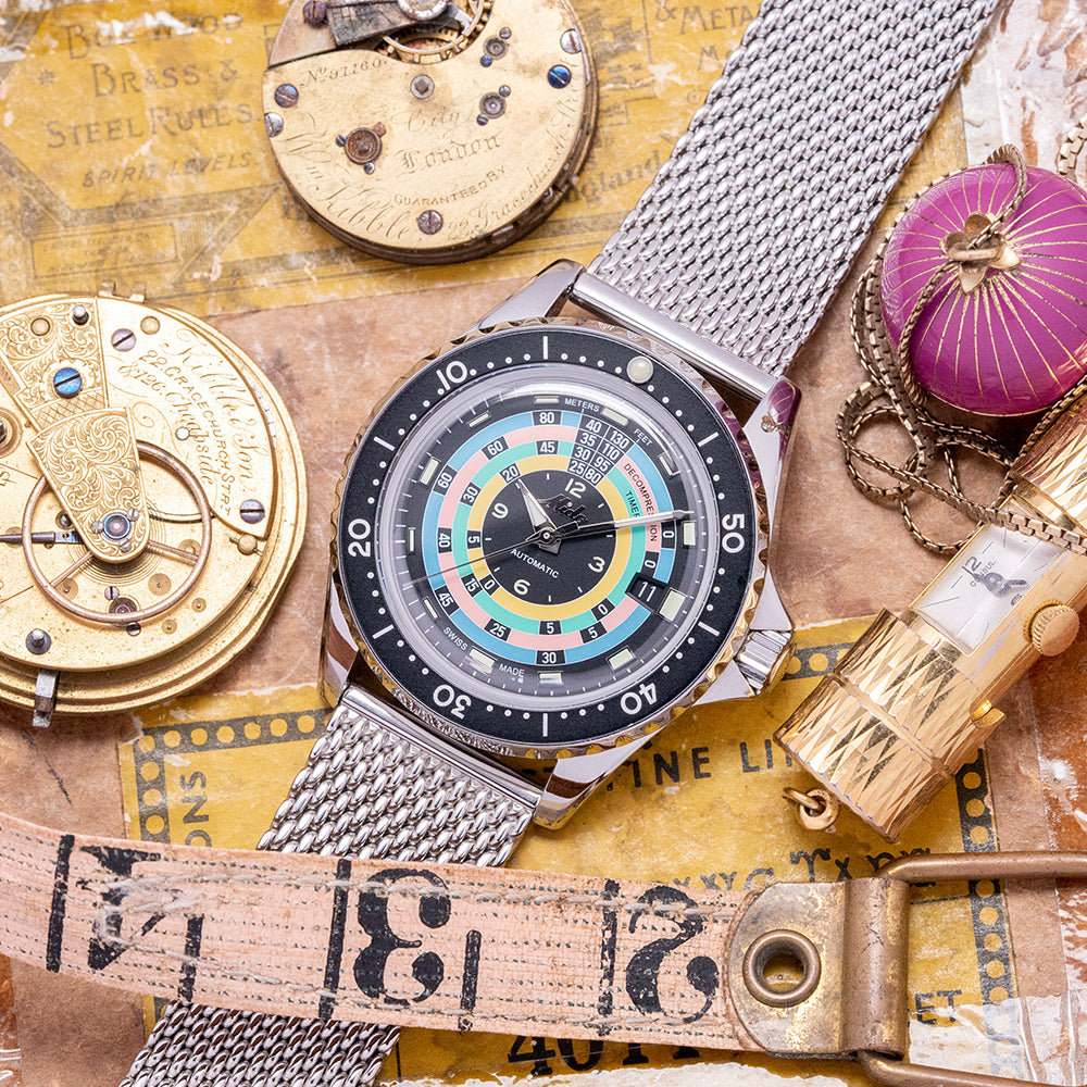 Here we have a MIDO Decompression 1961 Re-issue Hodinkee limited edition of 0685/1,961 pieces based on the original 1961 Mido Powerwind 1000, ref. 5907, which had a production run until 1965, sold to Hodinkee shoppers, it was globally exclusive on their website since they are a Mido Authorised Dealer. The polished 40mm stainless steel case curves over your wrist with tapered lugs, a lug-to-lug length of 46.8mm and a case thickness of 13.5mm, ensuring a comfortable fit on your wrist. On the right side is a signed screw-down crown. A unidirectional dive bezel has a lume pip at 12 o’clock and large printed numerals holding a box sapphire crystal above the striking decompression dial. Lume-coated baton indexes at the hour surrounding four rings in blue, pink, green and yellow with the all-important timings for decompression where a diver stops for a set time to remove the chance of the “Bends” where nitrogen dissolved under high pressure in the bloodstream normally through the process of respiration forms bubbles in the blood when the pressure decreases too rapidly, these bubbles can be lethal. In the centre, we have Arabic 12, 3, 6 and 9 numerals with baton indexes coated in luminance marking the hours, and at 3 o’clock, a date window. The hands consist of a long minute hand and a shorter hour hand filled with luminance complemented by a tapered sweeping second hand. On the reverse, a screw-down case back with the number out of 1,961 and the details of the watch engraved around the edge, in the centre in relief of the Ocean Star starfish, inside an automatic Mido Cal. 80, 25 jewels, beating at 21,600 beats per hour, the movement has a base of the Swatch-owned ETA C07.621. The watch comes fitted on a 21mm vintage-style mesh bracelet with a signed clasp plus two additional straps in the box, and the watch comes with its Mido presentation box and paperwork.