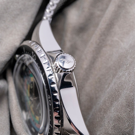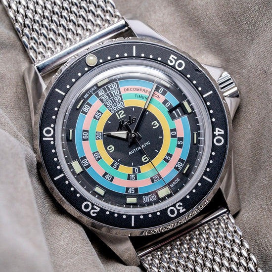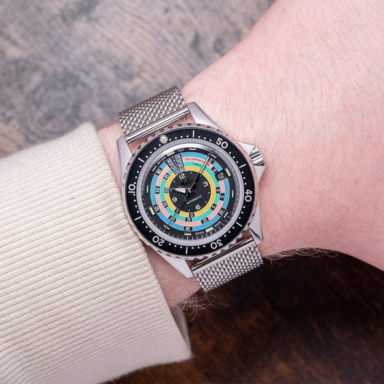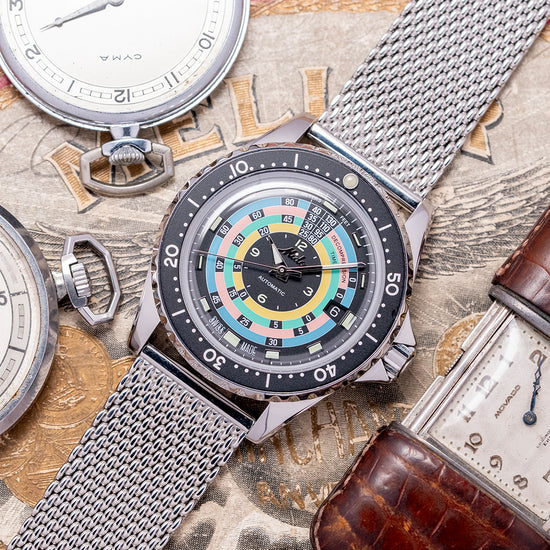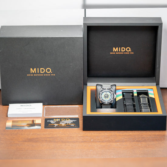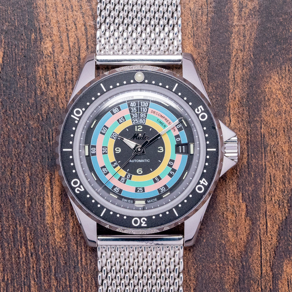 Here we have a MIDO Decompression 1961 Re-issue Hodinkee limited edition of 1,961 pieces based on the original 1961 Mido Powerwind 1000, ref. 5907, which had a production run until 1965, was sold to Hodinkee shoppers; it was globally exclusive on their website since they are a Mido Authorised Dealer. The polished 40mm stainless steel case curves over your wrist with tapered lugs, a lug-to-lug length of 46.5mm and a case thickness of 13.5mm, ensuring a comfortable fit on your wrist. On the right side is a signed screw-down crown. A unidirectional dive bezel has a lume pip at 12 o’clock and large printed numerals holding a box sapphire crystal above the striking decompression dial. Lume-coated baton indexes at the hour surrounding four rings in blue, pink, green and yellow with the all-important timings for decompression where a diver stops for a set time to remove the chance of the “Bends” where nitrogen dissolved under high pressure in the bloodstream normally through the process of respiration forms bubbles in the blood when the pressure decreases too rapidly, these bubbles can be lethal. In the centre, we have Arabic numerals 12, 3, 6, and 9 with baton indexes coated in luminance marking the hours, and at 3 o’clock, a date window. The hands consist of a long minute hand and a shorter hour hand filled with lume, complemented by a tapered sweeping second hand. On the reverse, a screw-down case back with the number out of 1,961 and the details of the watch engraved around the edge, in the centre in relief of the Ocean Star starfish, inside an automatic Mido Cal. 80, 25 jewels, beating at 21,600 beats per hour, the movement has a base of the Swatch-owned ETA C07.621. It comes paired with its 21mm vintage-style mesh bracelet with a signed clasp, plus two additional straps in the box, and the watch comes with its Mido presentation box and paperwork.