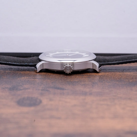 Here we have a 2020 Ming 17.06 Slate Dial Automatic that comes from the same stable as the highly respected GPHG 2019 Horological Revelation-winning 17.06 Copper. Its 38mm round stainless steel case is highly polished with brushed flanks leading to the characteristic outward-facing curvaceous lugs, and a lug-to-lug length of 43.5mm and a 10mm thickness ensure a comfortable fit on your wrist. On the right side a signed push/pull crown with deep knurling for extra grip. A flat sapphire crystal AR coated on both sides for great viewing angles. Its slate dial is multi-layered with the printed numerals in the familiar Ming font on an outer ring of sapphire crystal giving the illusion that the numerals are floating, coated in Super-LumiNova C1 for a distinctive green hue. In the centre, we have a disc that began as a piece of brass that is etched with this mesmerising swirling three-dimensional pattern which is then anodised to give it this rich dark colour. The finely Ming sculptured hands are coated in the same Super-LumiNova C1. On the reverse, screwed in case back, engraved with the model details, inside an automatic ETA 2824-2, 25 jewels, 28,800 beats per hour. The watch comes paired with its 20mm black Alcantara leather with blue stitching, handmade by Jean Rousseau Paris and the watch comes with its Ming presentation box, travel pouch and paperwork.