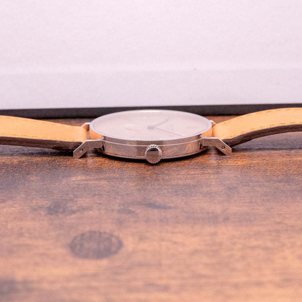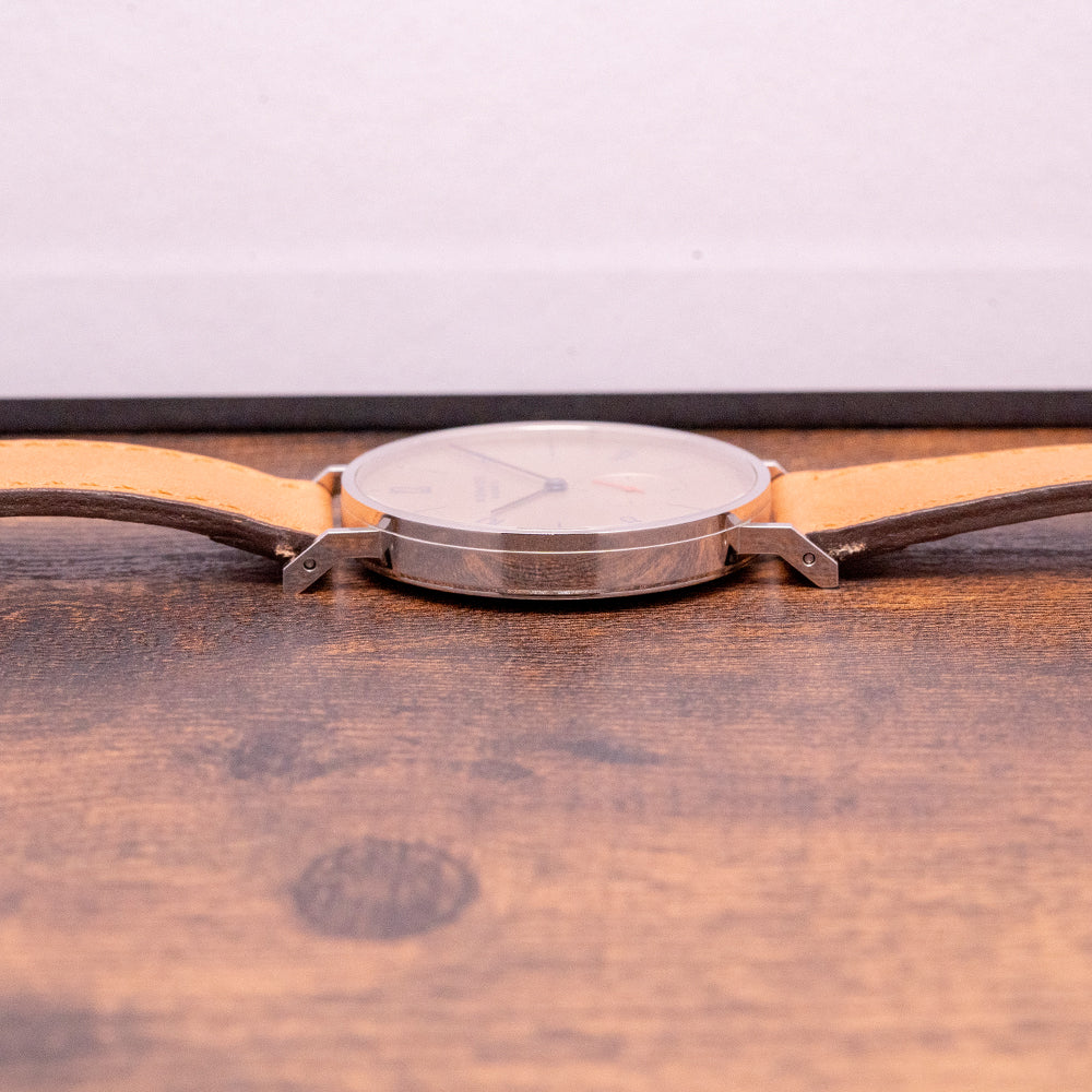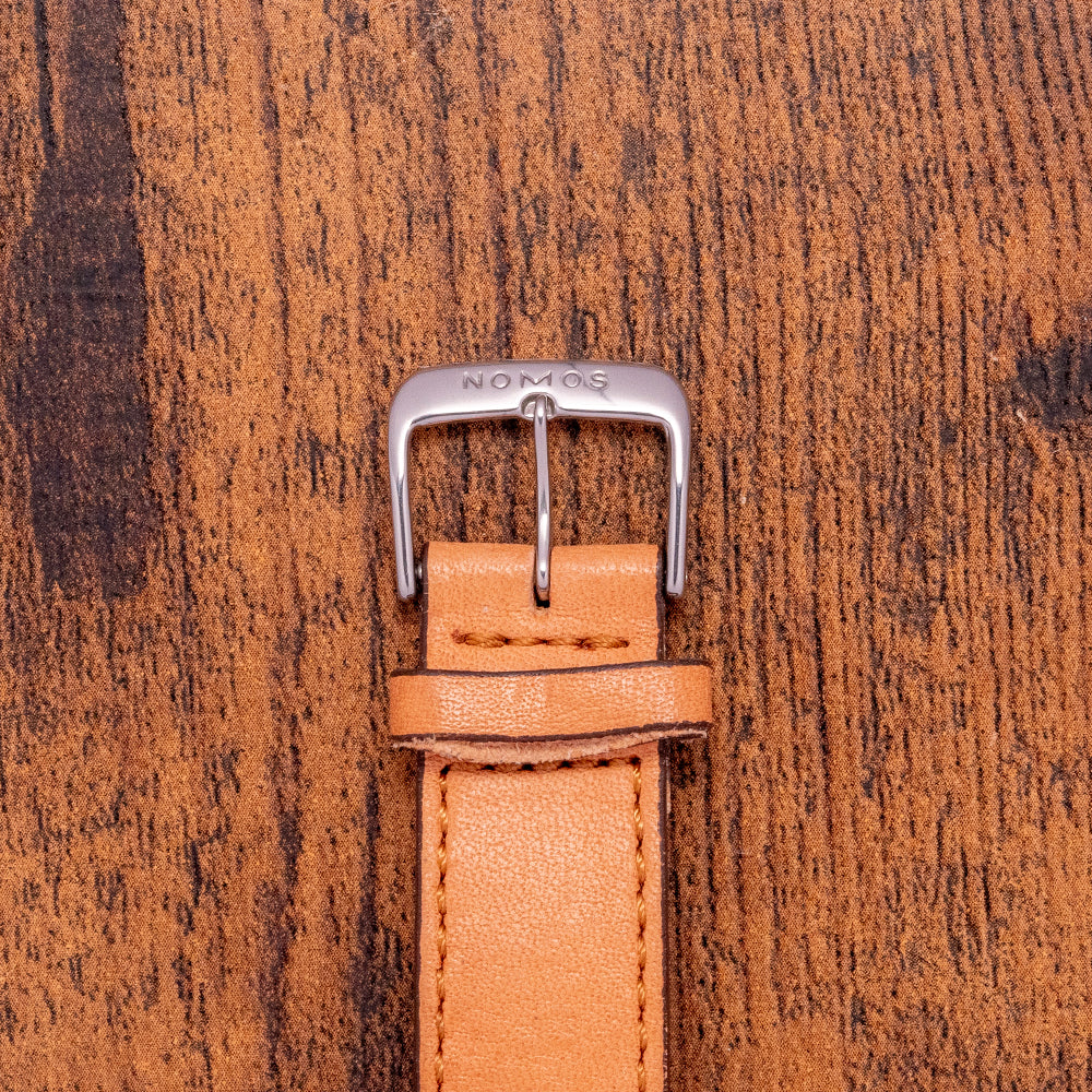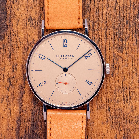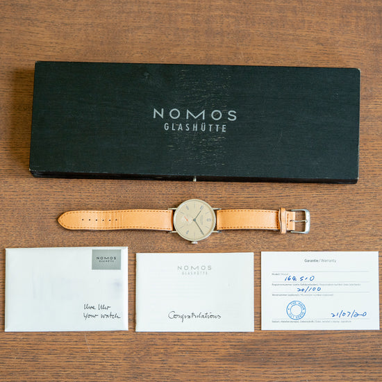 This watch is sold with its original NOMOS presentation box and paperwork. The watch is paired with a 20mm leather strap, which is well worn, and polished signed pin buckle. The watch is from July 2020 and is sold in worn condition, a full polish can be provided at an additional cost. The watch comes with our 12-Months NON-Waterproof Warranty.