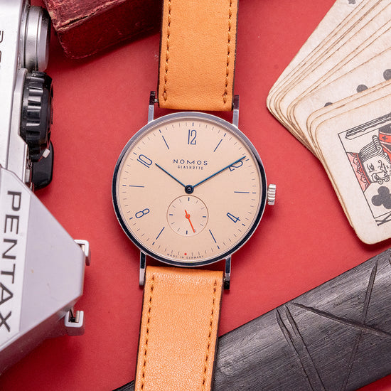 Here we have a colourful collaboration with The HourGlass, 2020 Nomos Tangente Red Dot Singapore 164.S10 Limited Edition of 100 pieces. The Hour Glass is one of Asia's largest luxury watch groups with over 50 boutiques across the Asian Pacific, they are authorised retailers for Rolex, Patek, Hublot, F.P.Journe, Omega, Tudor and TAG Heuer. A curvaceous 37mm polished stainless steel case sits on your wrist with the signature thin angled drilled lugs leading to a lug-to-lug length of 47mm and a case thickness of just 6.5mm ensuring a comfortable fit. At 3 o’clock a signed polished crown with a coin edge for grip. A smooth polished bezel holds a flat sapphire crystal over a delicately pink hue Salmon dial, an outer minute track has plots at the hours with the characteristic Tangente numeral and stick indexes marking the hours. Its Bauhaus-infused aesthetic is pleasing to the eye. Thin stick hands thermally blued after being heated to 290c, sit above a small seconds register at 6 o’clock with a concentric circular pattern and on the edge a “Red Dot” which is a nod to Singapore's nickname “Little Red Dot” as this is how it is shown on a map. Its simplicity and elegance make this watch stand out from the crowd. On the reverse, a screwed-down exhibition case back, inside a manually wound Nomos Cal. "Alpha", 17 jewels, beating at 21,600 beats per hour, decorated beautifully with Glashütte stripes and thermally blued screws, features their in-house “Swing System” Escapement which was first introduced at BaselWorld 2014. The watch comes paired with a 20mm leather strap and polished signed pin buckle, and the watch comes with its Nomos presentation box and paperwork.