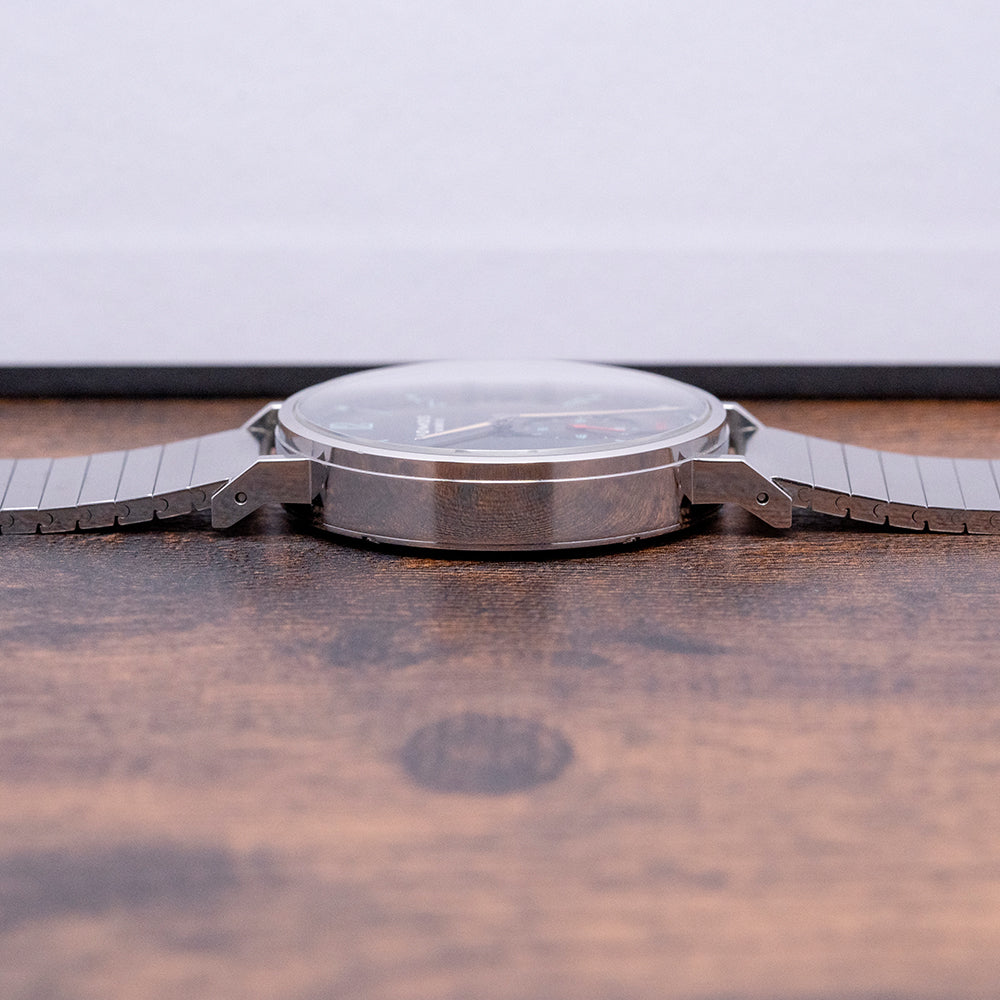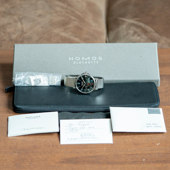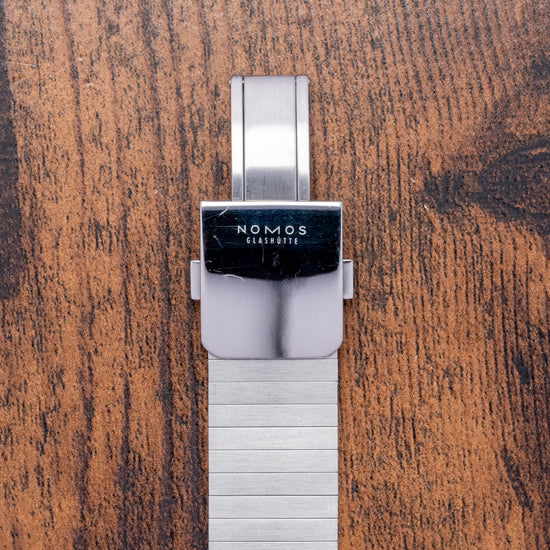 This watch is sold with its original NOMOS presentation box and paperwork. The watch is paired with its Nomos 20mm quick-release brushed stainless steel bracelet secured by a push button release signed folding clasp, all links are provided. The watch is from October 2020 and is sold in worn, but overall in fair condition. A full case and bracelet refurb can be provided on request at an additional cost. The watch comes with our 12-Months Warranty.