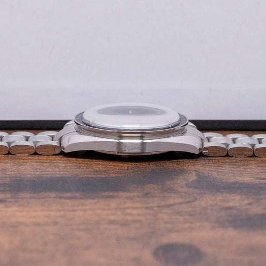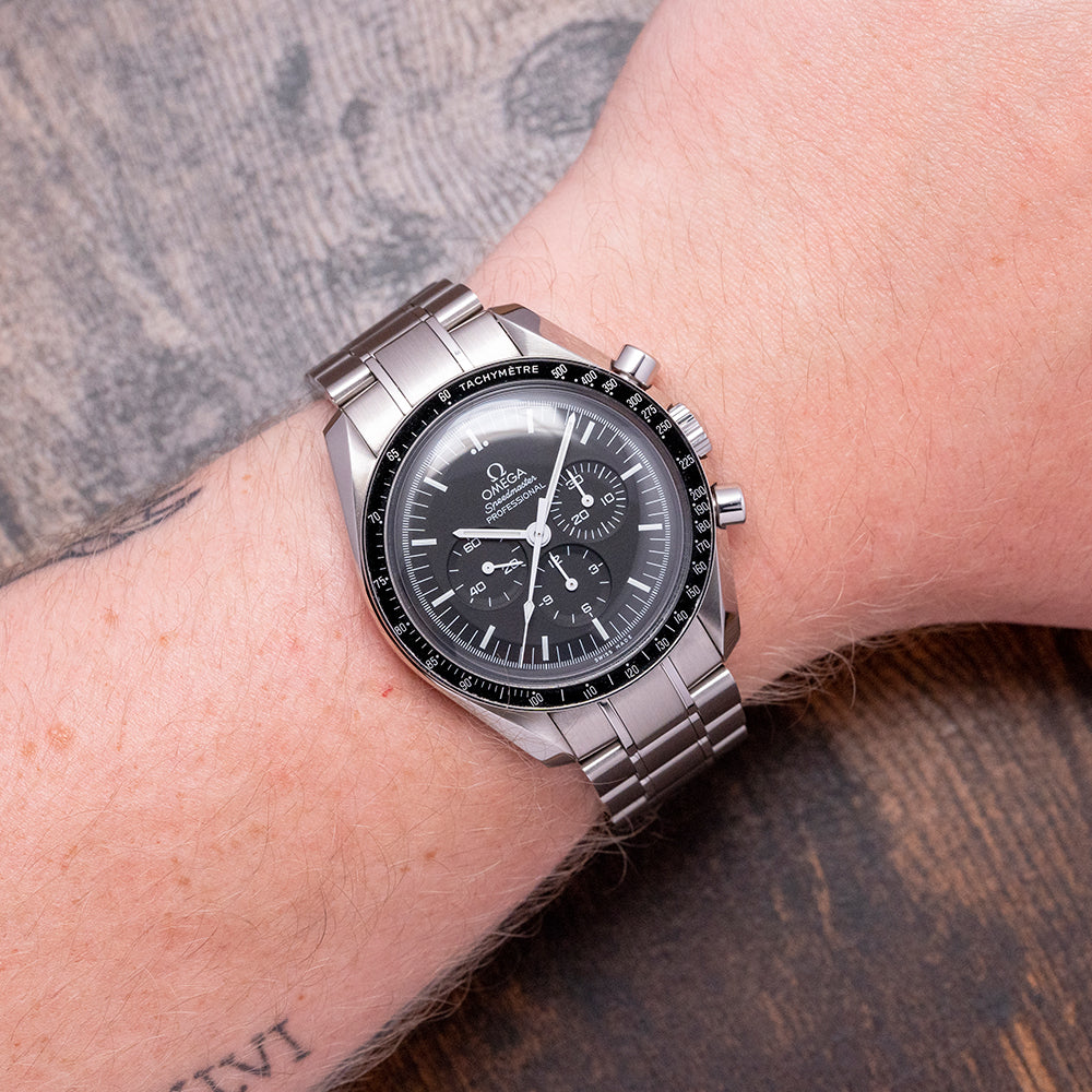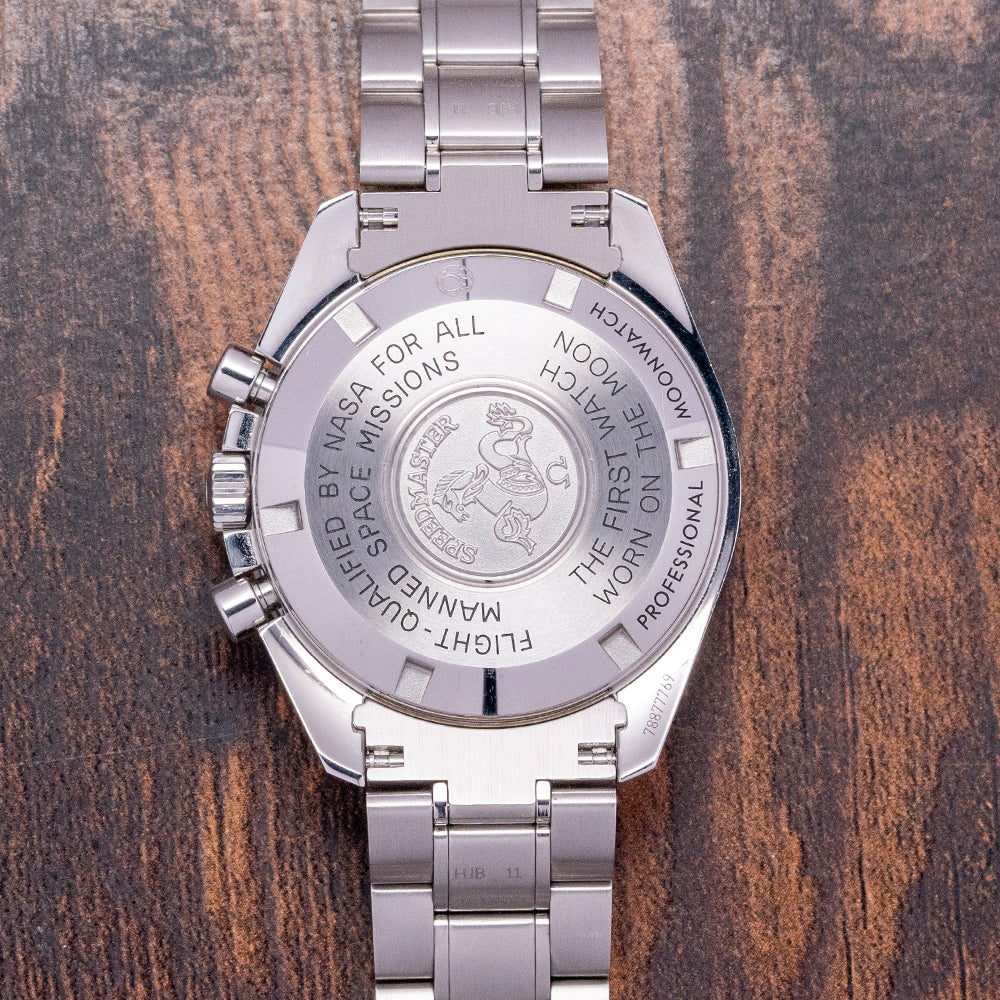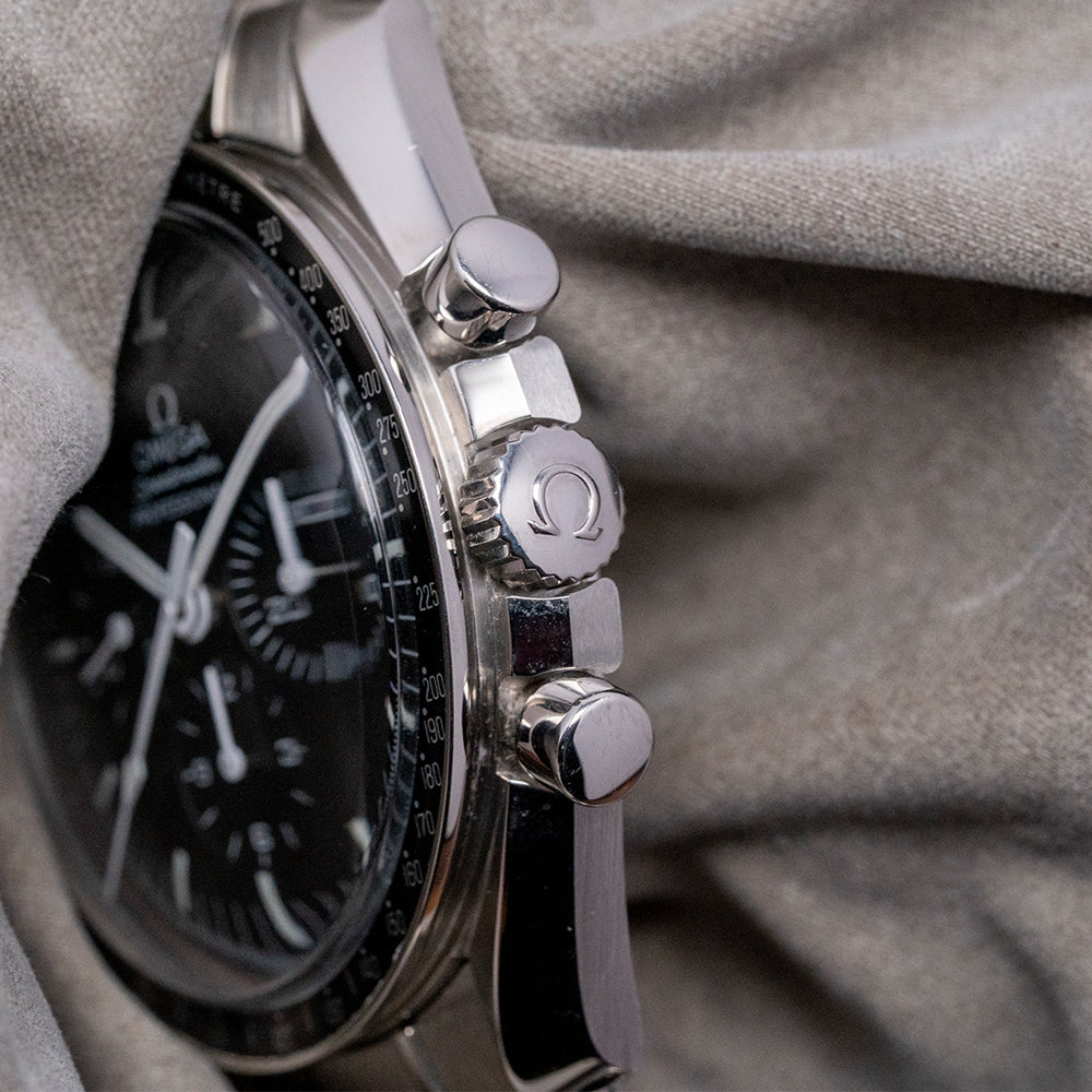 Here we have a 2020 Omega Speedmaster Professional Hesalite, now discontinued, the 42mm stainless steel case has polished and brushed surfaces that lead to characteristic twisted tapering lugs, the crisp lines transition effortlessly around the case, and a lug-to-lug length of 48mm and a case thickness of 14mm ensures a comfortable fit on the wrist. A fixed tachymeter sits on its black bezel. The dial is protected by Hesalite crystal, an outer minute track with slim baton indexes that mark the hours. Three deeply recessed Sub-dials are 60 seconds, 30 minutes, and 12 hours. Sword hands and an elegant, long central chronograph seconds hand that accurately hits the minute track, the dial has perfect symmetry. Hands and indexes are lumed with Super-Luminova. The screw-down case back is engraved with “Flight - Qualified By NASA for all Manned Space Missions” and “The First watch worn on the Moon”, which is a fitting testament to man's achievements in space. Inside, we have the Cal. 1861, 18 jewels, hand-wound chronograph beating at 21,600 bph, and it has a Rhodium-plated finish, as a manually wound movement, it is the direct descendant of the original moon watch that used the Cal. 361 movement. Fitted with a 20mm Omega Stainless Steel bracelet with a signed clasp, it fits the wrist comfortably, along with all the additions you would expect with a modern Speedmaster, including the original large box & papers, plus all accessories, minus the strap changing tool.