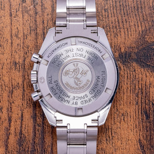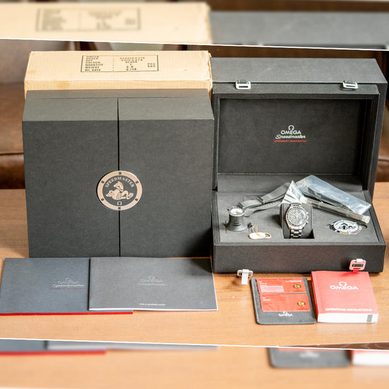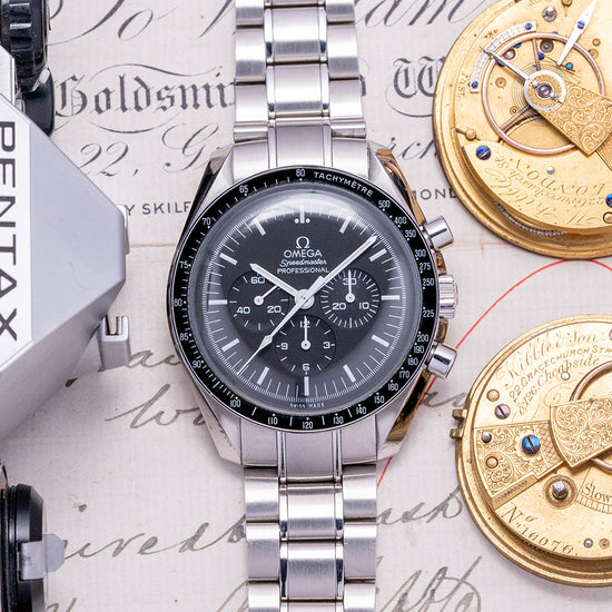 Here we have a 2020 Omega Speedmaster Professional Hesalite, now discontinued, the 42mm stainless steel case has polished and brushed surfaces that lead to characteristic twisted tapering lugs, the crisp lines transition effortlessly around the case, and a lug-to-lug length of 48mm and a case thickness of 14mm ensures a comfortable fit on the wrist. A fixed tachymeter sits on its black bezel. The dial is protected by Hesalite crystal, an outer minute track with slim baton indexes that mark the hours. Three deeply recessed Sub-dials are 60 seconds, 30 minutes, and 12 hours. Sword hands and an elegant long central chronograph seconds hand that accurately hits the minute track, the dial has perfect symmetry. Hands and indexes are lumed with Super-Luminova. The screw-down case back is engraved with “Flight - Qualified By NASA for all Manned Space Missions” and “The First watch worn on the Moon”, which is a fitting testament to man's achievements in space. Inside, we have the Cal. 1861, 18 jewels, hand-wound chronograph beating at 21,600 bph, and it has a Rhodium-plated finish, as a manually wound movement, it is the direct descendant of the original moon watch that used the Cal. 361 movement. Fitted with a 20mm Omega Stainless Steel bracelet with a signed clasp, it fits the wrist comfortably, along with all the additions you would expect with a modern Speedmaster, including the original large Box & Papers, plus all accessories.