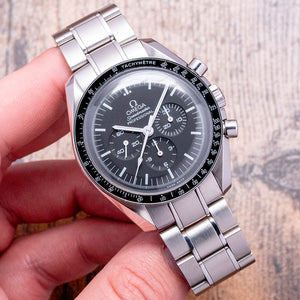 The classic Omega Speedmaster Professional with a hesalite crystal, this reference is the recently discontinued model featuring the calibre 1861, a workhorse movement, with the older generate bracelet which has more of a substantial feel on the wrist than the latest reference, it comes down to which you prefer personally. There is also the point of value, these references are some of the best value Speedmaster Professionals you can buy, especially with how much higher the RRP on the latest reference has gone, so snap this one up today and add it to your collection!