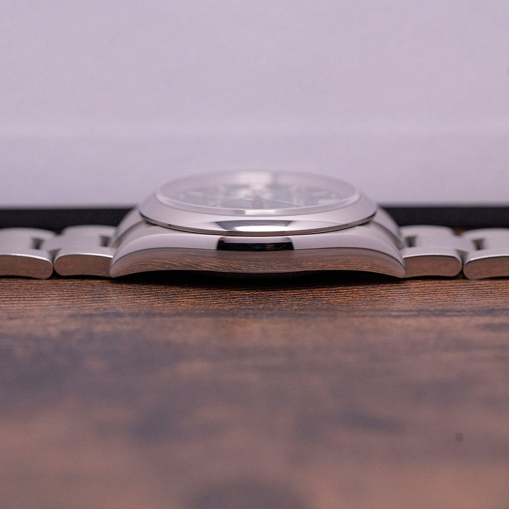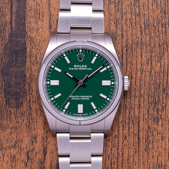 Here we have a 2020 Rolex Oyster Perpetual Green Dial 126000 with a 36mm OysterSteel case that gently curves over your wrist with finely tapered lugs, a lug-to-lug length of 43mm and a case thickness of 11mm giving the watch an impressive wrist presence. Brushed and polished surfaces transition with crisp lines. On the right side a signed screw-down Twinlock crown, the smooth polished bezel holds a sapphire crystal above a striking Rolex OP Green dial made up of six layers of lacquer for a perfect finish, around the outer flange, we have the engraved repeating Rolex rehaut. An outer minute track is precisely executed and applied double and single baton indexes are filled with Chromalight which is a Rolex proprietary luminance marking the hours, slender steel baton hands have Chromalight infill and are complemented by a tapered sweeping second hand, at 12 o’clock we have the applied Rolex crown printed underneath “Rolex Oyster Perpetual” and at 6 o’clock “Superlative Chronometer Officially Certified” completes this elegant timepiece. On the reverse, a coin-edged case back, inside an automatic Rolex Cal. 3230, 31 jewels, beating at 28,800 beats per hour, this COSC Certified movement was launched in 2020 and has a Chronergy escapement patented by Rolex which provides efficiency and reliability, it is resistant to shock and magnetic fields. The watch comes fitted on its Rolex 20mm OysterSteel bracelet, with a folding Oyster clasp and Easylink 5mm extension link, all links are provided, and the watch comes with its Rolex presentation box, paperwork and swing tags.