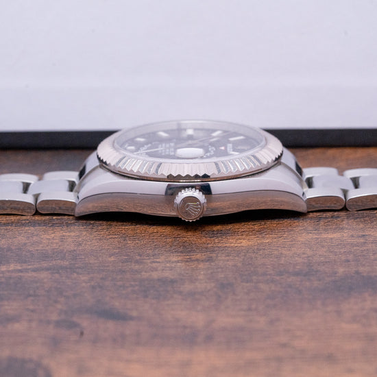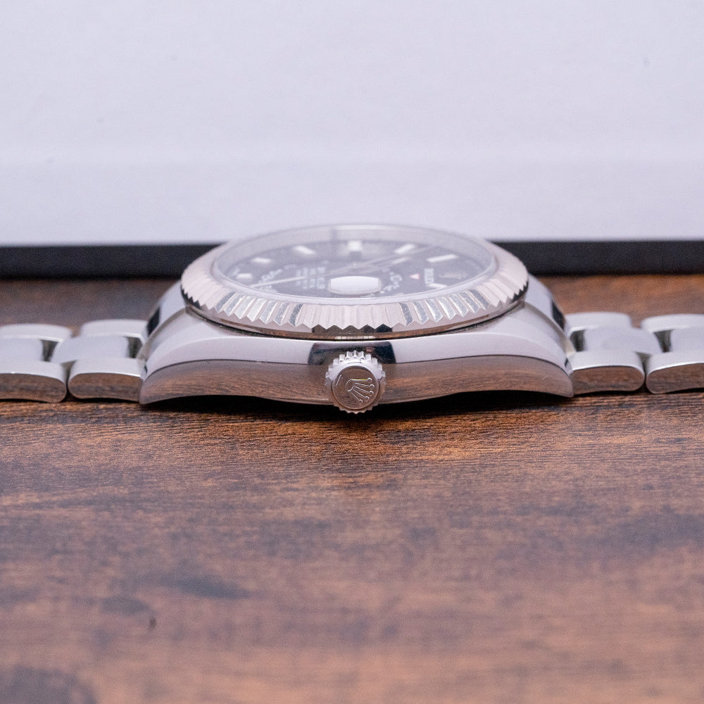 Here we have a 2020 Rolex Sky-Dweller Black on Oyster Bracelet 326934 introduced in 2012 it is one of their most complicated timepieces, the 42mm Oystersteel case has a curve that floats over your wrist with a lug-to-lug length of 50mm and a case thickness of 14mm, giving the watch an impressive wrist presence. Polished and brushed surfaces transition with crisp edges, and on the right side is a signed screw-down crown. The White Gold Fluted Ring Command Bezel rotates to three positions depending on whether you want to change the date, local time or second-time zone, all with the crown in its first-notch position. Position 1 is for setting the Month and Date, Position 2 is used for setting the local time and Position 3 is used for setting the GMT disc. Remember to set the GMT before setting your local time. A flat sapphire crystal sits above the striking black dial, this combination of steel and white gold is called Rolesor which Rolex has trademarked since 1933. An outer Rolex Rehaut surrounds a minute track with lume plots, applied disc and baton indexes are filled with Chromalight luminance, and at 3 o’clock a Saros annual calendar date window with cyclops magnification, this clever system allows the wearer to only need to adjust once a year at the end of February which has either 28 or 29 days. An off-centre 24-hour disc has a red inverted triangle, perfect for when travelling. The red rectangle indicates the Month. The Baton's hands are also filled with Chromalight complemented by a tapered sweeping second hand. At 12 o’clock an applied Rolex coronet with the text precisely executed underneath, at 6 o’clock we have “Sky-Dweller Oyster Perpetual” followed by “Superlative Chronometer Officially Certified”. On the reverse, a coined-edged screw-down case back, inside an automatic Rolex Cal. 9001, 40 jewels, 28,800 beats per hour, this precision movement is based on their Rolex 3135 and is Swiss Official Chronometer Testing Institute (COSC) Certified. The watch comes fitted on its 20mm Rolex Oyster bracelet with a signed flip-lock Oysterclasp, and the watch also comes with its Rolex presentation box, swing tag and papers.