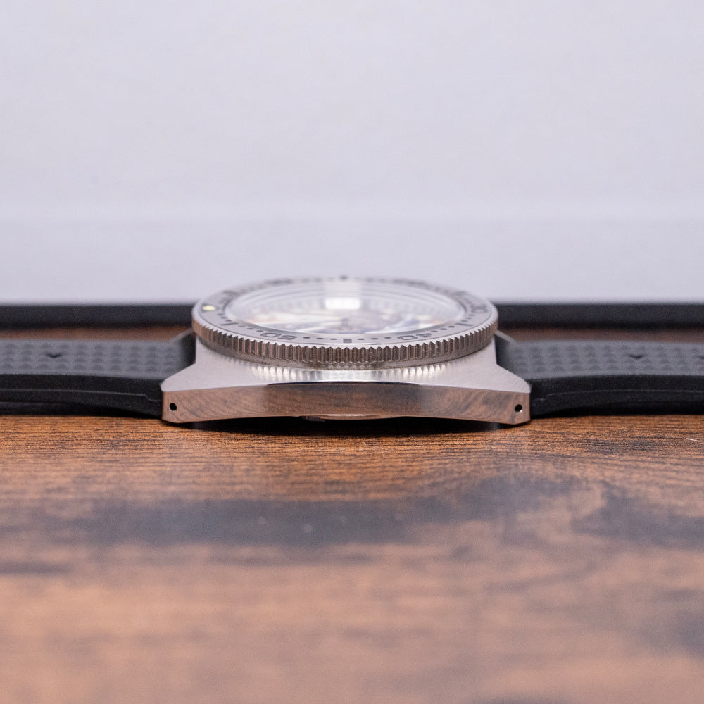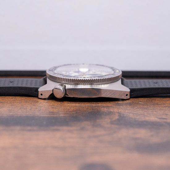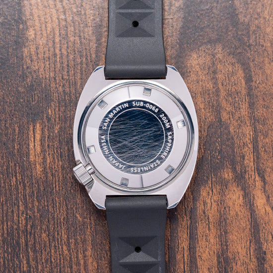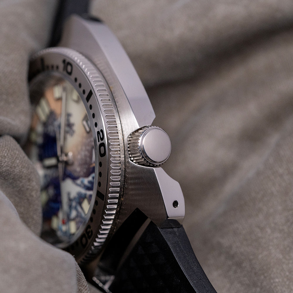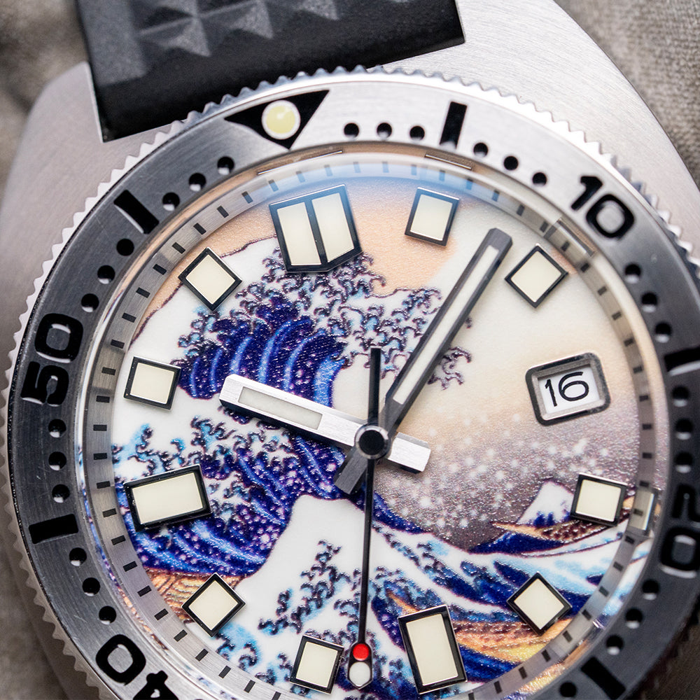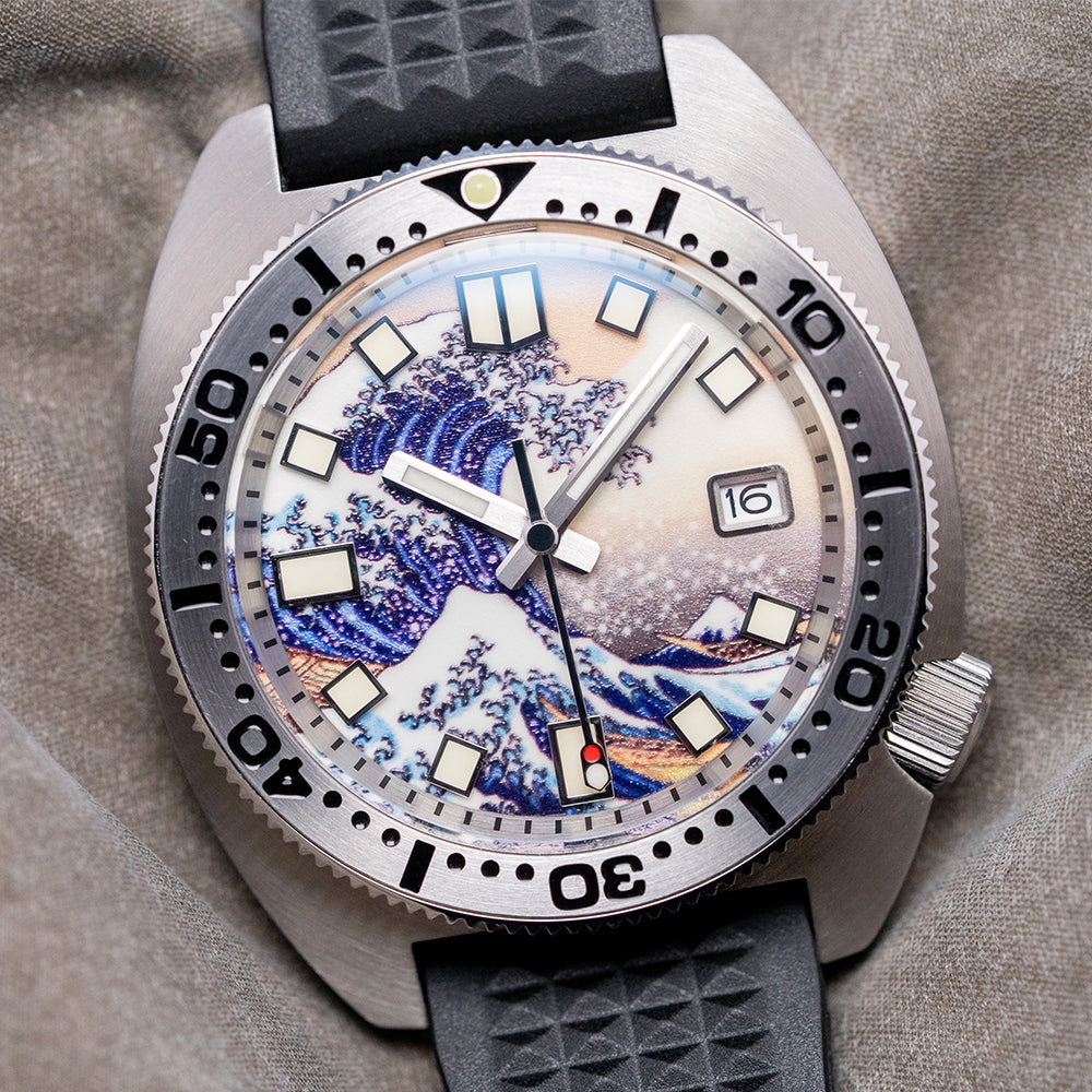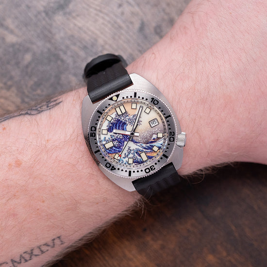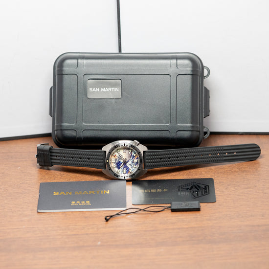 Here we have a 2020 San Martin '6105 Turtle' Full Lume Wave SN0068G inspired by the classic Seiko 6105 Turtle but with a typical San Martin twist. Featuring a 42mm brushed and polished Turtle-shaped stainless steel case that curves over your wrist with flat-ended drilled lugs. Its curvaceous flanks lead to a comfortable lug-to-lug length of 48mm and a case thickness of 13mm. On the right side, at 4 o’clock, a screw-down crown. The stainless steel bezel features a saw tooth edge for grip and a stainless steel insert with an engraved 60-minute scale painted in black. A domed sapphire crystal, AR-coated dial sits above a striking 3D-printed, full-luminance Kanagawa surfing wave. An outer minute chapter ring surrounds the applied square and baton indexes, filled with C3 Super-LumiNova, which mark the hours. At 3 o’clock, a framed date window. Steel baton hands filled with C3 Super-LumiNova are complemented by its distinctive ‘stoplight’ counterweight sweeping second hand. On the reverse, a screw-down solid case back, engraved with the watch details and inside an automatic Seiko Cal. NH35A, 24 jewels, beating at 21,600 beats per hour. It comes paired with its 20mm Tropic style rubber strap and pin buckle. This watch is sold with its original San Martin box, swing tag and paperwork.