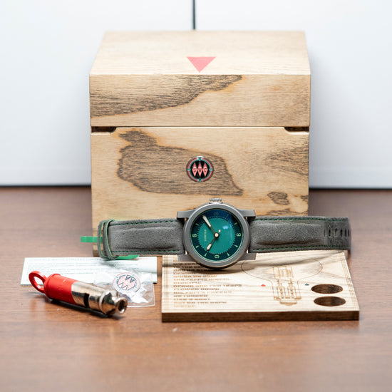 Here we have a 2020 Schofield Strange Lights Not Quite Green with a 44mm Titanium case. The watch comes in two colours, Not Quite Red and this one, both of which are limited to 29 pieces. They celebrate 10 years of his watchmaking. Its industrial design adds character and uniqueness to the watch. Sloping wide screw-in lugs with a lug-to-lug length of 52.5mm and a thickness of 15mm give the watch an impressive wrist presence. On the right side, a deeply knurled double o-ring pull-out crown with a gold ring. A deep engraving SWC SL-1 (Schofield Watch Company Strange Lights 1) can be found on its side. A smooth bezel holds a flat sapphire crystal AR-coated in nine layers. An outer ring in green was made of a specially commissioned custom SuperLumiNova. The sector dial has an outer Not Quite Green ring with applied numeral and dagger indexes marking the hours coated in C3 SuperLumiNova. An inner minute track surrounds its paler Not Quite Green centre, providing a nice contrast. Brushed gilt-edged skeletonised sword hands have Super LumiNova tips. In the centre, the cap has a lollipop balance which they call “Sign-of-Life” second hand. At 12 o’clock, the Schofield logo. On the reverse, a screw-down case back. The intricate engraving is a stylised 1950s UFO hovering above Smeaton’s Tower in Plymouth, which also featured on Schofield's first watch, Signalman. Inside an automatic ETA 2824-2, gold-plated and highly finished. The watch comes fitted with its 24mm Schofield light grey strap and a signed Green ceramic-coated steel buckle. Comes with its Schofield presentation box and papers.