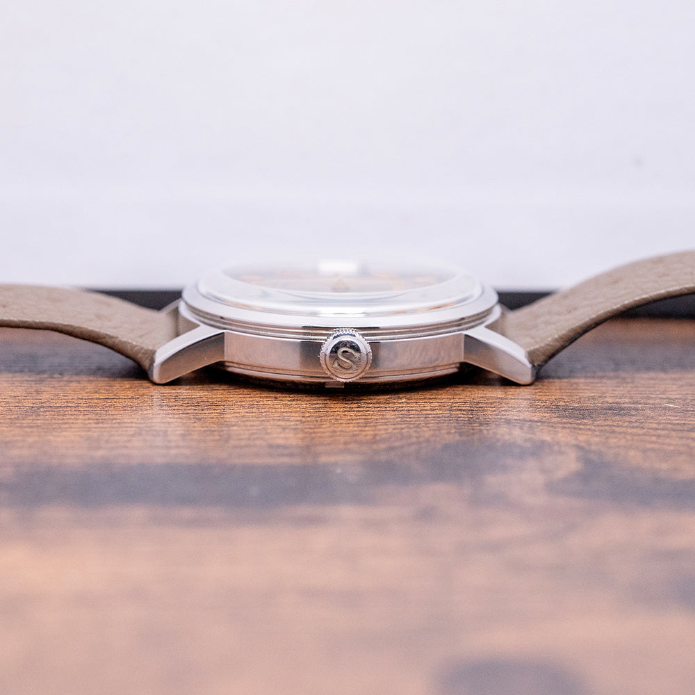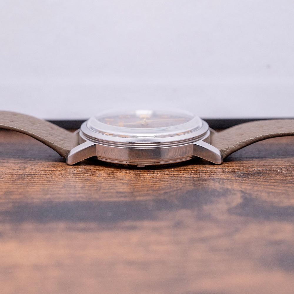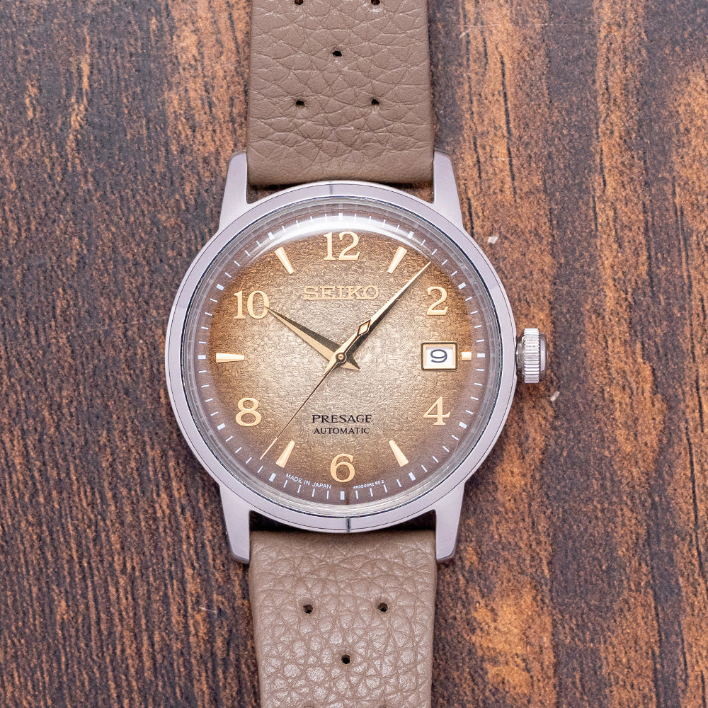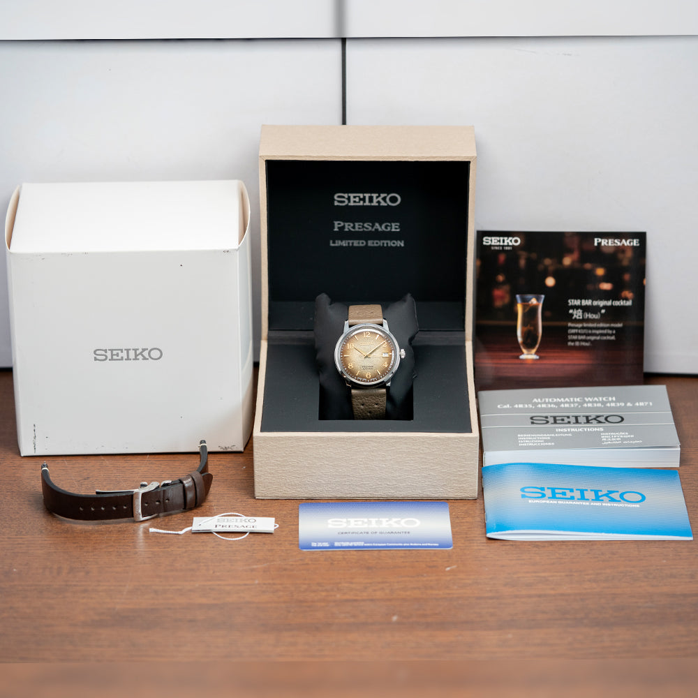 Here we have a classic 2020 Seiko Presage Cocktail Time 'Hojicha' Limited SRPF43J1 Limited Edition of 7000 pieces. Inspired by the two favourite leaf tea cocktails made by Mr Kishi at the Kyoto Star bar. Its curvaceous 38.5mm polished stainless steel case has straight flat-ended lugs. The curved, polished flanks lead to a lug-to-lug length of 44.5mm and a case thickness of 11.5mm, ensuring a comfortable fit on your wrist. On the right side, there is a coin-edged signed crown. Its stepped polished bezel holds a domed Hardlex crystal above the stunning texture brown fumé dial, capturing the colourful light and dark brown notes of the 'Hojicha' leaf tea, an outer minute track surrounds applied golden Arabic numerals and facet edged indexes marking the hours, at 3 o’clock a framed date window, elegant golden Dauphine hands are complemented by a diamond shaped counterweighted tapered sweeping second hand, at noon we have a golden applied ‘Seiko’ and at 6 o’clock printed in black ‘Presage Automatic’ completes this cocktail infused dress watch. On the reverse, a screw-down exhibition case back etched with the details of the watch around its edge, inside an automatic Seiko Cal. 4R35, 24 jewels, 21,600 beats per hour; the movement features hand-winding and hacking for your convenience. It comes paired with two 20mm straps. This watch is sold with its original Seiko box, swing tag and paperwork.