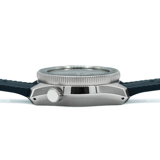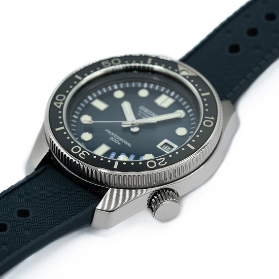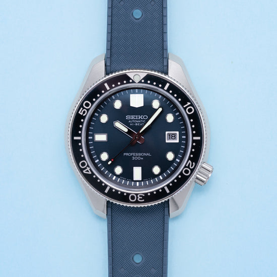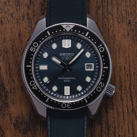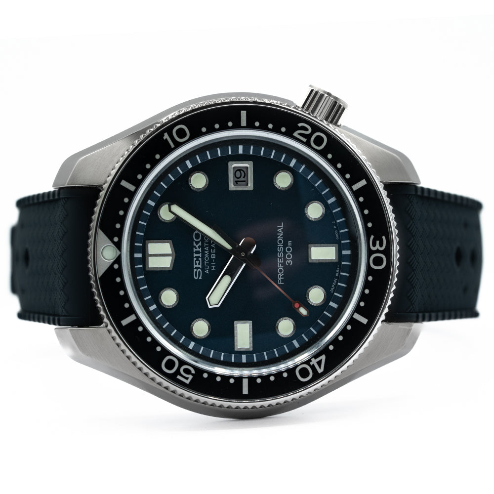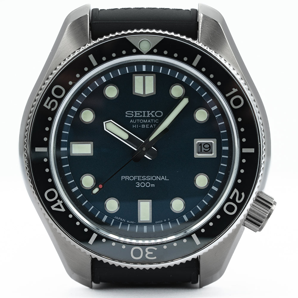 This 2020 Seiko Prospex 55th Anniversary Hi-Beat SLA039J1 celebrates 55 year Anniversary of Seikos 1968 Hi-Beat professional dive watch the ref: Ref. 6159-7001. This watch is a modern interpretation of that "Professional" dive watch. A 45mm brushed and zaratsu polished angular stainless steel monobloc case coated in Seiko’s Diashield super-hard coating. To get to the movement you have to go in from the crystal side. The case shape sits on the wrist like a cushion, Seiko gets ergonomics so right. A lug to lug length of 51mm and a thickness of 15.5mm gives the watch an impressive wrist presence. Chamfered polished edges lead the eye towards the broad drilled lugs. On the right side at 4 o’clock a screw-down crown with the Prospex logo stamped into it. The unidirectional bezel has a glossy black insert with a 60 minutes scale in silver numerals. A flat sapphire crystal AR coated sits above a sunburst deep blue dial. An outer minute chapter ring with applied disc and oblong indexes outlined in stainless steel coated in LumiBrite marks the hours. At 3 o’clock a framed date window. Broad sword hands expertly brushed are coated in LumiBrite complemented by a lume tipped sweeping seconds hand. Text is applied to the dial with HI-Beat and Professional precisely printed on it. On the reverse, the Seiko horseshow with the specification of the watch engraved into it. Seiko is deeply engraved in the center with the number out of 1100 underneath. Inside an Automatic Hi-Beat Seiko Cal. 8L55, 37 jewels, 36,000 beats per hour. The movement has hand winding and hacking functionality for your convenience. Based on the Grand Seiko caliber 9S85 it is hand-assembled at the Shizuku-Ishi Watch Studio in Morioka. The watch comes fitted on a Seiko 19mm matte blue silicone strap with a signed buckle. The watch comes with its Seiko presentation box and papers.