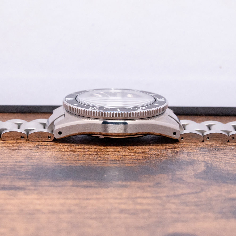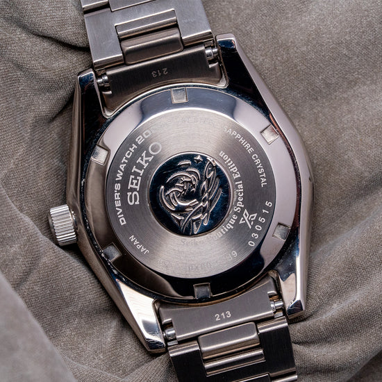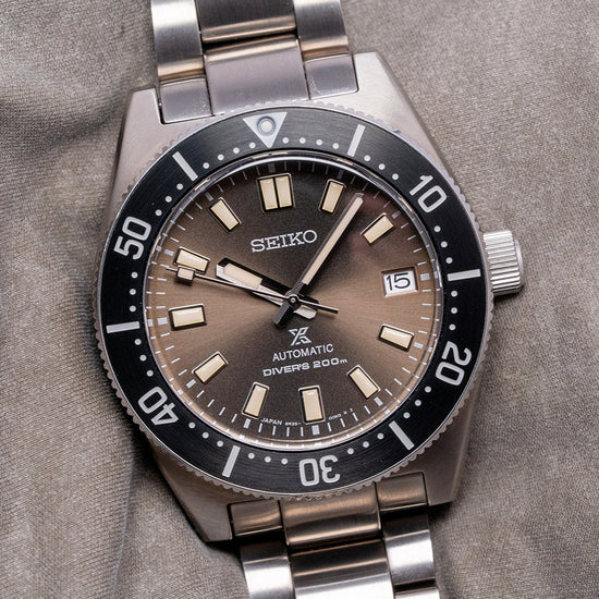 This 2020 Seiko Prospex Boutique Special Edition SPB145J1 is inspired by Seiko's 1968 Hi-Beat professional dive watch, the ref: 6159-7001. This watch is a modern interpretation of that "Professional" dive watch and is exclusive to the Seiko Boutique. A 40.5mm brushed and facet-polished angular stainless steel case is coated in Seiko’s Diashield super-hard coating. The case shape sits on the wrist like a cushion. Seiko gets ergonomics so right. A lug-to-lug length of 47mm and a thickness of 13mm give the watch an impressive wrist presence. The facet-polished edges lead the eye towards the broad, drilled, flat-ended lugs. On the right side at 4 o’clock, a screw-down crown. The 120-click unidirectional bezel has a knurled edge for grip and a black insert with a deep-engraved 60-minute scale in white numerals and markings. A domed sapphire crystal AR-coated on the inside sits above a stunning sunburst brown/grey dial. An outer minute chapter ring with applied disc and baton indexes are filled in LumiBrite, marking the hours. At 3 o’clock, a date window. Facet-edged, broad hands are filled in LumiBrite, complemented by a lume-tipped sweeping seconds hand. The text is printed on the dial with a Seiko motif, Prospex logo, and "Automatic Diver’s 200m," completing this modern, vintage-inspired dive watch. On the reverse, a screw-down solid case back is etched with the watch's specifications. Embossed in the centre is the characteristic Seiko Tsunami. Inside an automatic Seiko Cal. 6R35, 24 jewels, 21,600 beats per hour. This workhorse movement has hacking and hand-winding for your convenience. It comes with its original Seiko 20mm stainless steel bracelet, featuring brushed surfaces and polished edges, complete with a Seiko folding clasp, dive extension, and flip-lock; all links are included. The watch comes with its Seiko presentation box, swing tag and papers.