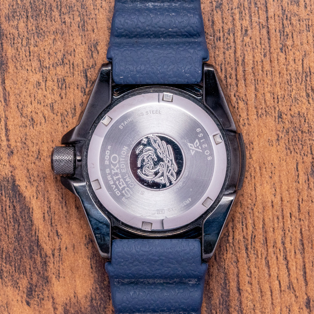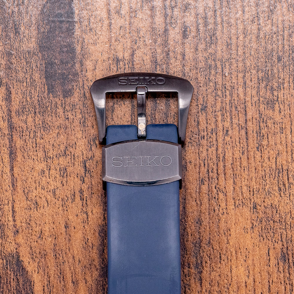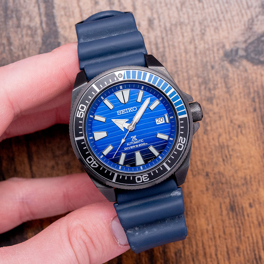 Here we have the distinctive 2020 Seiko Prospex Samurai Automatic Black & Blue SRPD09. As part of the Save the Ocean range, Seiko gave a portion of the proceeds from the original sale to Fabien Cousteau’s Ocean Learning Centre, a non-profit organisation dedicated to learning and marine conservation. The 43.5mm stainless steel cushion case has a gunmetal hardened coating and the characteristic aggressively angled sides and lugs that curve over your wrist for that comfortable fit. On the right side, a protected screw-down crown with knurling for extra grip. A knurled-edged bezel has a dive insert (with the first 15 minutes of the countdown bezel picked out in blue). On the right side, is a screw-down crown. Protected by the dive bezel, its flat Hardlex crystal is a specially hardened mineral glass manufactured by Seiko. A blue outer minute chapter ring surrounds a graduated black and blue dial that has a gradient from light to dark, just like the ocean depths, a nice touch. Horizontal lines highlight this gradient and catch the light in an interesting way. The applied indexes are broad and coated in LumiBrite. At 3 o’clock, a date window. The arrow hands, when in the 12 o'clock position, they resemble a rocket and are coated in LumiBrite and have a sweeping second hand. On the reverse, a screw-down case back with the Seiko tsunami wave embossed in the centre, inside an automatic Seiko 4R35, 23 jewels, 21,600 beats per hour, this workhorse movement has hacking seconds and hand winding for your convenience. It comes paired with its original Seiko 22mm blue silicon strap and signed pin buckle, and it comes with its Seiko presentation box, swing tag and papers.