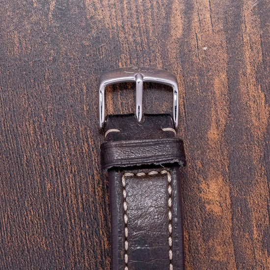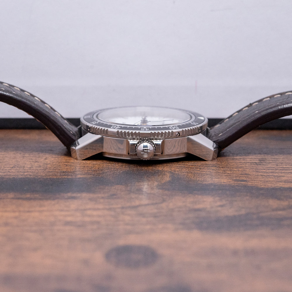 Here we have a 2020 Sinn 104 St Sa I W White Automatic, which has become the signature watch for Sinn. Its polished 40mm stainless steel case has a very comfortable lug-to-lug length of 47mm and a case thickness of 11.5mm. A screw-down crown sits on the right side, protected by shoulders, and a bi-directional Pilots' bezel with a black aluminium 60-minute countdown insert. Sapphire crystal AR coated on both sides protects a crisp white dial, an outer minute track precisely executed with black outlined hourly baton markers filled in Super LumiNova clearly indicates the hours, and a day-date window sits at 3 o’clock. Syringe hands with Super-LumiNova infill are complemented by an arrow point sweeping second hand, and at 12 o’clock we have the Sinn motif with “Automatic'' printed at 6 o’clock to complete this highly legible pilot's watch. On the back, we have a screw-down exhibition case back, inside an automatic Sellita Cal. SW-220-1, 26 jewels, and 28,800 beats per hour. It comes paired with its Sinn 20mm vintage style leather strap and a signed buckle, and the watch comes with its spring bar removal tool and paperwork.