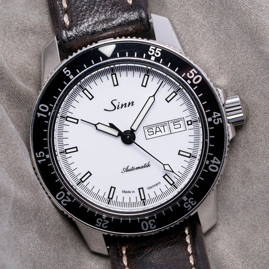 The Sinn 104 has become a classic for collectors, and with good reason; the build quality, fit and finish, and proportions are all undeniable for the money. This is the less-seen white dial with the black bezel, a perfect contrast, especially with the black surrounding indices and hands. If you are in the market for one of these, I would snap it up while you can!