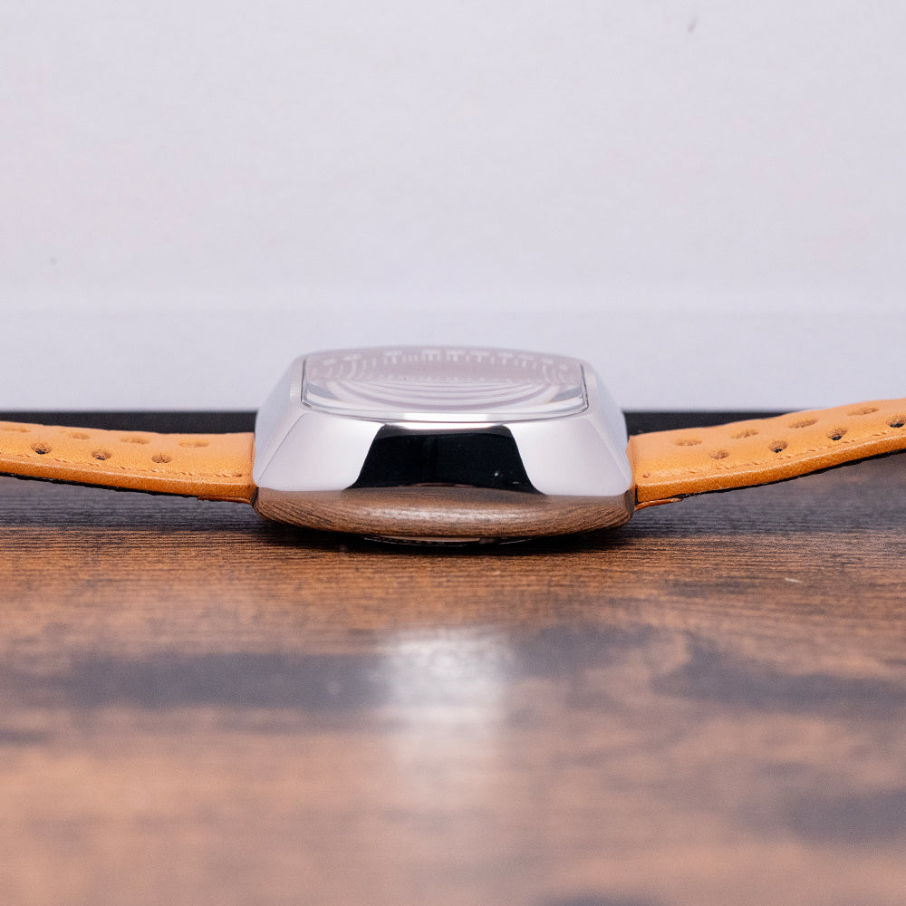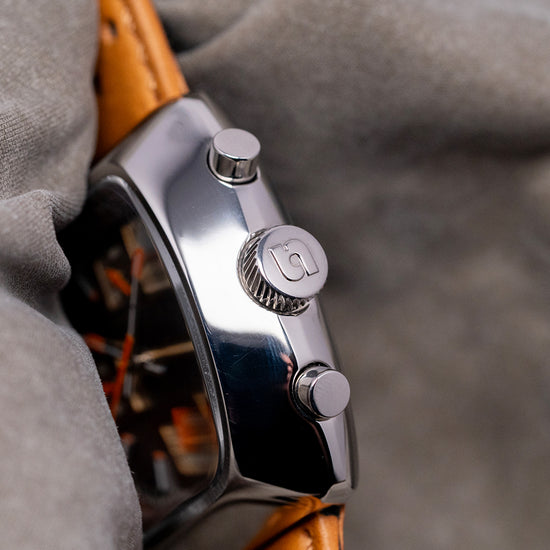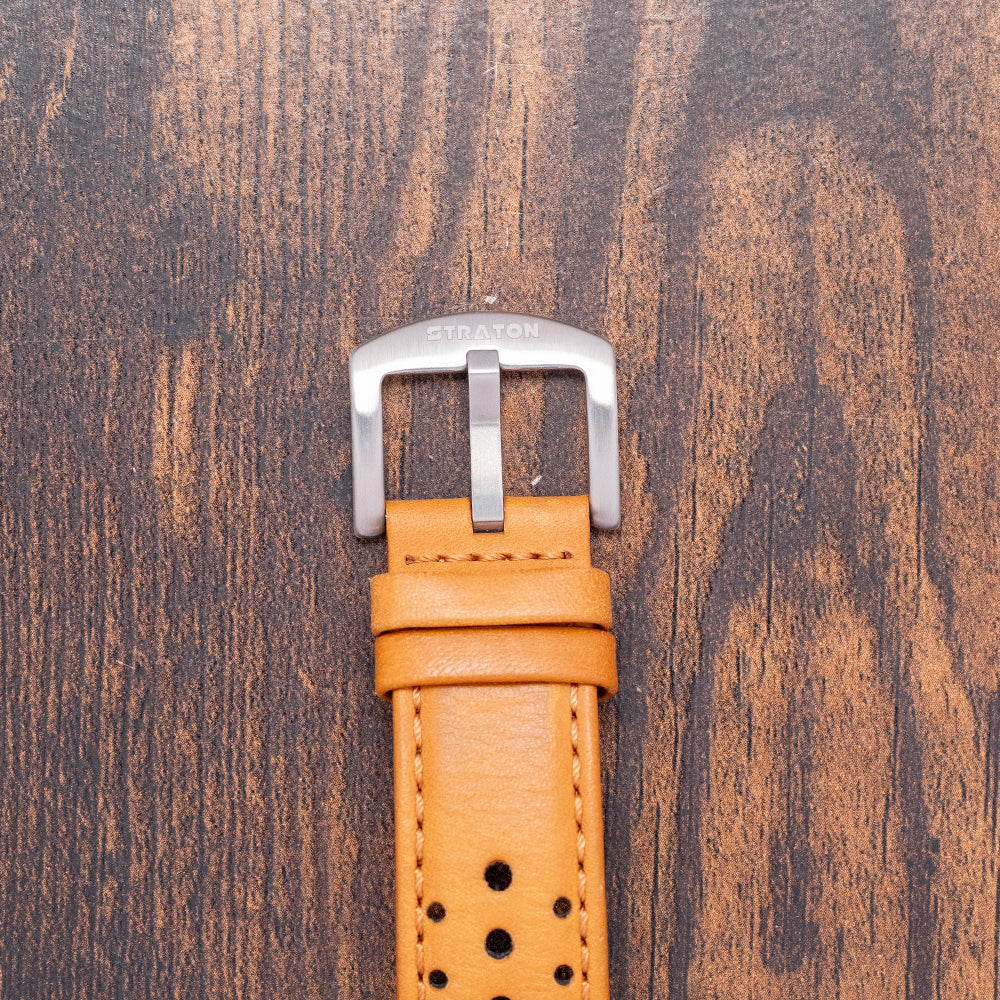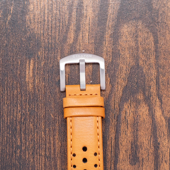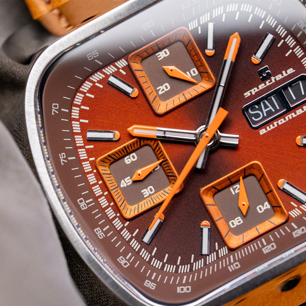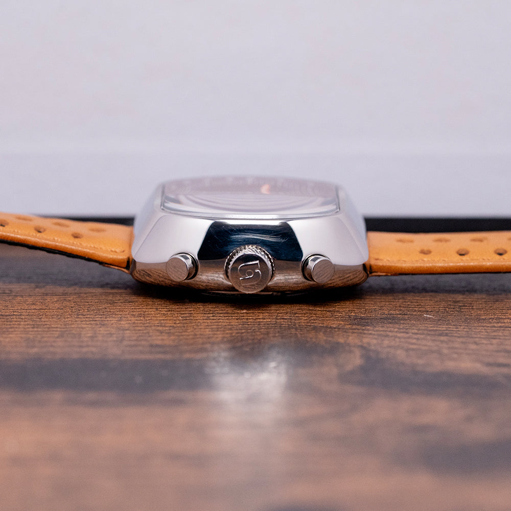 Here we have a 2020 Straton Speciale Chronograph Automatic Brown featuring a 42mm TV-shaped stainless steel case with a clear DLC coating for scratch resistance. The high sloping sides perfectly envelop the lugs. A lug-to-lug length of 41mm and a thickness of 15.5mm give the watch an impressive wrist presence. Down the right side, we have the recessed chronograph pushers and a signed crown with deep knurling for extra grip. A domed sapphire crystal sits above the rich sunburst-brown dial, whose intensity changes as you rotate your wrist. The deep-sloping outer Tachymeter chapter ring in chocolate brown draws the eye to the centre of the dial. The inner minute track is precisely printed with applied baton indexes coated in Super Luminova with orange pips to mark the hours. At 12 o’clock, a 30-minute register; at 9 o’clock, a running seconds register; and finally, at 6 o’clock, a 12-hour register, each with the same raised orange frame, adding depth to this striking dial. At 3 o'clock, a framed day/date window. Long sword hands are coated in Super-Luminova and tipped in orange, complemented by an orange chronograph hand that matches the other hands on the registers. Its use of colour and the placement of the registers make it stand out from the crowd of 1970s-inspired chronographs. On the reverse, a screw-down case back with an interesting speedometer embossed into it. Inside an Automatic Valjoux Cal. 7750, 25 jewels, beating at 28,800 beats per hour. It comes paired with its Straton 22mm leather sports strap and pin buckle. This watch is sold with its original Straton box and paperwork.