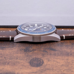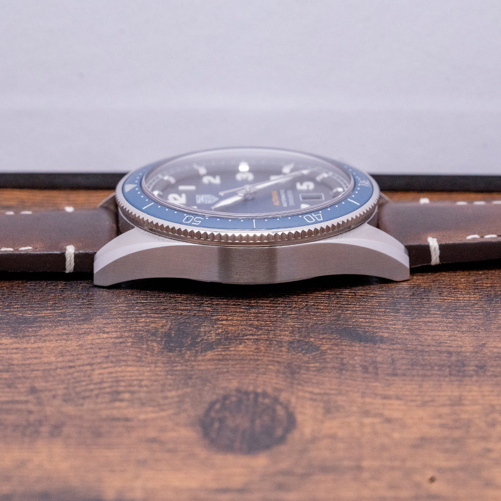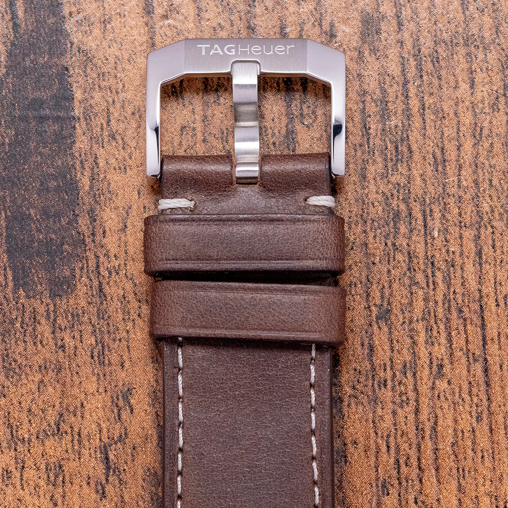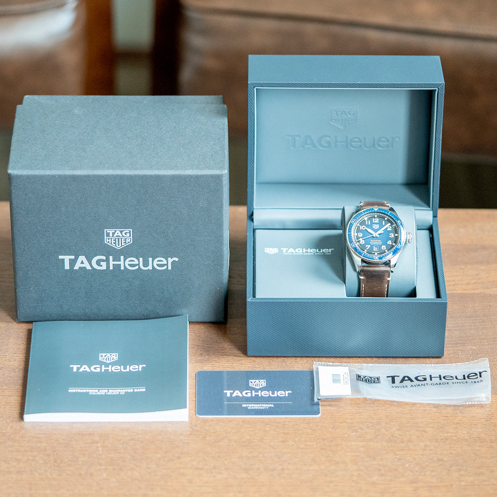 Here we have a 2020 TAG Heuer Autavia Blue Calibre 5 Chronometer WBE5116.FC8266, now discontinued, captures the flare of a vintage pilot watch with a modern twist. The 42mm polished and brushed stainless steel case curves over your wrist with tapered lugs, and a lug-to-lug length of 50mm and a case thickness of 12.5mm give the watch an impressive wrist presence. On the right side is a signed crown. The bidirectional blue bezel is made from ceramic with deeply engraved numerals. A domed sapphire crystal sits above a striking blue “orange peel” textured dial. The raised outer minute chapter ring surrounds applied bevel-edged hour markers. 3D Arabic numeral indexes in moulded thick SuperLumiNova mark the hours and add dimension and interest to the dial. At 6 o’clock, a framed date window. Thick sword hands coated in SuperLumiNova complemented by a sweeping second hand. The TAG Heuer motif is applied at noon with an orange “Autavia” at 6 o’clock, adding a splash of colour. Finally, underneath, we have an “Automatic Chronometer”. On the reverse, a screw-down case back with an engraved propeller inside a steering wheel highlights the “Autavia” relationship in aviation and automobile history. Inside an Automatic COSC TAG Cal. 5, a movement based on either ETA 2824-2 or Sellita SW200-1. The watch comes fitted on its original 21mm TAG Heuer brown vintage style thick leather strap with a signed buckle and comes with its original presentation box, papers and Chronometer certificate.