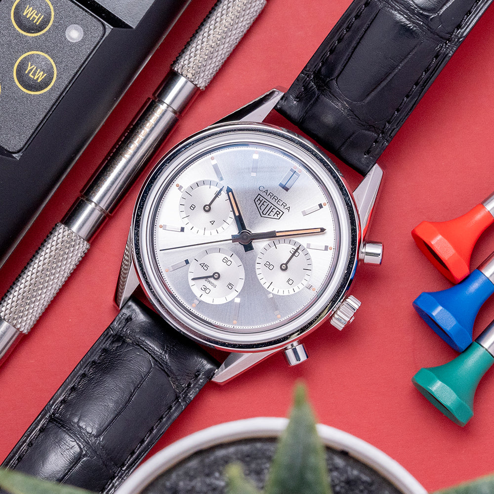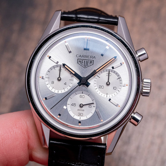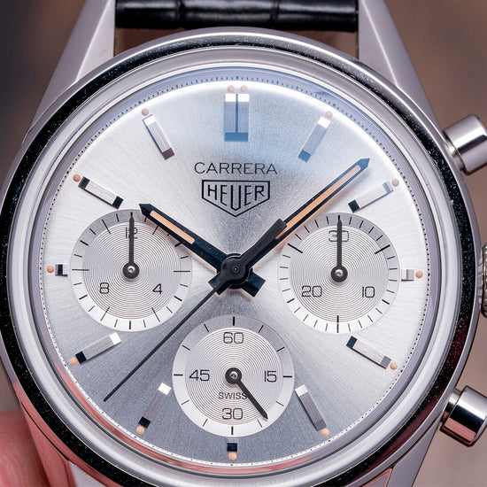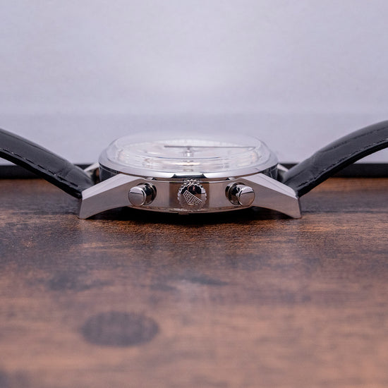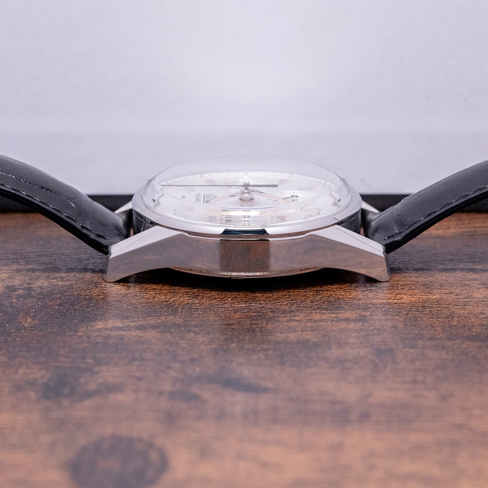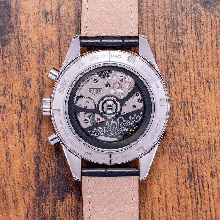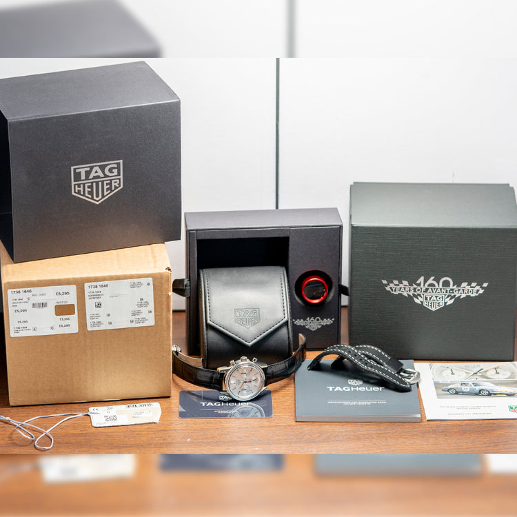 Here we have a 2020 TAG Heuer Carrera 160 Years Anniversary, One of 1,860 pieces with a 39mm polished stainless steel case that curves over your wrist with finely chamfered tapered flat-ended lugs, a lug-to-lug length of 47mm and a case thickness of 14mm ensure a comfortable fit. Down the right side, we have the piston chronograph pushers and a signed crown in the centre; a smooth polished bezel holds a domed sapphire crystal above a striking sunburst silver dial. An outer minute chapter ring surrounds applied steel batons chamfered top and bottom with lume pips marking the hours; at 3 o’clock, a recessed 30-minute register; at 6 o’clock, continuous seconds register and finally, at 9 o’clock, a 12-hour register; each with a concentric circular pattern and precisely marked. Slender steel baton hands are infilled with SuperLumiNova and complemented by a black tapered chronograph hand. At 12 o’clock, we have the Carrera Heuer motif, which completes this vintage-inspired chronograph. On the reverse, a screw-down exhibition case back showcasing the automatic TAG Heuer Cal. HEUER02, 33 jewels, beating at 28,800 beats per hour, this column wheel movement has a skeletonised rotor and is based on the original 1969 CH80 plans and is made up of 168 components. It comes paired with its 19mm black Tag Heuer leather strap with a signed “Heuer'' folded clasp, plus an additional 19mm strap in the box and the watch comes with its Tag Heuer presentation box, travel case, swing tag and paperwork.