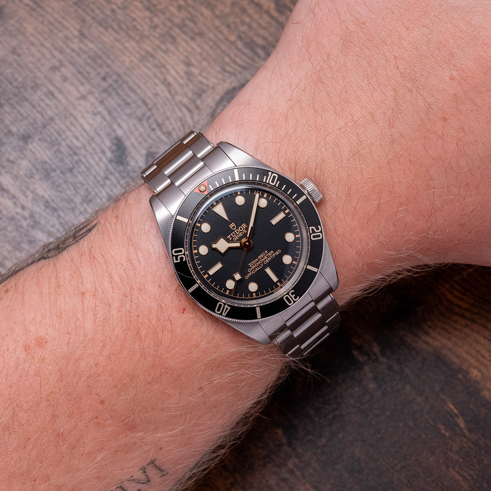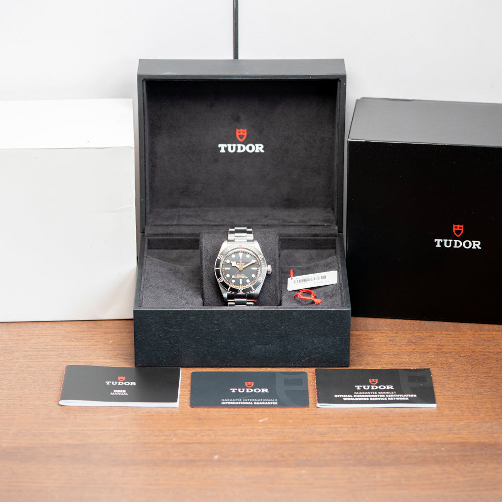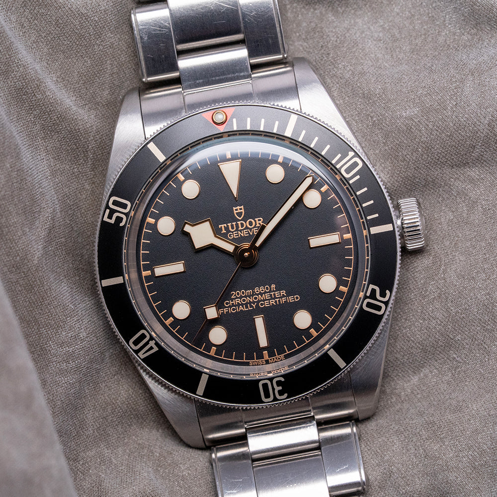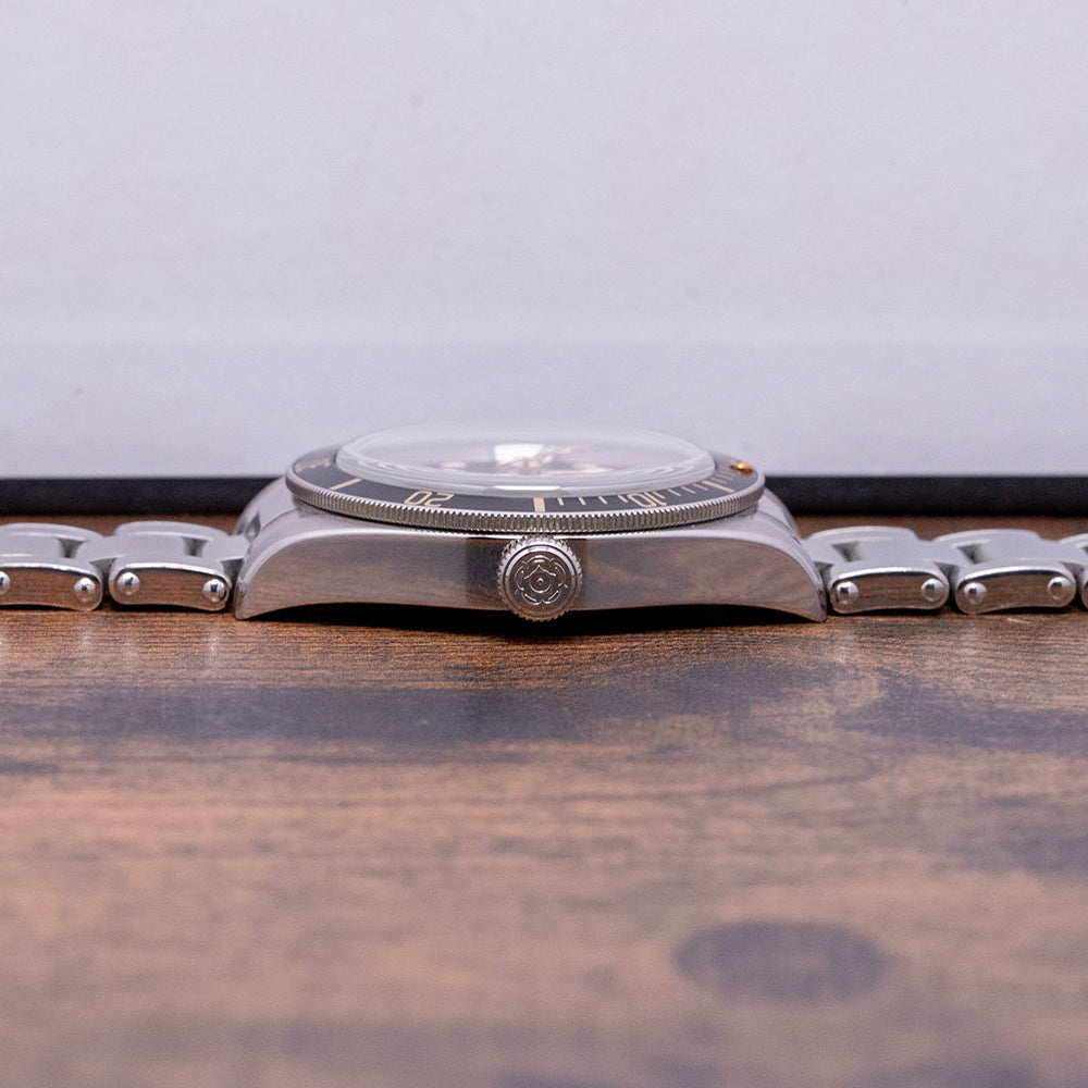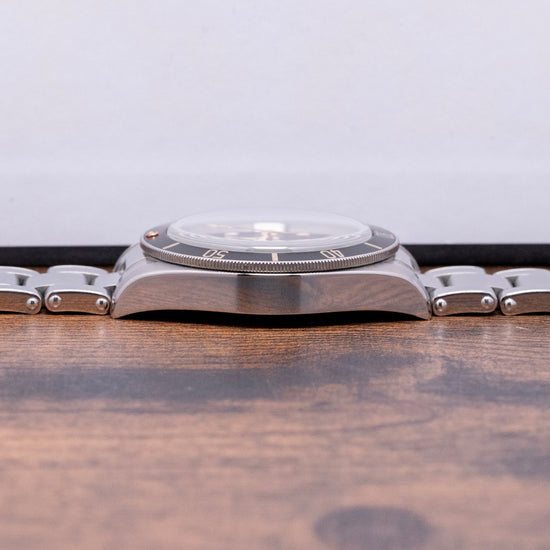 Here we have a 2020 Tudor Black Bay 58 Black on Bracelet 79030N that pays tribute to their first divers; introduced in 1958, the Ref 7924 had a 39mm case and a big crown that achieved 200m water resistance, which was some achievement back then. A 39mm stainless steel case features polished and satin finishes, with the curve of the case tapering towards the lugs. The lug-to-lug length measures 47.5mm, and the case thickness is 12mm, providing the watch with an impressive wrist presence. On the right side is a screw-down signed crown, unidirectional dive bezel with 60-minute numerals on a matte black aluminium insert; at 12 o’clock, we have the characteristic red inverted triangle and lume pip. A domed sapphire crystal AR-coated protects a matte black dial, a gold-toned minute track is precisely executed with applied gold-toned disc and baton hour markers coated in Super LumiNova, and gold-toned Snowflake hands are coated in Super-LumiNova, complemented by a gold-toned Snowflake counterbalance sweeping second hand. The warm tones of the dial, indexes and hands add a vintage aesthetic to this distinctive dive watch. On the reverse, a coin-edged screw-down case back, inside we have their in-house automatic Calibre MT5402 (COSC) Certified Chronometer, 25 jewels, 28,800 beats per hour and a bidirectional rotor system that provides a very impressive power reserve. The watch comes paired with its original 20mm Tudor stainless steel Oyster bracelet, a simulated rivet-style bracelet that utilises screws to remove the links, featuring a signed folding clasp; all links are included, and the watch comes with its Tudor presentation box, swing tag and paperwork.