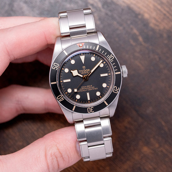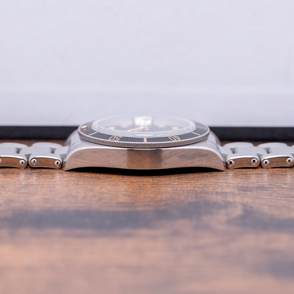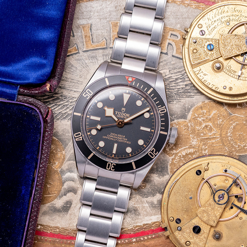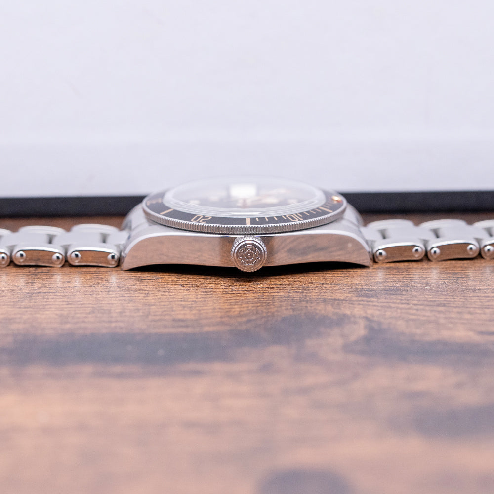 Here we have a 2020 Tudor Black Bay 58 Black on a Bracelet 79030N that pays tribute to their first divers; introduced in 1958, the Ref 7924 had a 39mm case and a big crown that achieved 200m water resistance, which was some achievement back then. A 39mm stainless steel case with polished and satin finishes, the curve of the case tapers towards the lugs with a lug-to-lug length of 47.5mm and a case thickness of 12mm, giving the watch an impressive wrist presence. On the right side is a screw-down signed crown, a unidirectional dive bezel with 60-minute numerals on a matte black aluminium insert, and at 12 o’clock, the characteristic red inverted triangle and lume pip. A domed sapphire crystal AR-coated protects a matte black dial; a gold-toned minute track is precisely executed, with applied gold-toned disc and baton hour markers coated in Super-LumiNova; and gold-toned Snowflake hands are coated in Super-LumiNova, complemented by a gold-toned Snowflake counterbalance sweeping second hand. The warm tones of the dial, indexes and hands add a vintage aesthetic to this distinctive dive watch. On the reverse, a coin-edged screw-down case back. Inside, their in-house automatic Calibre MT5402 (COSC) Certified Chronometer, 25 jewels, 28,800 beats per hour, and a bidirectional rotor system that provides a very impressive power reserve. It comes paired with its original 20mm Tudor stainless steel Oyster simulated rivet-style bracelet, which uses screws to remove links; a signed safety clasp; all links are included, and the watch comes with its Tudor presentation box, swing tag and paperwork.