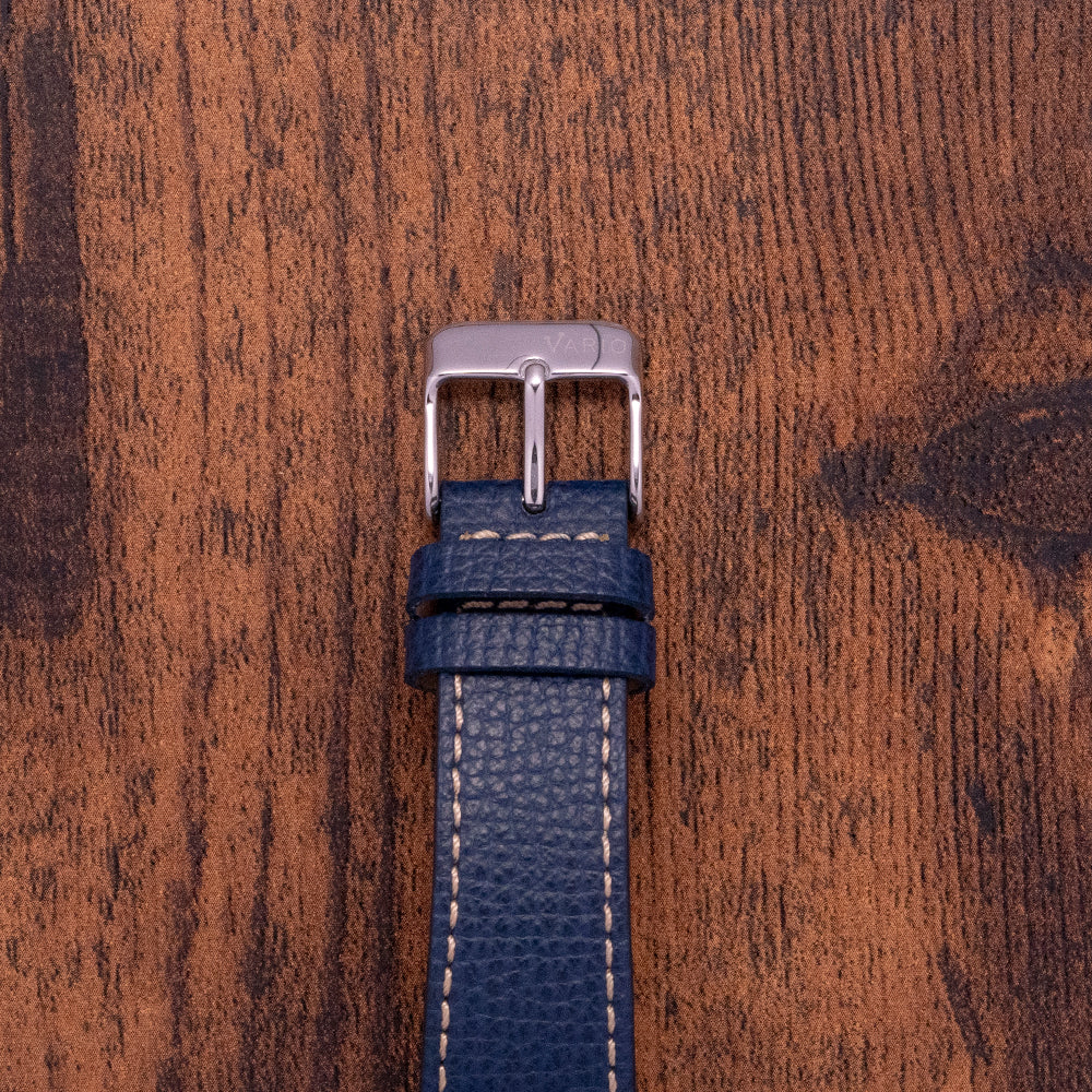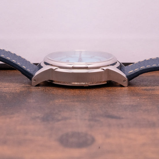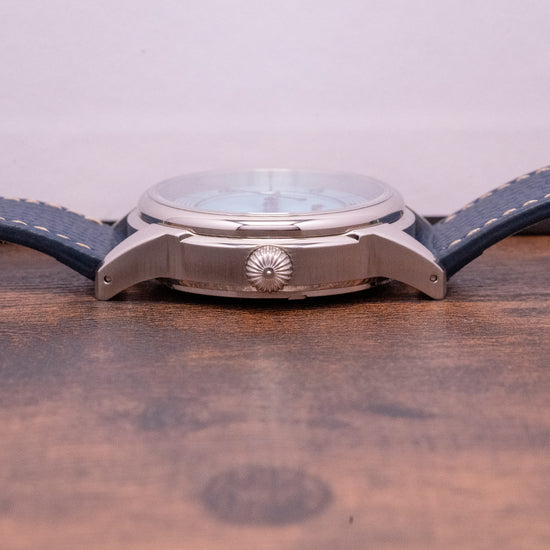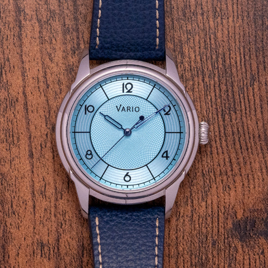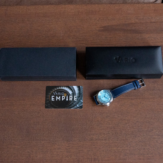 Here we have a 2020 Vario Empire Seasons Summer Blue Automatic limited to just 25 pieces with a brushed and polished 38mm stainless steel case that curves over your wrist towards the drilled tapered lugs, a lug-to-lug length of 45.5mm and a case thickness of 11.5mm ensure a comfortable fit. On the right side is an onion-style crown, a smooth polished bezel holds a flat sapphire crystal AR coated on the inside above a stunning Summer Blue sector dial. An outer minute track surrounds a raised ring with repeating circular lines and Art Deco numerals and thick lines between marking the hours. The centre has an attractive Guilloche pattern, and elegant skeletonised blued syringe style hands are complemented by a blued sweeping second hand. The dial has a clean sophistication that shimmers in the light as you rotate your wrist. At 12 o’clock we have the Vario motif completing this vintage-inspired dress watch. On the reverse a screw-down case back with a geometric Empire State Building in the centre and the watch details around its edge, inside an automatic Seiko Cal. NH38A, 24 jewels, beating at 21,600 beats per hour. The watch comes paired with a 20mm vintage-style Italian leather strap and the watch comes with its Vario presentation box and card.