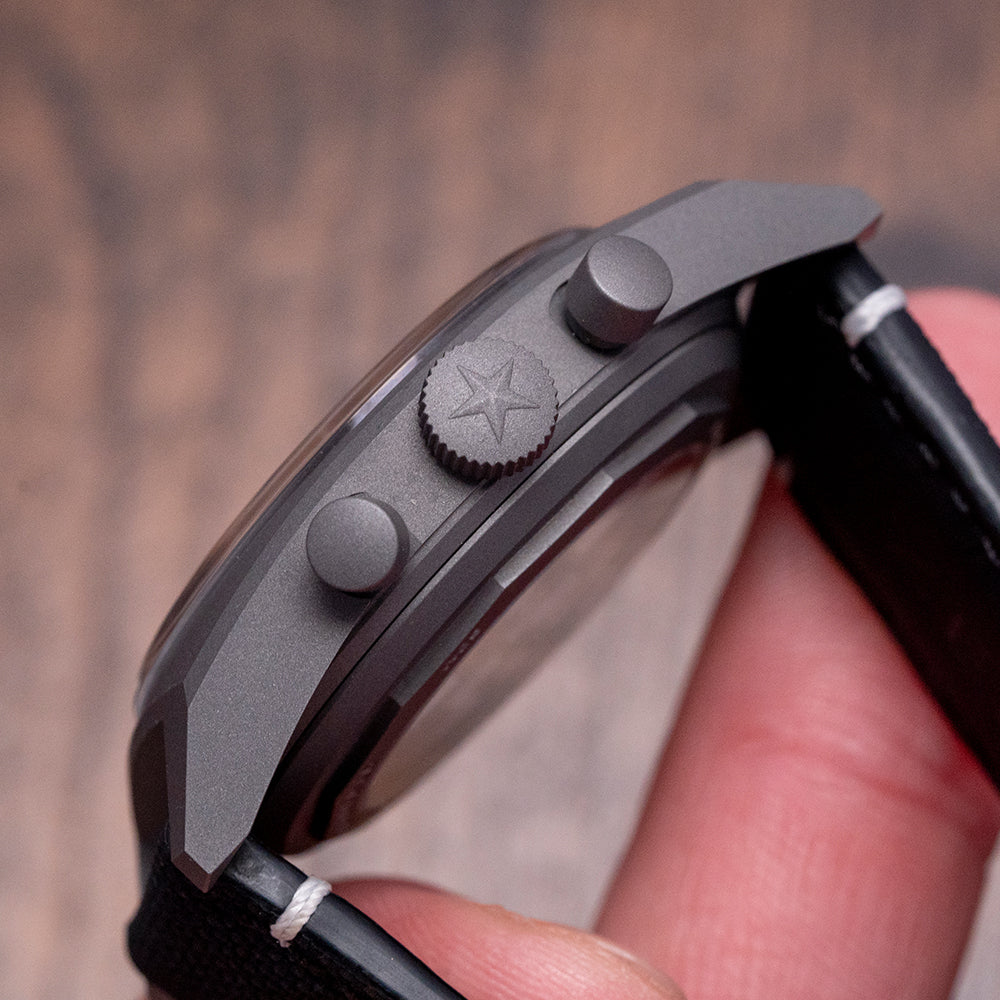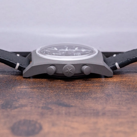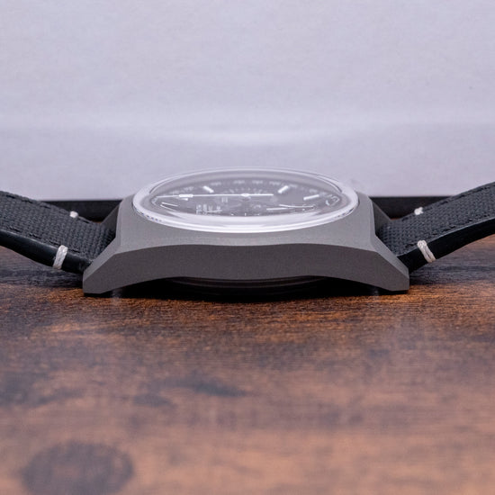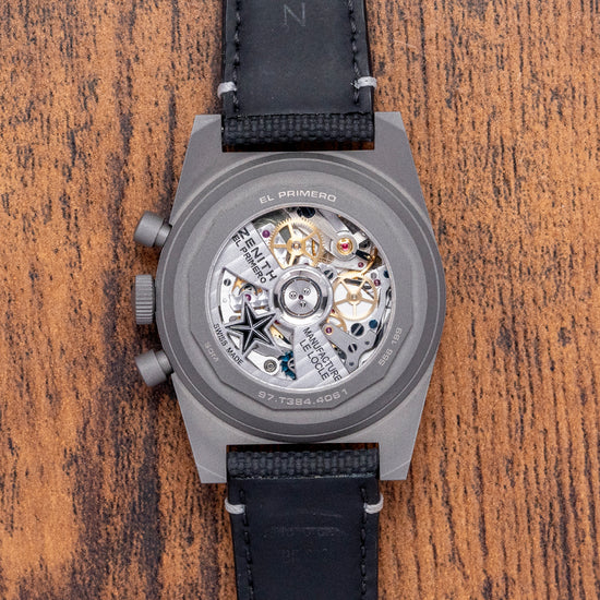 Here we have a 2020 Zenith Chronomaster Revival Shadow Titanium with a 37mm microblasted matte Titanium tonneau-shaped angular-sided case that curves over your wrist with flat-ended lugs; its chamfered flanks lead to a lug-to-lug length of 46.5mm and a case thickness of 12.5mm giving the watch an impressive wrist presence. Down the right side, we have the chronograph pushers and a signed crown. A domed sapphire crystal AR coated above a striking monochromatic black dial. An outer Tachymeter chapter ring surrounds applied baton hour markers filled in Super-LumiNova; at 3 o’clock, a 30-minute register in grey with a white hand; at 6 o'clock, a 12-hour in grey with a white hand and finally, at 9 o’clock, a continuous second register in grey with a white hand. Baton's hands are filled with Super-LumiNova and complemented by a white chronograph hand. At 12 o’clock, we have the Zenith El Primero motif completing this dynamic chronograph. On the reverse, a screwed-down exhibition sapphire case back with El Primero and the model number engraved around its edge, inside an automatic Zenith El Primero 4061, 31 jewels, 36,000 beats per hour. The modified bi-directional rotor has engraving, and the Zenith star is made up of 282 components. It comes paired with its original 19mm Zenith strap with a microblasted matte Titanium pin buckle, and the watch comes with its Zenith presentation box, swing tags and paperwork.