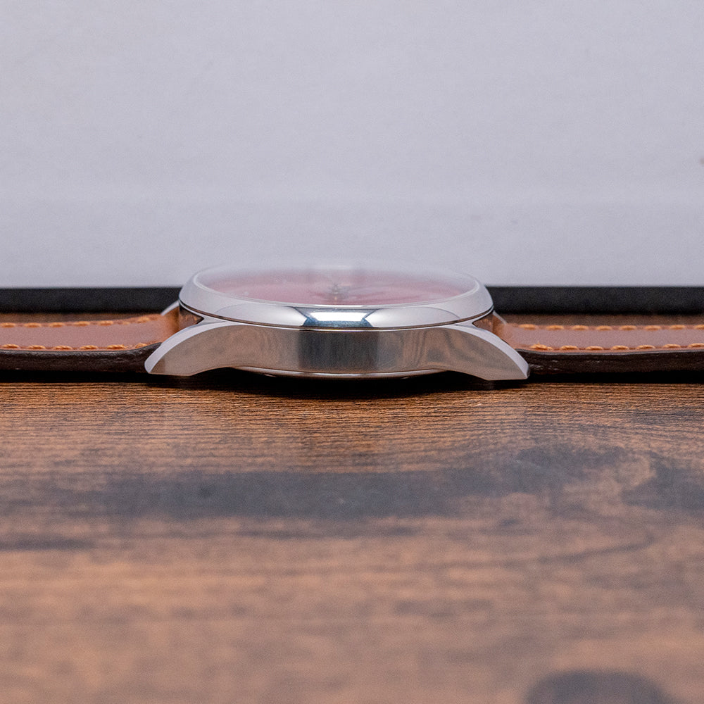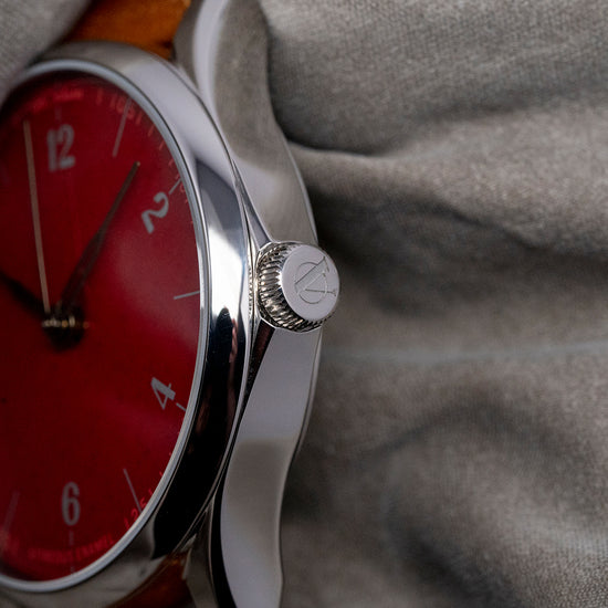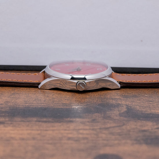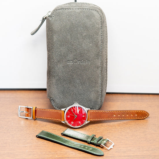 Here we have a 2020s AnOrdain Model 1 Medium Post Office Red, released in 2018 and discontinued at the end of 2021 due to sourcing issues. With a 38mm polished stainless steel case that gently curves over your wrist with curvaceous sides and tapered lugs, a lug-to-lug length of 46mm and a case thickness of 11mm, ensuring a comfortable fit. A polished, smooth bezel holds a domed sapphire crystal AR Coated, showing off the incredible Glasgow-made Post Office Red Enamel dial, its Vitreous Enamel is applied onto a copper base. The printed numerals and indices are inspired by the cartographic maps of the highlands; in-house polished steel hands are tempered to a uniform ‘straw’ finish complemented by a tapered, sweeping second hand. At 12 o’clock we have AnOrdain motif and at 6 o’clock Vitreous Enamel. On the reverse, a screw-down case back, inside an Automatic ETA Cal. 2824-2, 25 jewels, 28,800 beats per hour, modified to remove the date position. It comes paired with two AnOrdain 18mm leather straps with a signed buckle, and the watch comes with its AnOrdain suede travel case.