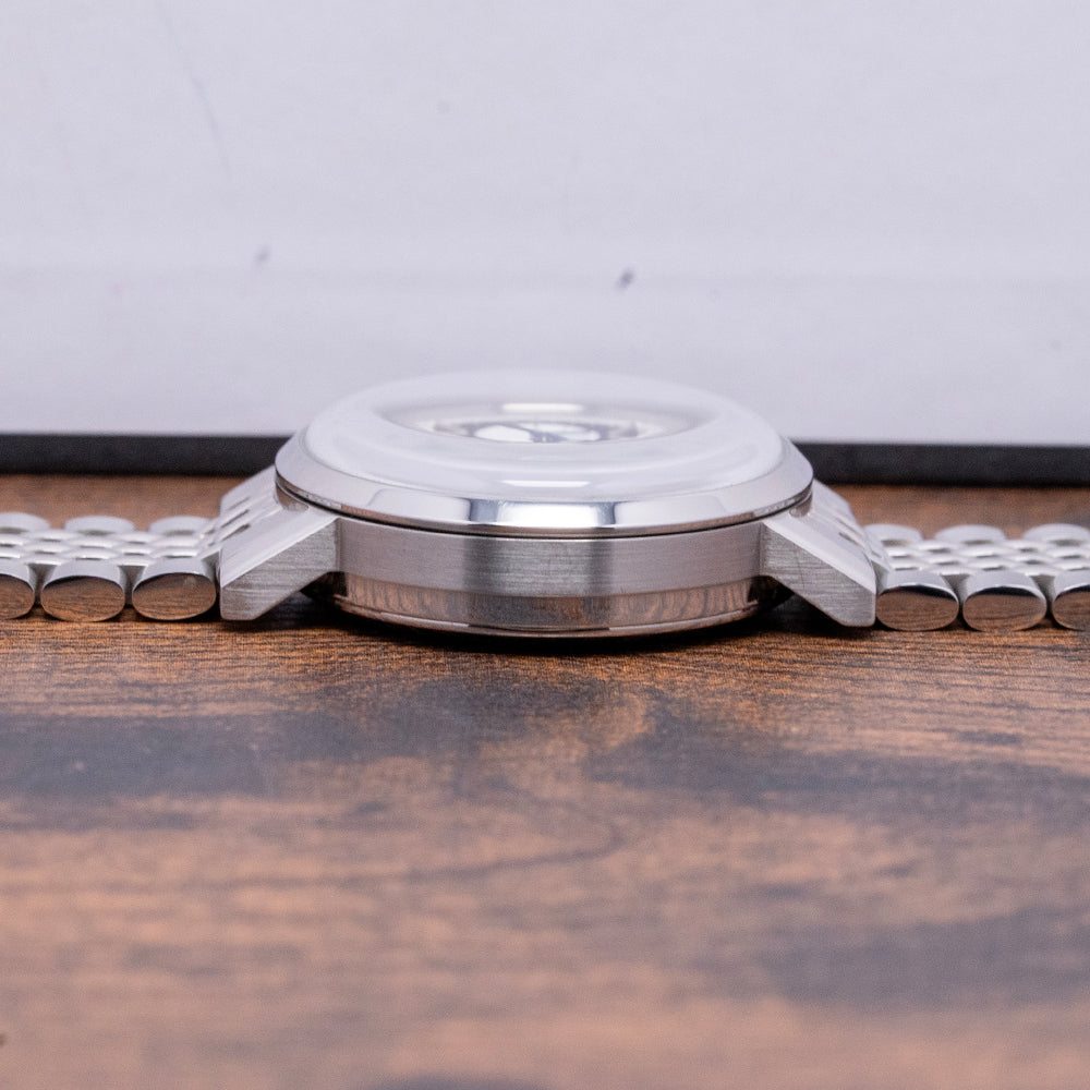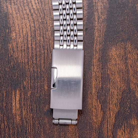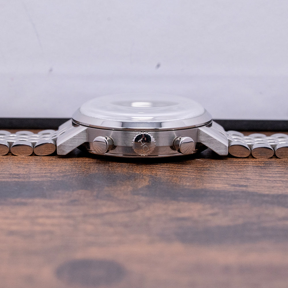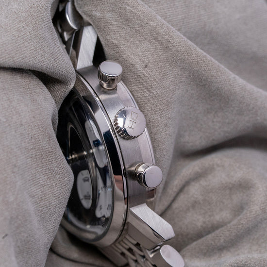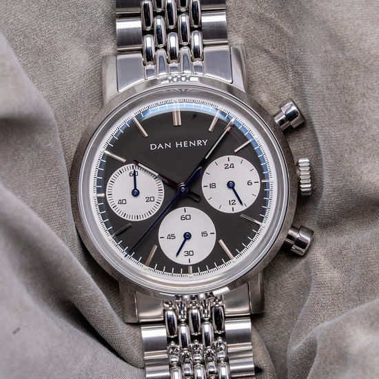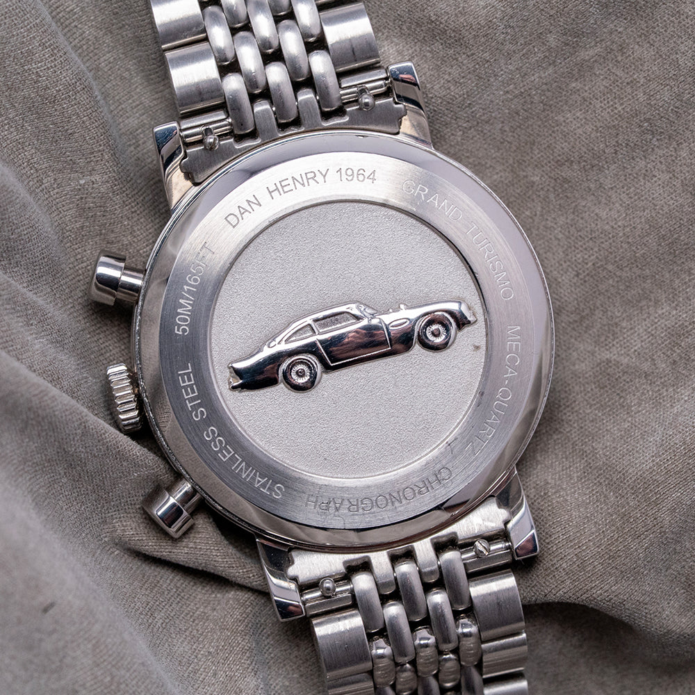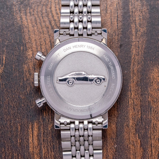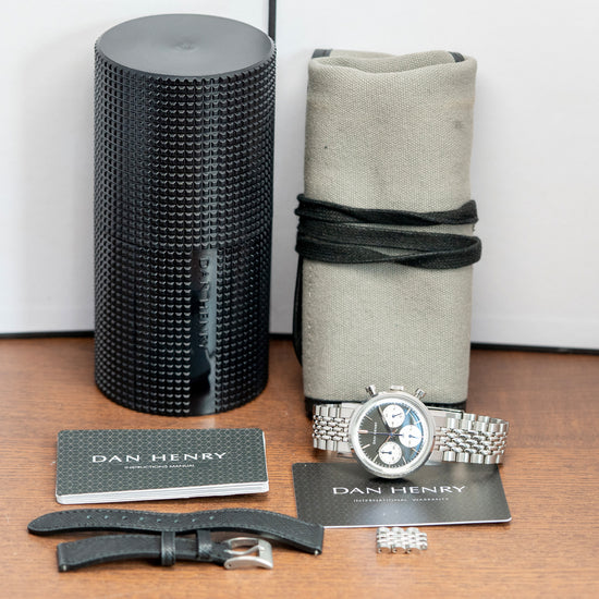 Here we have a 2020s Dan Henry 1964 Gran Turismo Chronograph, inspired by the Grand Tourer Chronographs of the 1960s. Its design is inspired by the racing watches worn by the greatest drivers of that era in Sicily and Monaco. Featuring a 36mm brushed and polished stainless steel case with straight lugs. Its curved flanks lead to a 43mm lug-to-lug length and a case thickness of 13mm for a very comfortable fit on the wrist. Down the right side, we have the chronograph pushers and a signed crown in the centre. A slim, polished bezel protects the double-domed Sapphire-coated Mineral crystal with AR treatment, providing better viewing angles in challenging lighting situations. Its matte black dial features an outer tachymeter in white, surrounding a minute track with Super-LumiNova pips. Chamfered baton indexes mark the hours. Slim baton hands filled with Super-lumiNova are complemented by a blued, tapered chronograph hand. Three white sub-dials indicate 24 hours at 3 o’clock, running seconds at 6 o’clock and a 60-minute register at 9 o’clock, each with a blued stick hand. On the reverse, a snap-off case back features the details of the watch around its edge, along with an embossed Aston Martin DB5, a nice touch that complements its Grand Tourer aesthetic. Inside a Seiko Meca-Quartz Cal. VK63 is a mechanical quartz hybrid that has a tuning fork-type quartz crystal. You experience the same kind of mechanical resistance when engaging the pushers, accompanied by a satisfying snap back of the chronograph's seconds hand on reset. It comes paired with its 18mm Beads of Rice bracelet and a signed push-button clasp, plus an 18mm leather strap in the box. This watch is sold with its original Dan Henry box, travel pouch and paperwork.