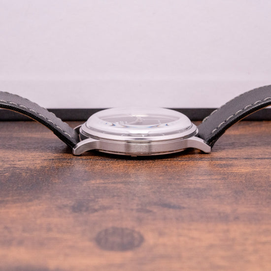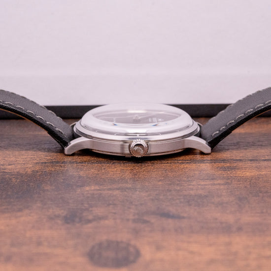 Here we have a classic 2020s Orient Bambino 2nd Generation Grey Automatic with a polished and brushed stainless steel case that curves over your wrist thanks to tapered lugs, and a lug-to-lug length of 46.5mm and a case thickness of 11.5mm ensuring a comfortable fit. On the right side is a signed crown, a slim smooth polished bezel that holds a domed mineral crystal above a striking sunburst grey dial. An outer minute track has applied steel batons at the cardinal points and printed markings in between marking the hours, at 3 o’clock a date window, and elegant steel baton hands are complemented by a sweeping second hand completing this classic dress watch. On the reverse a screw-down solid case back with the details of the watch around the edge and the Orient shield in the centre, inside an automatic Orient Cal. F67, this upgraded in-house movement has hand winding and hacking for your convenience. The watch comes paired with its original 21mm Orient signed leather strap and pin buckle and with its original Orient Box, swing tag and Paperwork.