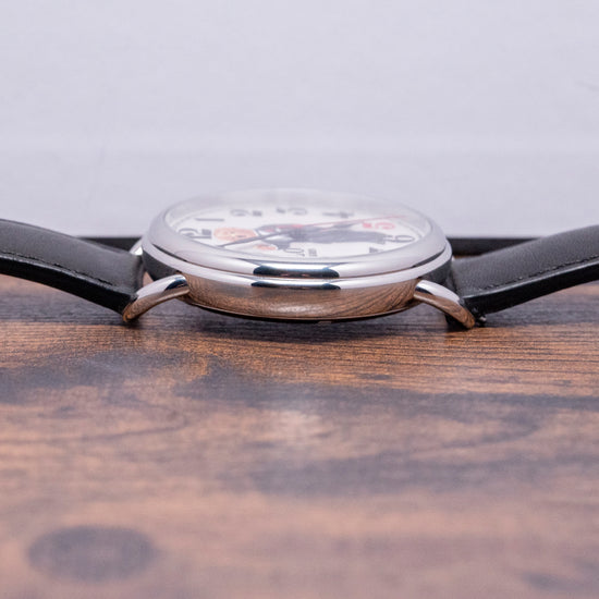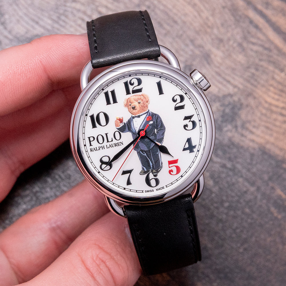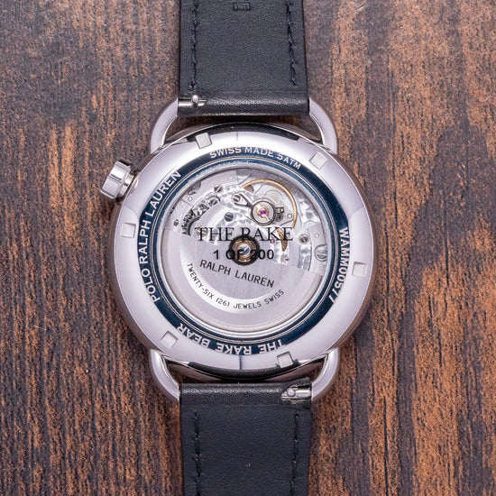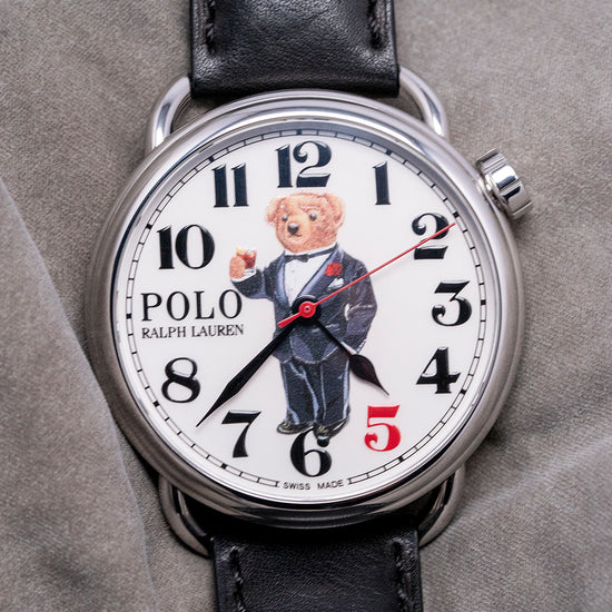 Here we have the distinguished 2020s Ralph Lauren x The Rake 'Negroni Bear' Limited to 200 pieces in collaboration with The Rake. Made as a symbol of strength against the backdrop of the life-changing COVID-19 pandemic of 2020. "The Rake", founded by Wei Koh, is a magazine that features many aspects of men's lifestyle. First published in 2008, their offices are in London. The magazine covers a variety of topics related to fashion, culture, and luxury living for men. It is recognised for its high-quality editorial content and photography. The 41.5mm polished stainless steel round case sits comfortably on your wrist thanks to the wired lugs. Its curved flanks lead to a lug-to-lug length of 47mm and a case thickness of 10.5mm. At 2 o’clock on the right side, there is a coin-edged crown. The stepped, polished, smooth bezel holds a flat crystal above a distinctive Ralph Lauren POLO bear holding a glass of Negroni, wearing his dapper black suit and tie. A Negroni is a well-loved Italian cocktail that has a unique mix of flavours, balancing sweetness with a hint of bitterness. It's made by combining equal amounts of gin, a bitter Italian liqueur called Campari, and sweet vermouth, which adds a rich flavour. This drink is typically served over ice and often garnished with a slice or twist of orange for a nice finishing touch. An outer minute rail track surrounds large black Art Deco Arabic numerals marking the hours, with a deep orange five, a nod to the colour of this particular cocktail. Black spade and syringe hands are complemented by a deep orange second hand. At 9 o’clock, we have the ‘POLO Ralph Lauren’ completing this versatile, limited-timepiece. On the reverse, a screw-down exhibition case back with the details of the watch in high relief around its edge and ‘The Rake 1 of 200 Ralph Lauren’ printed in the centre, inside an automatic Sellita SW200-1, 26 jewels, beating at 28,800 beats per hour featuring hand winding, hacking seconds for your convenience. It comes paired with its quick-release 20mm leather strap and a Negroni orange grosgrain strap. This watch is sold with its original Ralph Lauren x The Rake box and paperwork.