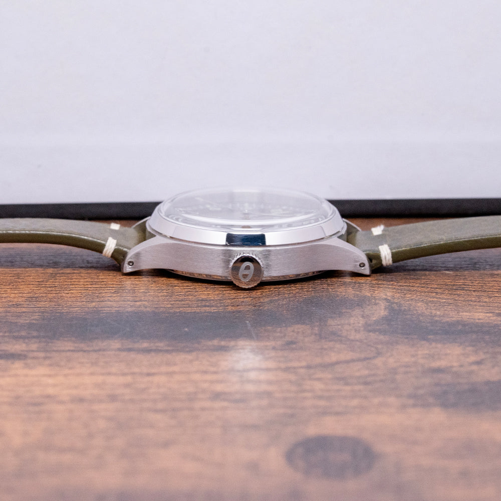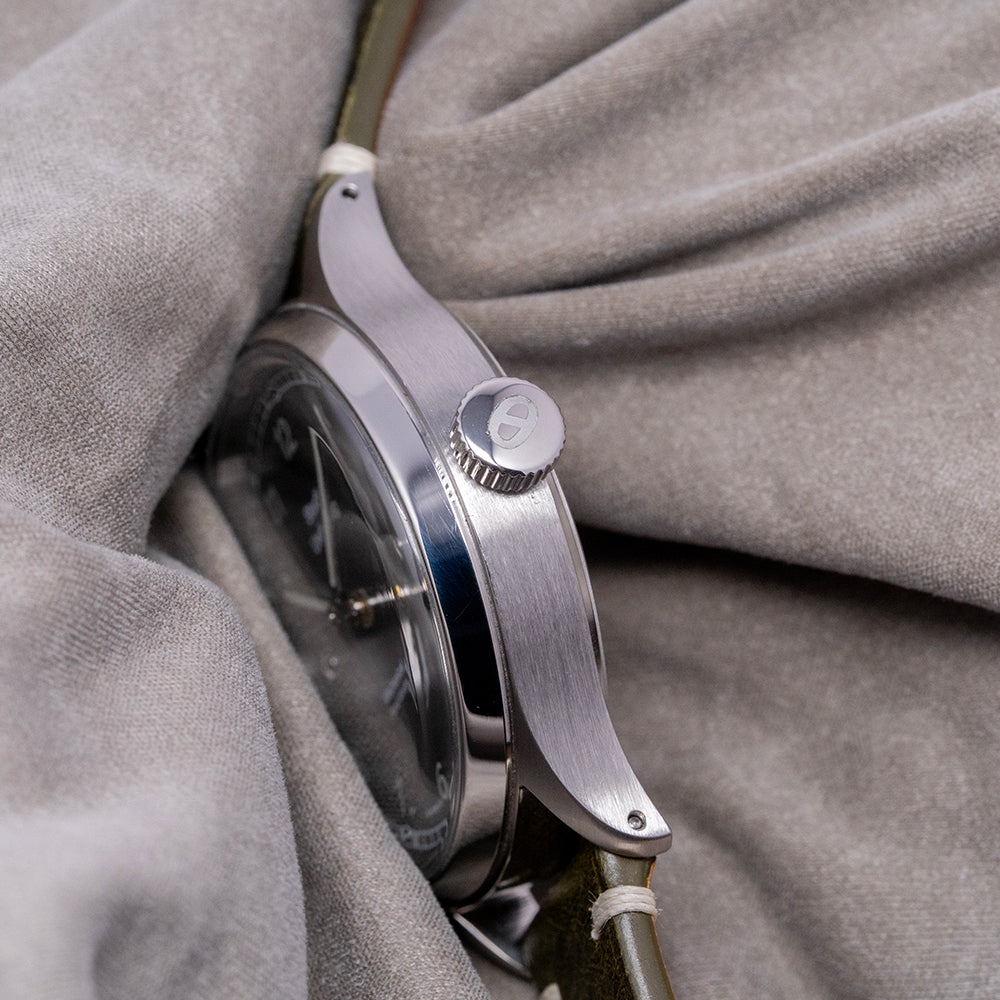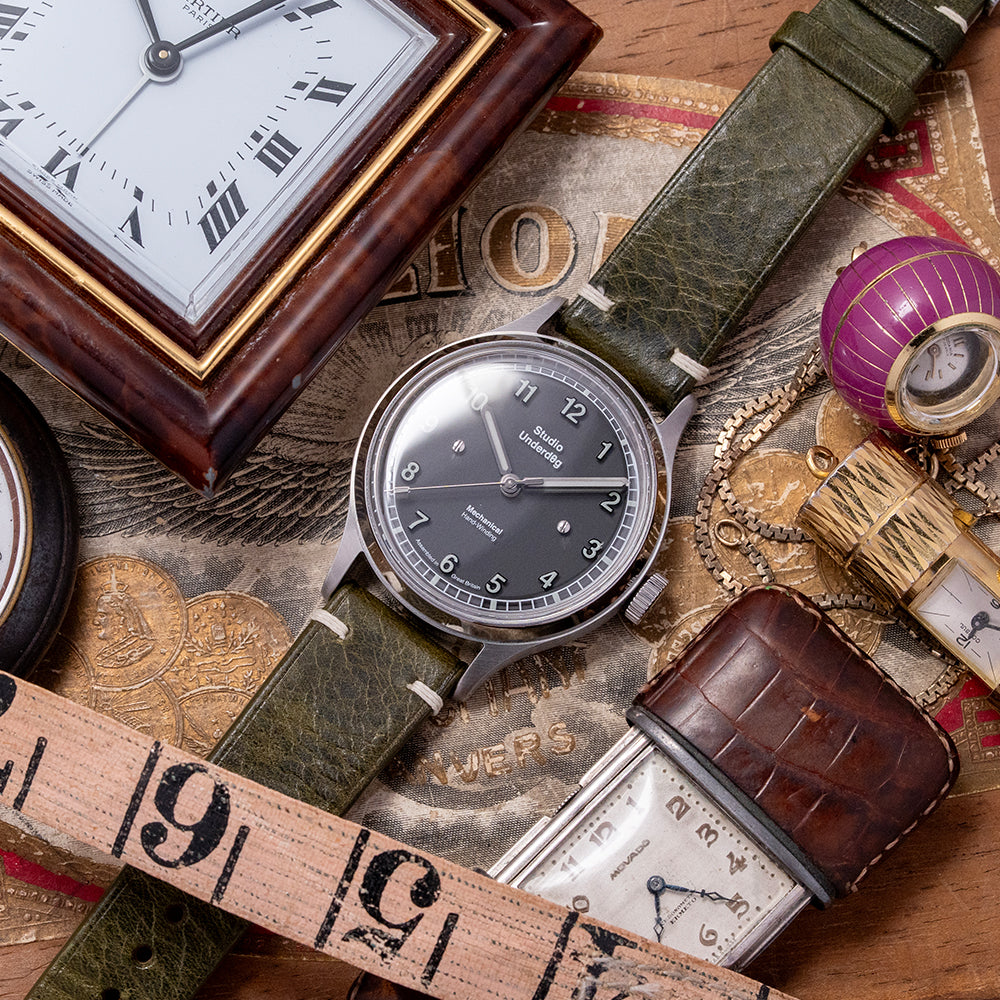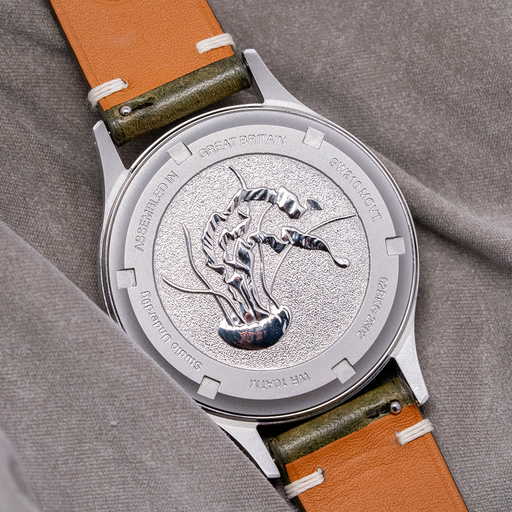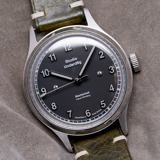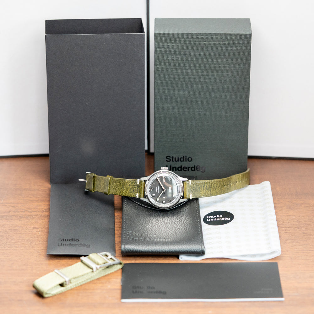 Here we have a 2020s Studio Underd0g 02SERIES Midnight, inspired by the military field watches of the 1940s, featuring a brushed 37mm stainless steel case that gently curves over your wrist with tapered drilled lugs, its curved flanks lead to a lug-to-lug length of 46mm and a case thickness of 12mm, ensuring a comfortable fit. On the right side is a signed coin-edged crown. A smooth, polished bezel holds a domed sapphire crystal above a superbly crafted black sandwich brass base coated in seven layers of Super-LumiNova pigment. The transparent 1mm sapphire disc sits above the lower base plate, secured by two screws featuring a printed outer minute rail track that surrounds Arabic numerals, creating a shadow on the base layer that marks the hours and gives the impression that they are floating above the dial. Slender baton hands filled with Super-LumiNova are complemented by a tapered, sweeping second hand. At noon, we have the Studio Underd0g motif, and at 6 o’clock, “Mechanical Hand Winding" completes this stunning field watch. On the reverse, a screw-down case back with the details of the watch around its edge and an embossed jellyfish in the centre, inside a manually wound Sellita SW210-1, 19 jewels, beating at 28,800 beats per hour. It comes paired with an 18mm Black vintage-style quick-release strap, handmade by The Strap Tailor, and a signed pin buckle, plus an 18mm NATO strap. This watch is sold with its original Studio Underd0g box, travel case, and paperwork.