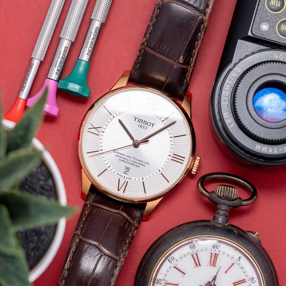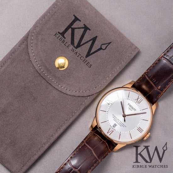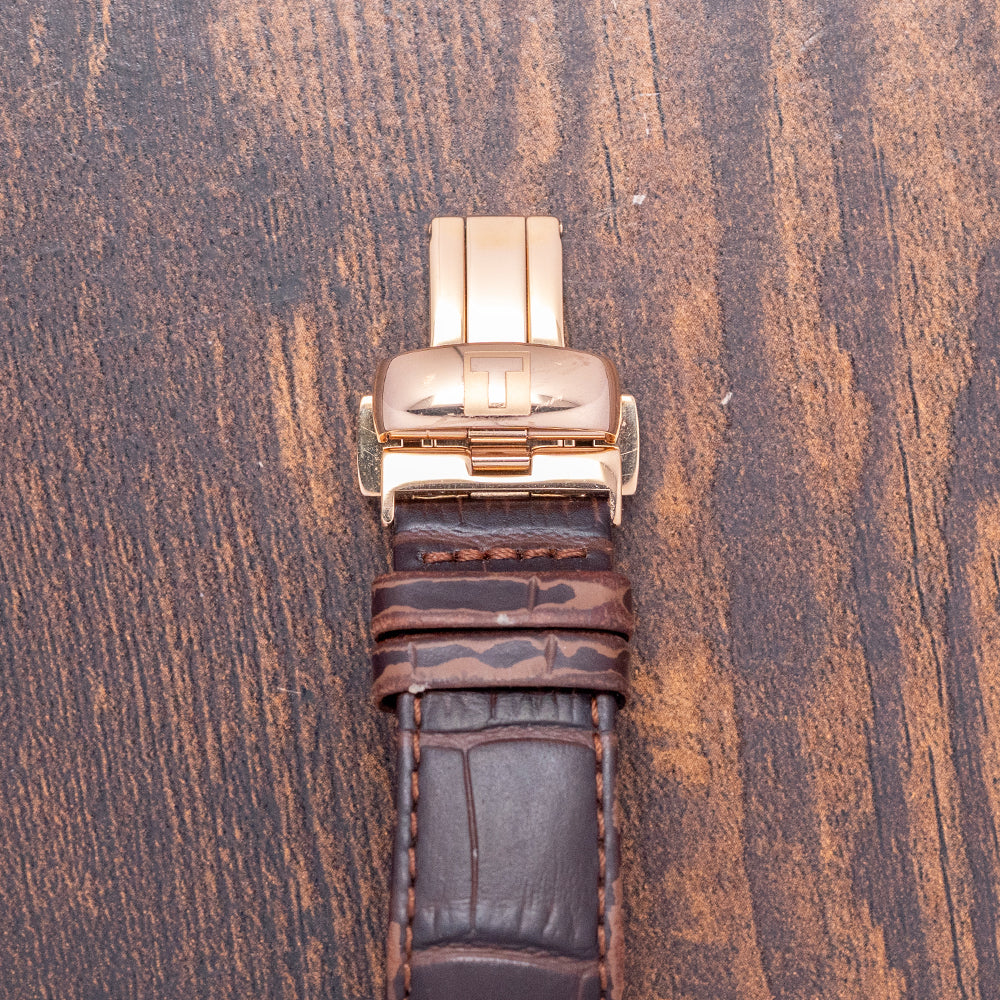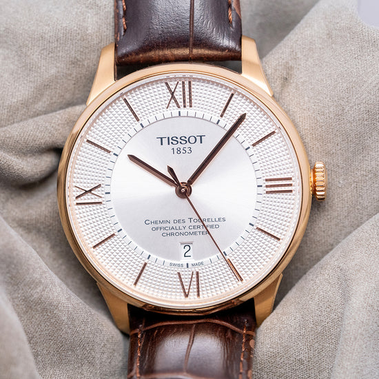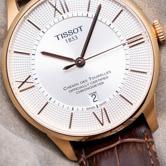 Here we have a 2020s Tissot Chemin Des Tourelles Chronometer featuring a 42mm 316L stainless steel Rose Gold PVD-coated round case that gently curves over your wrist with finely tapered lugs. Its curved flanks lead to a comfortable lug-to-lug length of 49mm and a case thickness of 11mm. On the right side, a coin-edged crown. A slim, smooth bezel holds a domed sapphire crystal AR-coated above a stunning silver sector dial. A wide guilloché-patterned ring features applied rose gold PVD-coated Roman numeral and baton indexes marking the hours. An inner minute track surrounds the sunburst silver centre with rose gold PVD-coated stick hands complemented by a tapered second hand and a date window at 6 o’clock. At noon, we have the Tissot motif and at 6 o’clock, ‘Chemin Des Tourelles Officially Certified Chronometer’. On the reverse, a 316L stainless steel Rose Gold PVD-coated exhibition case back, etched with the watch's details around its edge. Inside an automatic Powermatic 80 COSC movement based on the ETA 2824-2 and fitted with a Patented silicone balance-spring. 23 jewels, beating at 21,600 beats per hour. It comes paired with its 21mm leather strap and signed rose-gold PVD-coated deployant buckle.