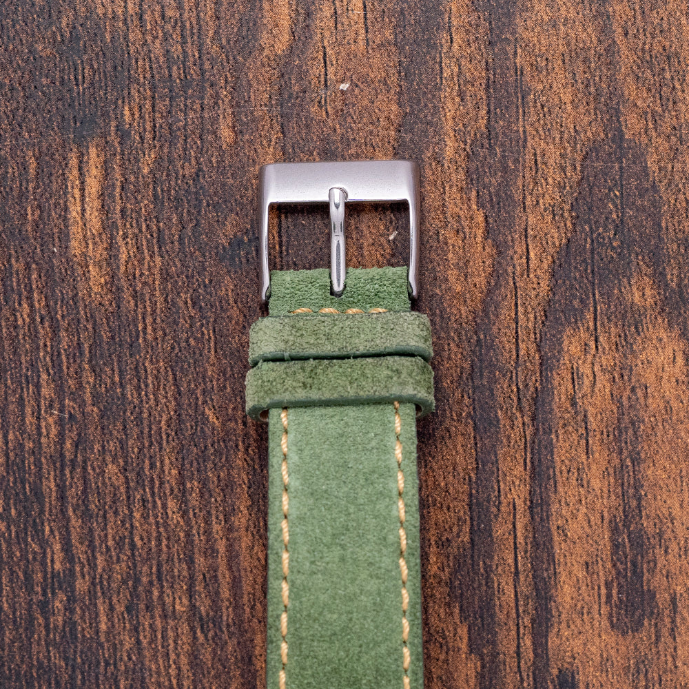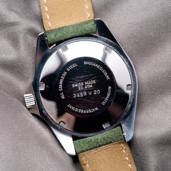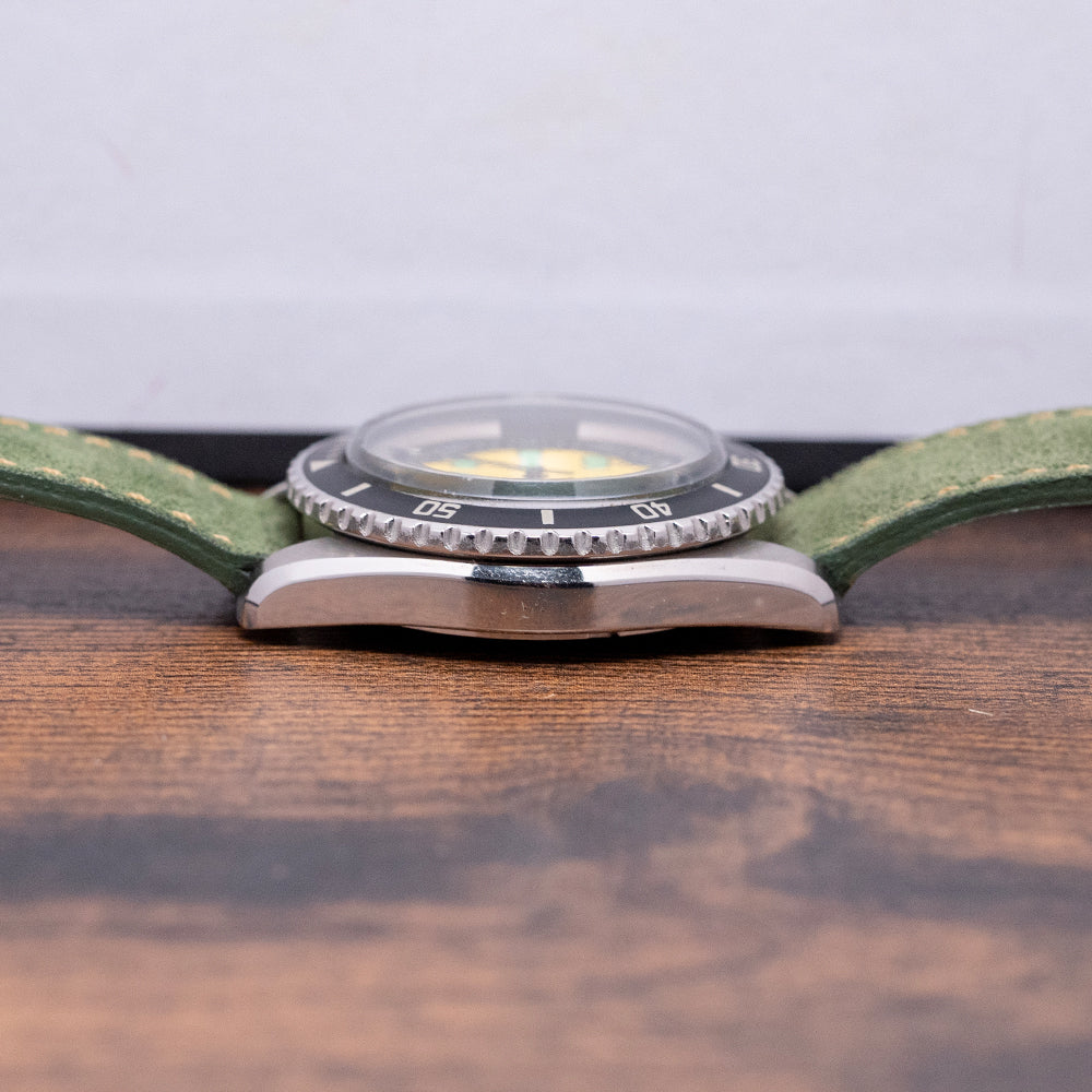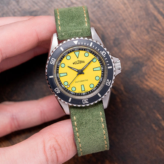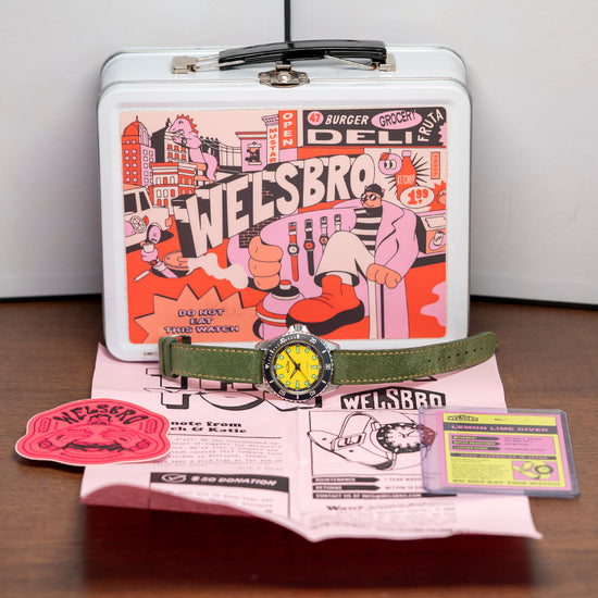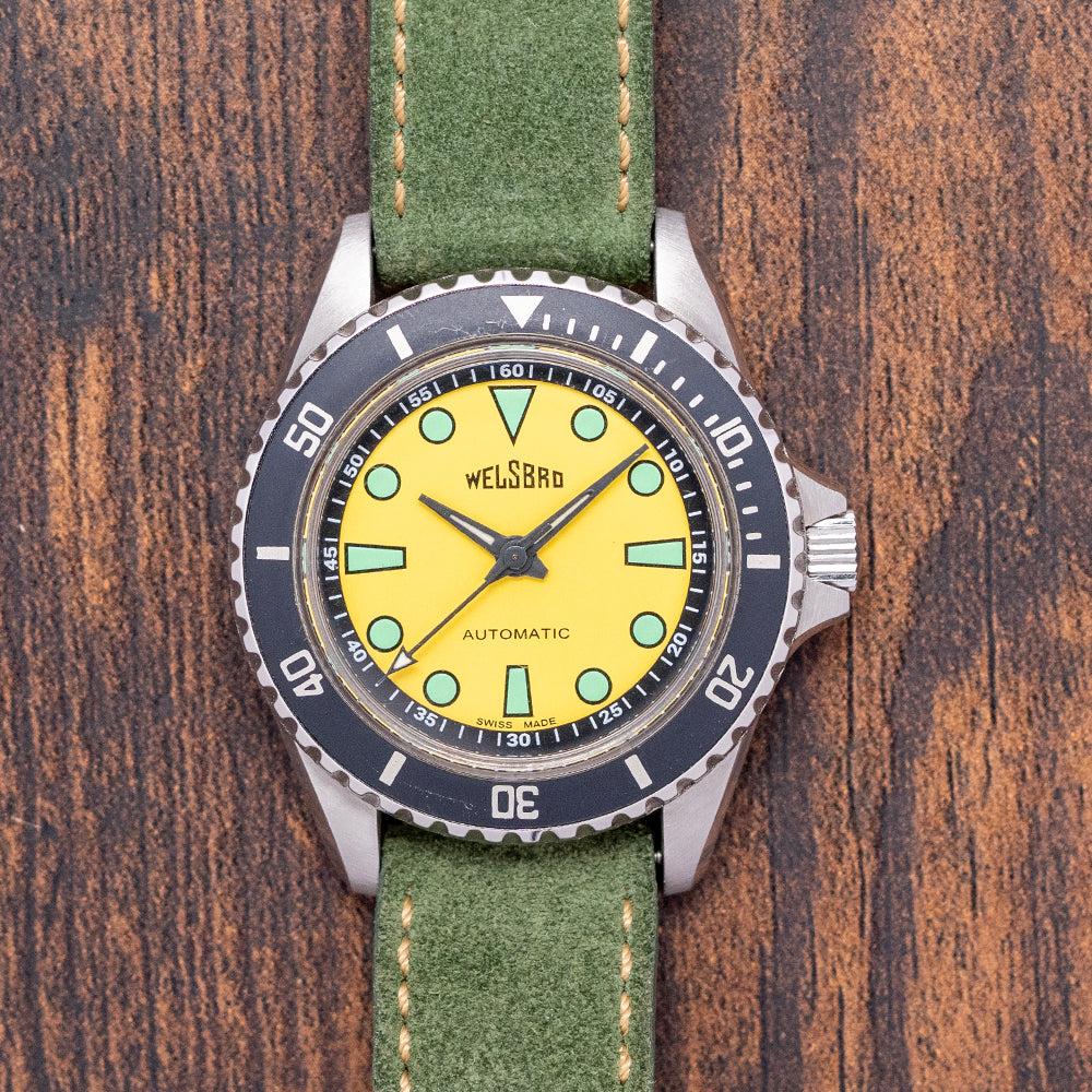 Here we have a fun 2020s Welsbro Lemon Lime Soda Diver 'Monnin' Automatic made in a small batch size of 12 pieces; this collection sold out in 60 seconds. The distinctive 37mm ‘Monnin’ stainless steel case, upcycled and unused from the 1980s, features polished flanks and circular, brushed, wide lugs. Its curvaceous, chamfered-edged flanks lead to a lug-to-lug length of 44.5mm, and a case thickness of 12.5mm ensures a comfortable fit on your wrist. On the right side, a deep knurled screw-down crown is protected by flared crown guards. The bidirectional, non-ratcheting, deeply knurled steel bezel has a black aluminium insert with a 60-minute dive scale in silver-painted numerals and markings. A domed acrylic crystal sits above a colourful matte lemon-lime soda dial. An outer minute track surrounds black outlined discs and trapezoid indexes coated in green Super-LumiNova, marking the hours. Black Dauphine hands filled with Super-LumiNova are complemented by an arrow-pointed second hand. At noon, we have the Welsbro motif, and at 6 o’clock, ‘Automatic’ completes this fun vintage-inspired sports watch. On the reverse, a screw-down solid case back is engraved with the details of the watch, and inside is an upcycled and unused 1970s automatic A. Schild Cal. 1913, 25 jewels, beating at 21,600 beats per hour. It comes paired with its 18mm Welsbro green suede strap and pin buckle. The watch comes with its Welsbro presentation box and paperwork.