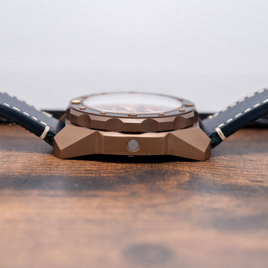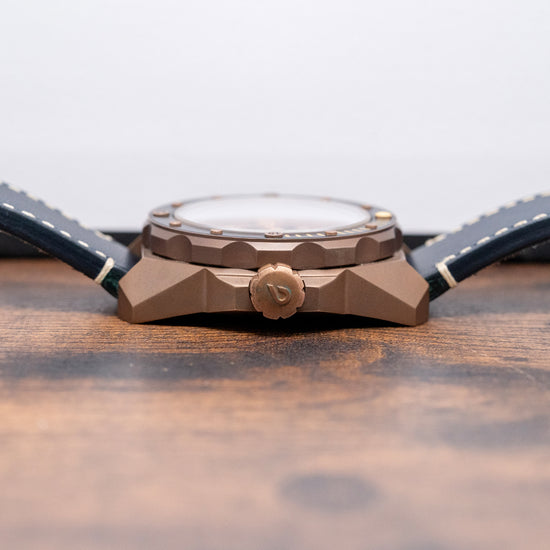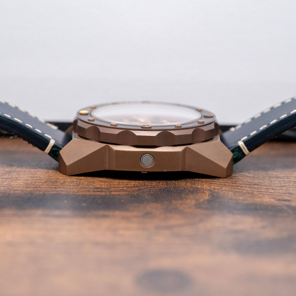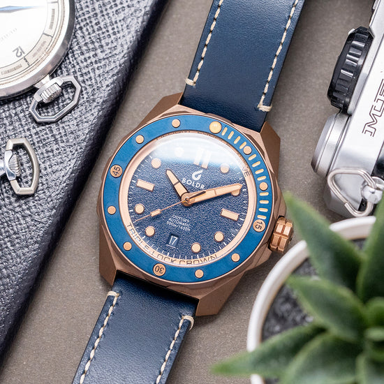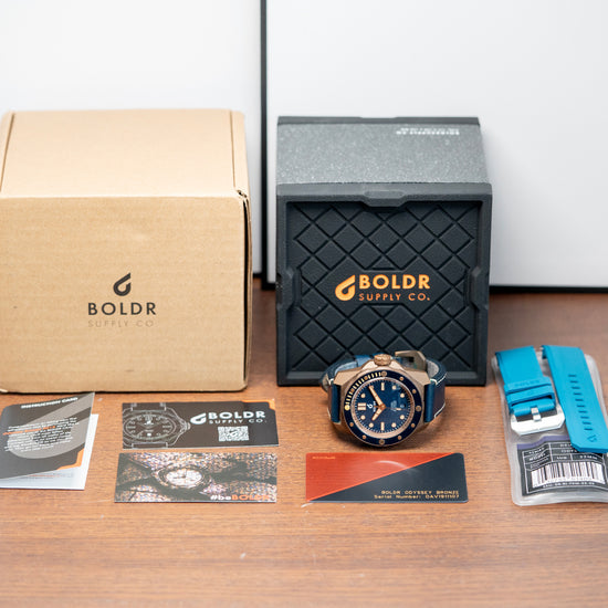 Here we have a 2021 Boldr Odyssey Bronze Aventurine Automatic, featuring a 45.5mm CuSn8 Bronze case with flat, angled ends that conceal the lugs. The masculine bevelled-edged flanks lead to a lug-to-lug length of 53mm and a case thickness of 16mm, giving the watch an impressive wrist presence. On the right at 3 o’clock is a signed screw-down Triple-lock crown. On the left side, an automatic Helium Escape Valve is in the centre. The deep knurled CuSn8 Bronze 120-click unidirectional bezel features a blue aluminium insert with raised 60-minute numerals and disc’s and engraved markings. A double-domed, sapphire-crystal, AR-coated lens sits above a stunning Aventurine dial. Slight flake-shaped inclusions reflect light in a magical way known as "aventurescence." When you rotate your wrist, the dial shimmers from black to blue, giving you the impression of looking up at the starry sky; this mineral makes each dial unique. An outer CuSn8 Bronze chapter ring is printed with Helium Escape Valve and Triple-Lock Crown surrounding a minute track above applied Lumibloc Super-LumiNova disc and baton indexes filled with lume, marking the hours. At 6 o’clock, a colour-matched date window. The CuSn8 Bronze ladder-style hands are filled with Super-LumiNova and complemented by a bronze sweeping second hand. At noon, we have the Boldr motif, and at 6 o'clock, the ‘Odessey Automatic 500M/1650FT’ completes this versatile tool watch. On the reverse, a custom screw-down case back with an artistic embossed compass in the centre, inside an automatic NH35A. 24 jewels, 21,600 beats per hour, this workhorse movement has hacking and hand-winding for your convenience. It comes paired with two BOLDR 22mm straps and also includes its BOLDR presentation box and paperwork.