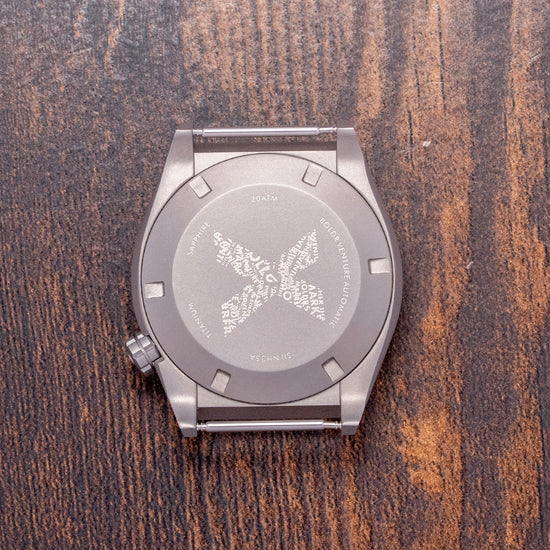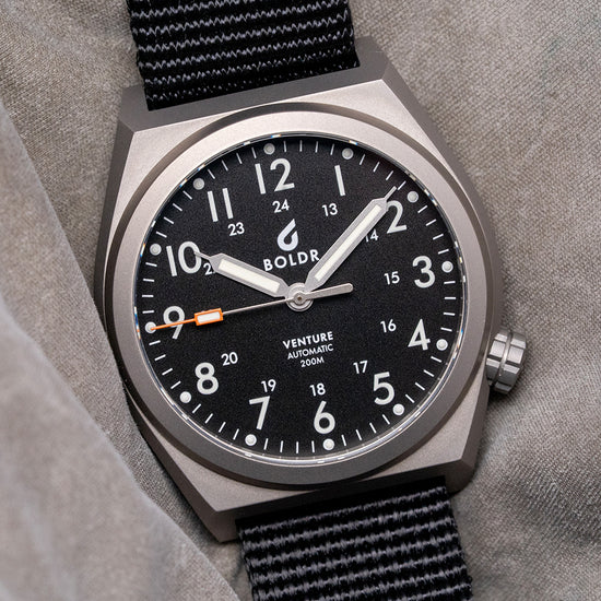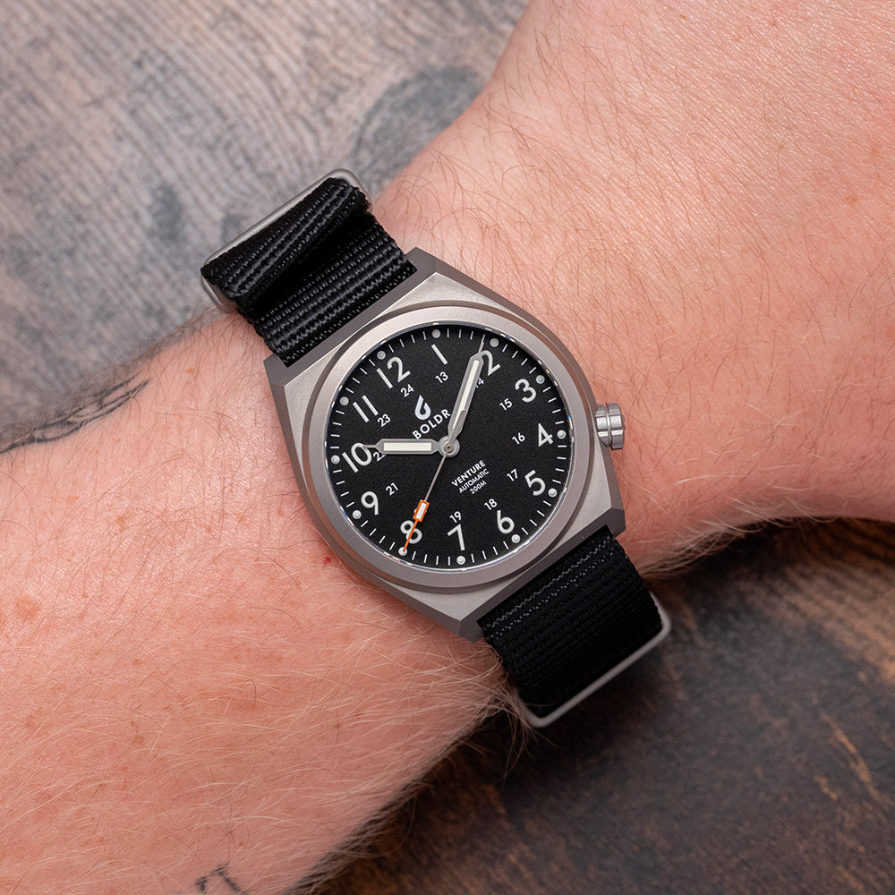 Here we have a 2021 Boldr Venture Automatic Carbon Black, featuring a 38mm Titanium tonneau-shaped case and flat, angled ends that conceal the lugs. The curved, chamfered-edged flanks lead to a lug-to-lug length of 43.5mm and a case thickness of 11.5mm, giving the watch an impressive wrist presence. On the right at 4 o’clock is an embossed, signed screw-down crown, a sapphire crystal AR-coated sits above a matte Black dial. An outer minute track has lumed pips at the hour surrounding Arabic numerals above smaller 24-hour Arabic numerals coated in Japan Superlume, marking the hours. The syringe-style hands are filled with Japan Superlume and complemented by an orange-tipped sweeping second hand. At noon, we have the Boldr motif, and at 6 o'clock, the ‘Venture Automatic 200M’ completes this versatile tool watch. On the reverse, a custom screw-down case back with an artistic embossed ‘X’ made up of the Boldr name, inside an automatic NH35A, 24 jewels, 21,600 beats per hour, this workhorse movement has hacking and hand-winding for your convenience. It comes paired with its 20mm tough NATO strap with signed Titanium hardware, and also comes with its BOLDR presentation box and paperwork.