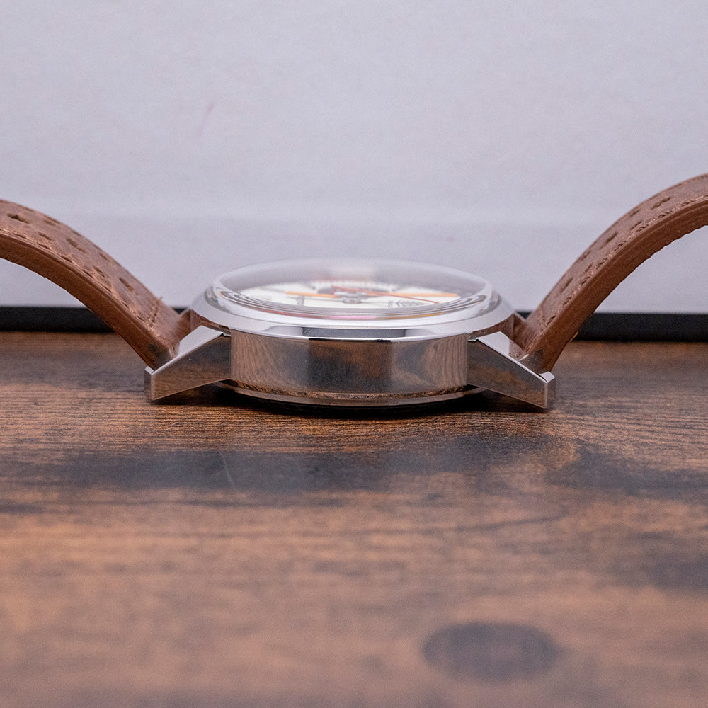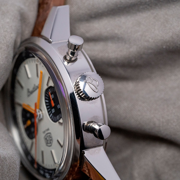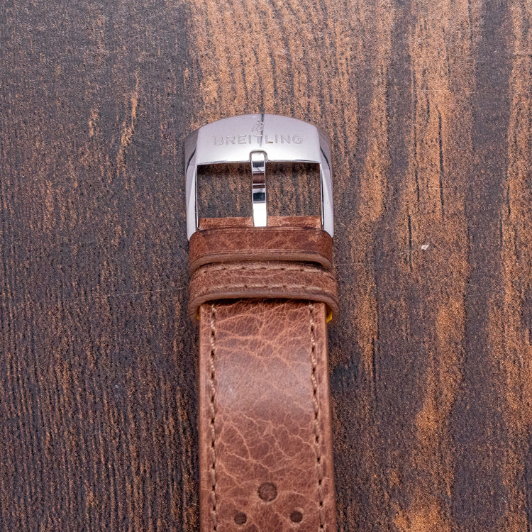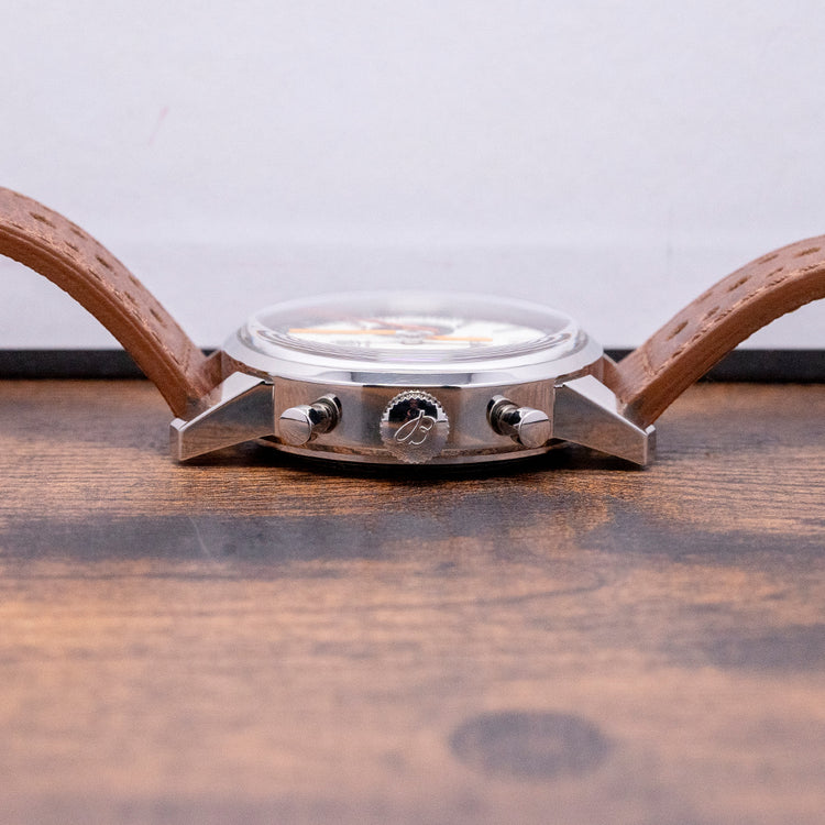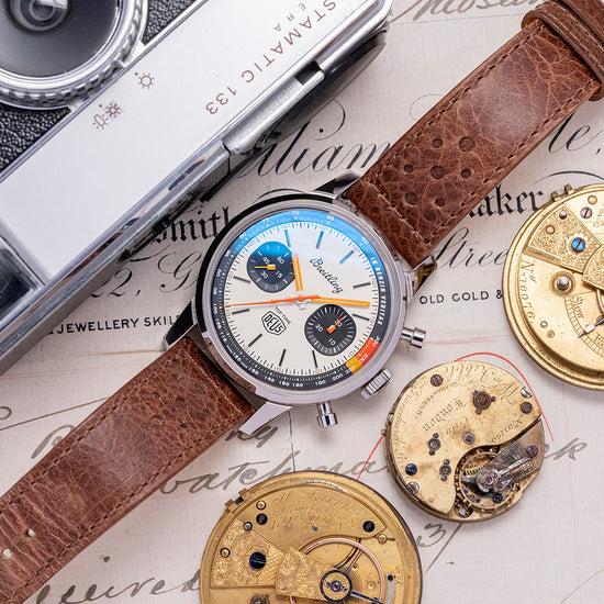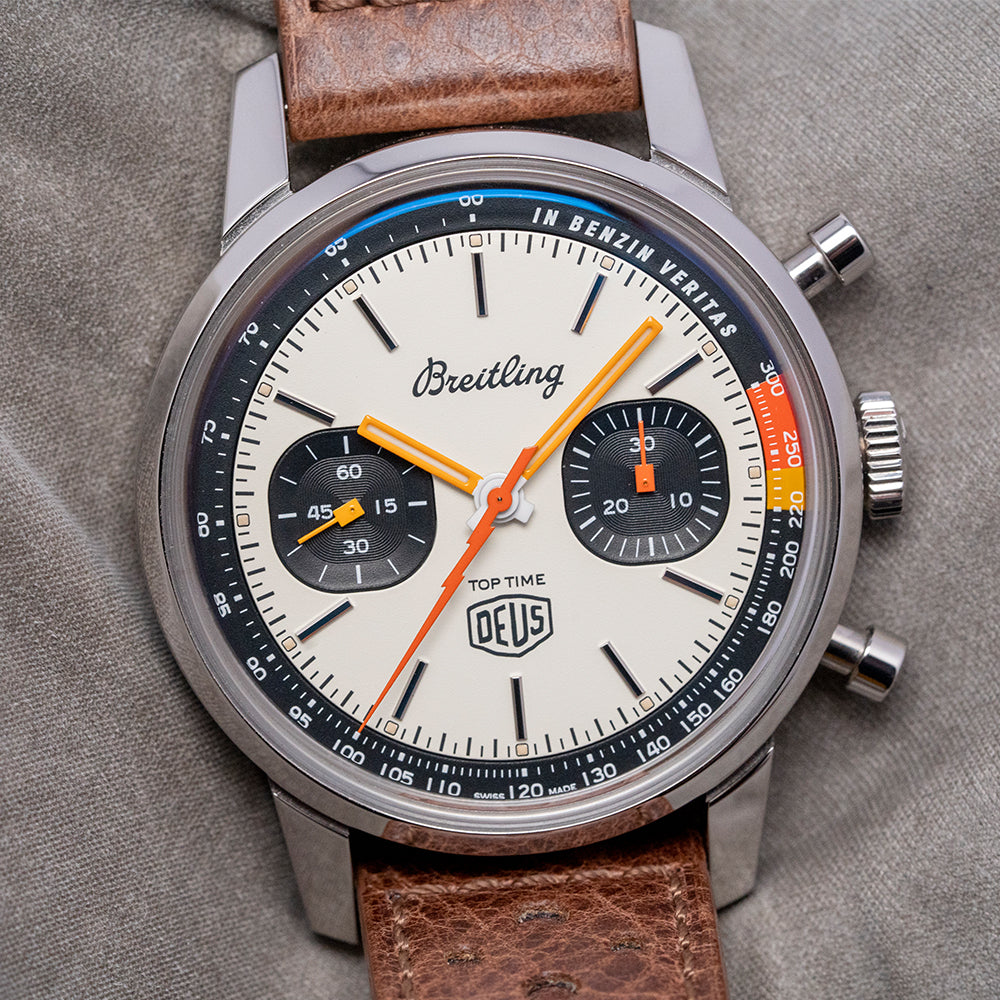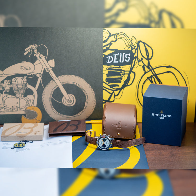 Here we have the colourful 2021 Breitling Top Time Dues Limited Edition 41mm A23310, a Limited edition One of 1500 pieces, in collaboration with Australian brand Deus Ex Machina. Deus Ex Machina was founded in Australia in 2006 and is inspired by custom bike shops and surf shops, bringing together a collection of men's clothing and accessories. The polished stainless steel 41mm case leads to thick tapered lugs with a lug-to-lug length of 51mm and a case thickness of 14mm, giving the watch an impressive wrist presence. On the right side, we have the piston chronograph pushers and a signed crown. A polished, smooth bezel holds a domed sapphire crystal sitting above a beige bi-compax dial. An outer navy blue, orange and red accents Tachymetre “In Benzin Veritas,” Latin meaning “God out of the machine is the truth in gasoline”, is precisely printed with a minute track underneath, lume pips and baton indexes mark the hours coated in Superluminova. At 3 o’clock, a 30-minute register with a navy blue background, red stick hand and at 9 o’clock, a continuous seconds register with a navy blue background, yellow stick hand complete this colourful, sporty dual-branded bi-compax. Yellow hands have lume infill complemented by a red lightning bolt chronograph hand; at 12 o’clock, we have the Breitling motif, and at 6 o’clock, we have the Top Time DEUS logo. On the reverse, a screw-down case back with a DEUS motorcycle “Breitling + DEUS engraved in the centre, inside an automatic Breitling Cal. 23, 27 jewels, 28,800 beats per hour, this Chronometer Certified movement has a base of the ETA 7753. It comes paired with its Breitling 20mm leather strap with a signed buckle. This watch is sold with its original Breitling presentation box, swing tag and accessories, including a huge Dues book, unused Breitling leather wallet and original delivery note from Breitling.