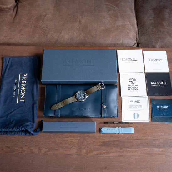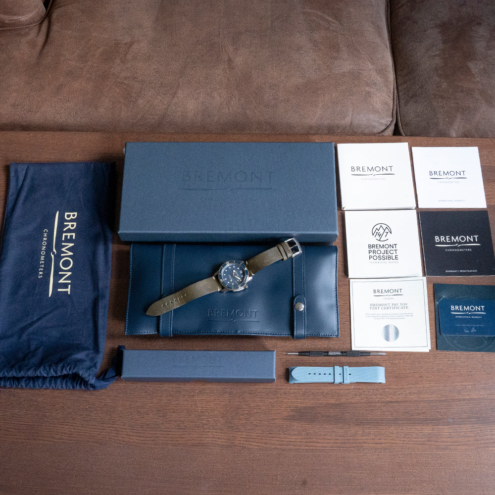 This watch is sold with its Original Bremont Box & Bremont Paperwork. The watch comes paired with a 22mm Bremont vintage-style leather strap and signed buckle, an additional 22mm Bremont blue rubber strap is provided in the box. The watch is from August 2021 and is in worn condition but overall in very fair condition as you can see from the photographs. The watch comes with our 12-Months Warranty.