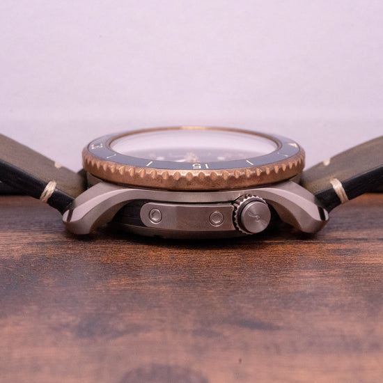 There is no denying that Bremont's are large watches, but I'm always amazed by how well they wear on the wrist and that is even more the case with this "Project Possible" as it's cased in titanium and is incredibly light on the wrist! The shade of blue used is subtle, it perfectly contrasts against the darker tone of the titanium and the bronze on the bezel. Plus the "Project Possible" symbol in the dial is also subtle, noticeable in certain lights and it adds another dimension to the watch which works really well.