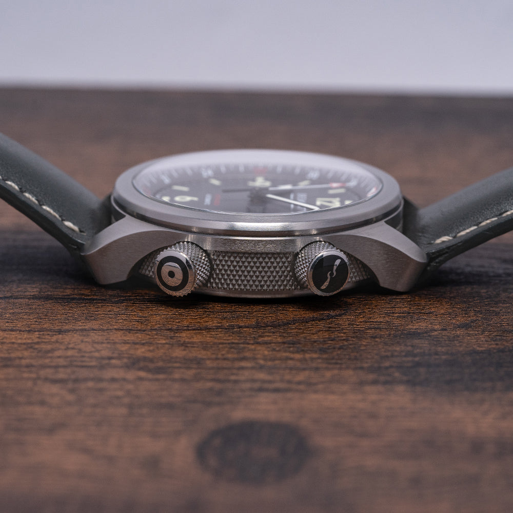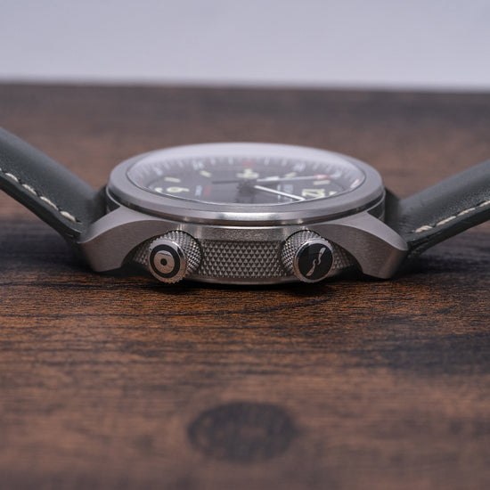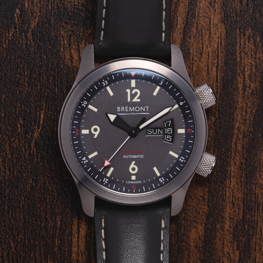 Bremont introduced the U-22 at BaselWorld in 2015, inspired and created for the secretive U-2 Spy plane squadron. The 43mm brushed hardened stainless steel round case uses the Bremont Trip-Tick construction system made up of 3 parts, a hardened steel bezel, a middle section DLC treated middle barrel plus we have an additional Bronze middle barrel which has been removed and is included in the box and finally a steel case back. A 49.5mm lug-to-lug length and a case thickness of 14mm give the watch an impressive wrist presence, and on the right side at 2 o’clock a screw-down crown to adjust the time and date and at 4 o’clock a screw-down crown for adjusting the compass quadrant chapter ring which is used by pilots when weather mapping, both have deep knurling making gripping them even with gloves on a satisfying experience. The brushed hardened bezel holds a flat sapphire crystal with AR coating applied to both sides, greatly reducing reflections. The gunmetal grey dial has yellow baton markings and thickly applied Super-LumiNova Arabic numerals, plongeur watch hands alongside a white sweeping seconds hand with a red arrow tip. At 3 o’clock a framed day/date window reflects the Altimeter found in the cockpit. On the reverse, a DLC-coated stainless steel screwed-in exhibition case back, inside suspended between a rubber sandwich we have the movement, this combination of parts to the case acts as a Faraday cage making it anti-magnetic and very shock absorbent. An automatic Modified Calibre 11 1/2" BE-36AE, 25 jewels, 28,800 beats per hour COSC certified to ISO 3159 standard, made up of an Anachron balance spring, Nivaflex 1 mainspring with a moulded skeletonised rotor. The watch comes fitted on a 22mm Bremont leather strap with a signed buckle and in the box are two additional 22mm Bremont leather straps, the watch comes with its Bremont presentation box, travel pouch and COSC Certificate.