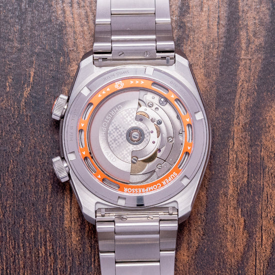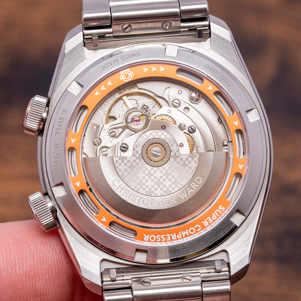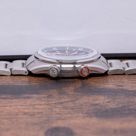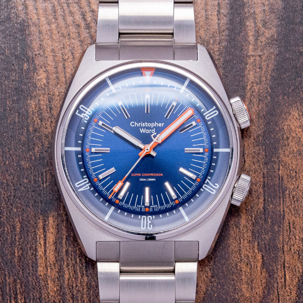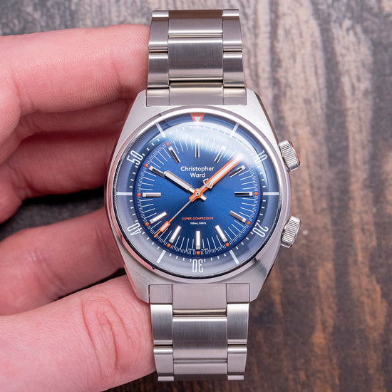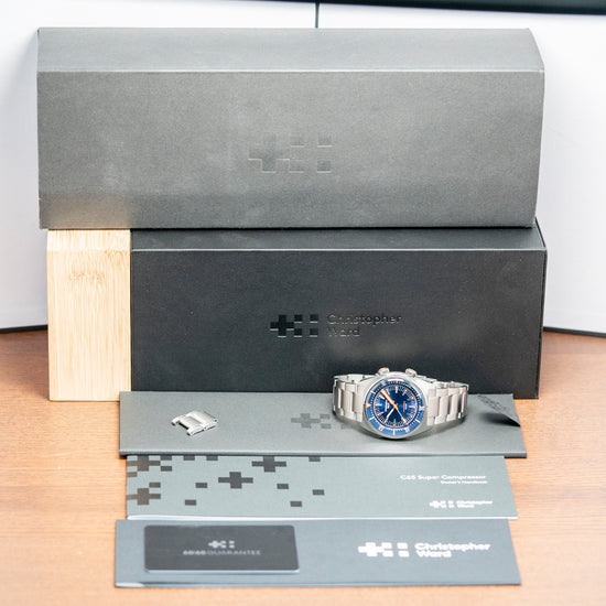 Here we have a 2021 Christopher Ward C65 Super Compressor Blue. Christopher Ward has recreated the Super Compressor with its retro styling cues and construction methods. They are the first to use a compression spring in the case back for a very long time. The Super Compressor watch case was created and patented in 1956 by Ervin Piquerez SA (EPSA). The 41mm brushed stainless steel cushion case curves towards the stubby lugs, and a lug-to-lug length of 47mm and a thickness of 13.5mm give the watch an impressive wrist presence. At 2 o’clock, a signed screw-down crown is used to adjust the inner bezel, the top hatching is orange, and at 4 o’clock, a signed screw-down crown is used to change the time. A glass box sapphire crystal emulates the crystals used in the past. The sunburst Ocean Blue dial, as you rotate your wrist, goes from blue to almost black, reflecting the ocean depths. The inner blue bezel has a 60-minute scale and is unidirectional, with 120 clicks and an orange triangle at 12. A minute track has orange lume pips and is further divided into 1/5th seconds for extra precision. Applied baton indexes mark the hours and are coated in SuperLumiNova. Broad hands with an orange minute hand filled with lume. A sweeping second hand with an orange counterweight and the Christopher Ward Trident. The text is precisely printed at 6 o’clock. Super Compressor is printed in orange. I think you can see a theme going on here. On the reverse, an exhibition case back showcases the orange compression ring that holds the spring. Inside an automatic Sellita SW200-1, 26 jewels, 28,800 beats per hour, the rotor is nicely decorated with the twin flag engraving. It comes paired on its original 22mm Christopher Ward signed brushed stainless steel bracelet secured by a signed clasp; all links are provided. Comes with its presentation box and papers.