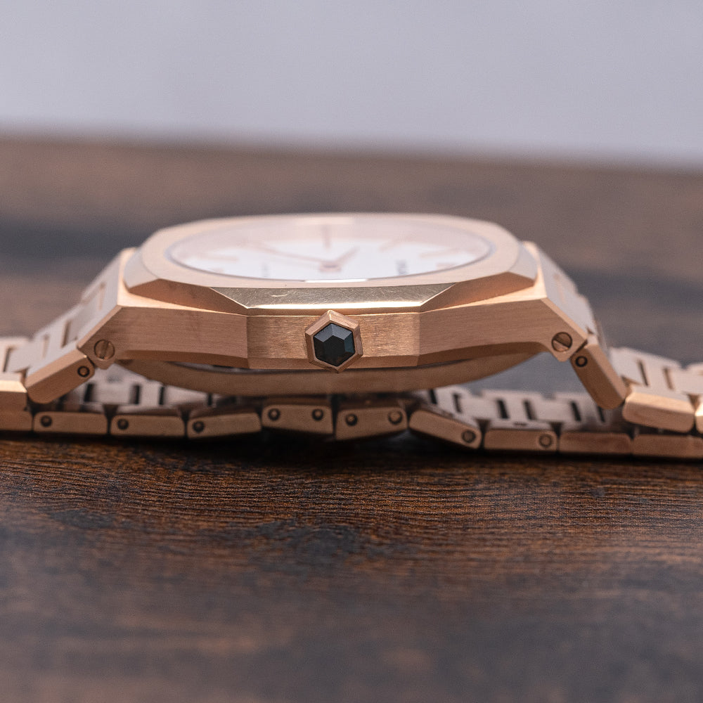 Here we have a 2021 D1- Milano Ultra Thin Quartz UTBL09 with a 34mm Rose Gold plated tonneau-shaped case that flows over your wrist towards screwed lugs, the ultra-thin profile has a lug-to-lug length of and a case thickness of just 6mm ensuring a comfortable fit on the wrist. On the right side, we have a hexagonal crown with a hexagonal cabochon. An octagonal smooth bezel has vertical brushing and polished chamfered sides holding a flat sapphire crystal above a sunburst silver dial. Slim-applied Rose Gold plated baton indexes mark the hours, elegant Rose Gold plated Dauphines hands sit majestically in the centre. At 12 o’clock we have the D1-Milano motif and at 6 o’clock “Ultra Thin” complete this minimalist sophisticated dress watch. On the reverse a screwed-down case back, inside a Quartz movement. The watch comes fitted on its D1-Milano integrated brushed Rose Gold plated bracelet with a hidden signed butterfly clasp and the watch comes with its D1-Milano presentation box and paperwork.