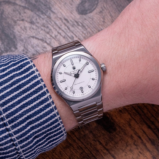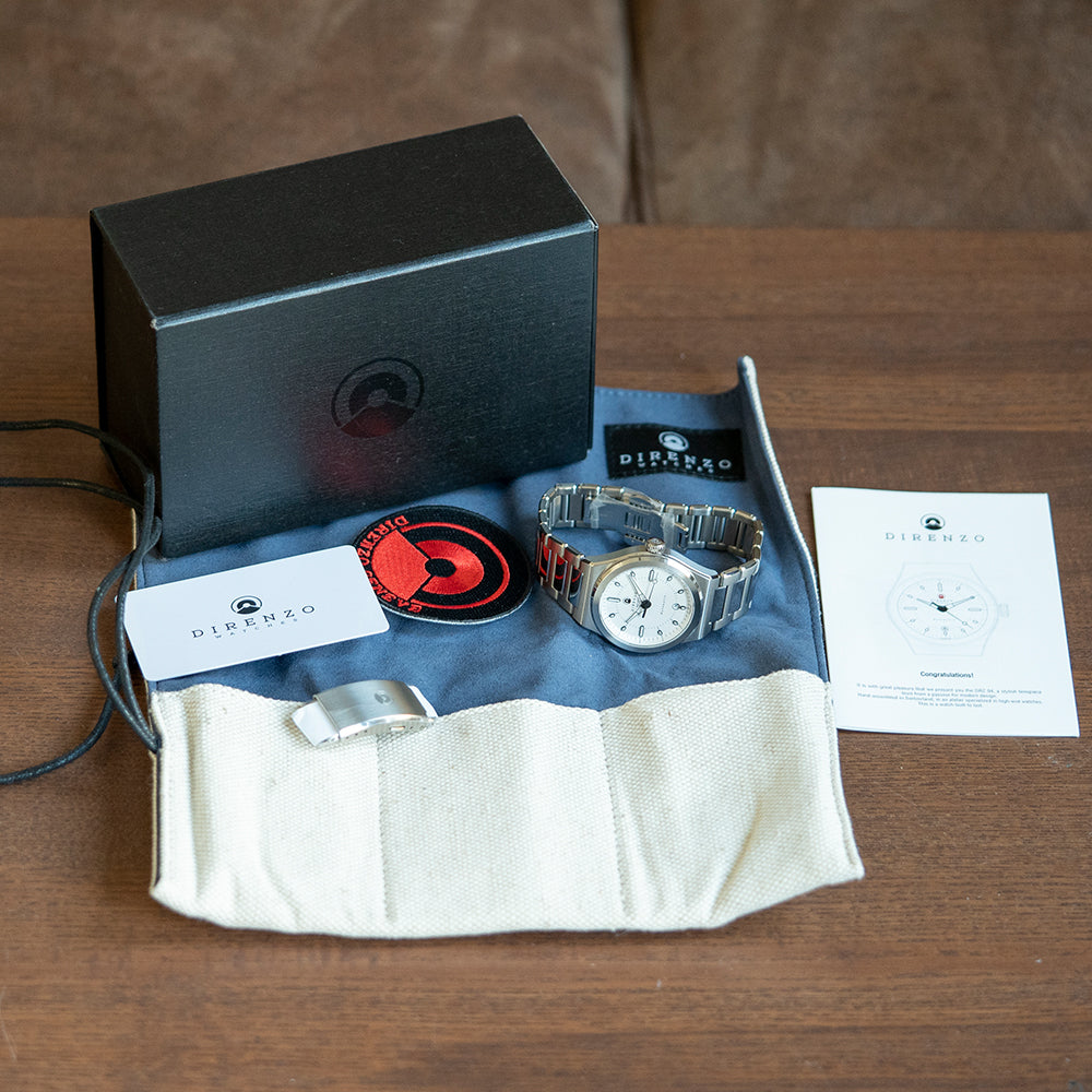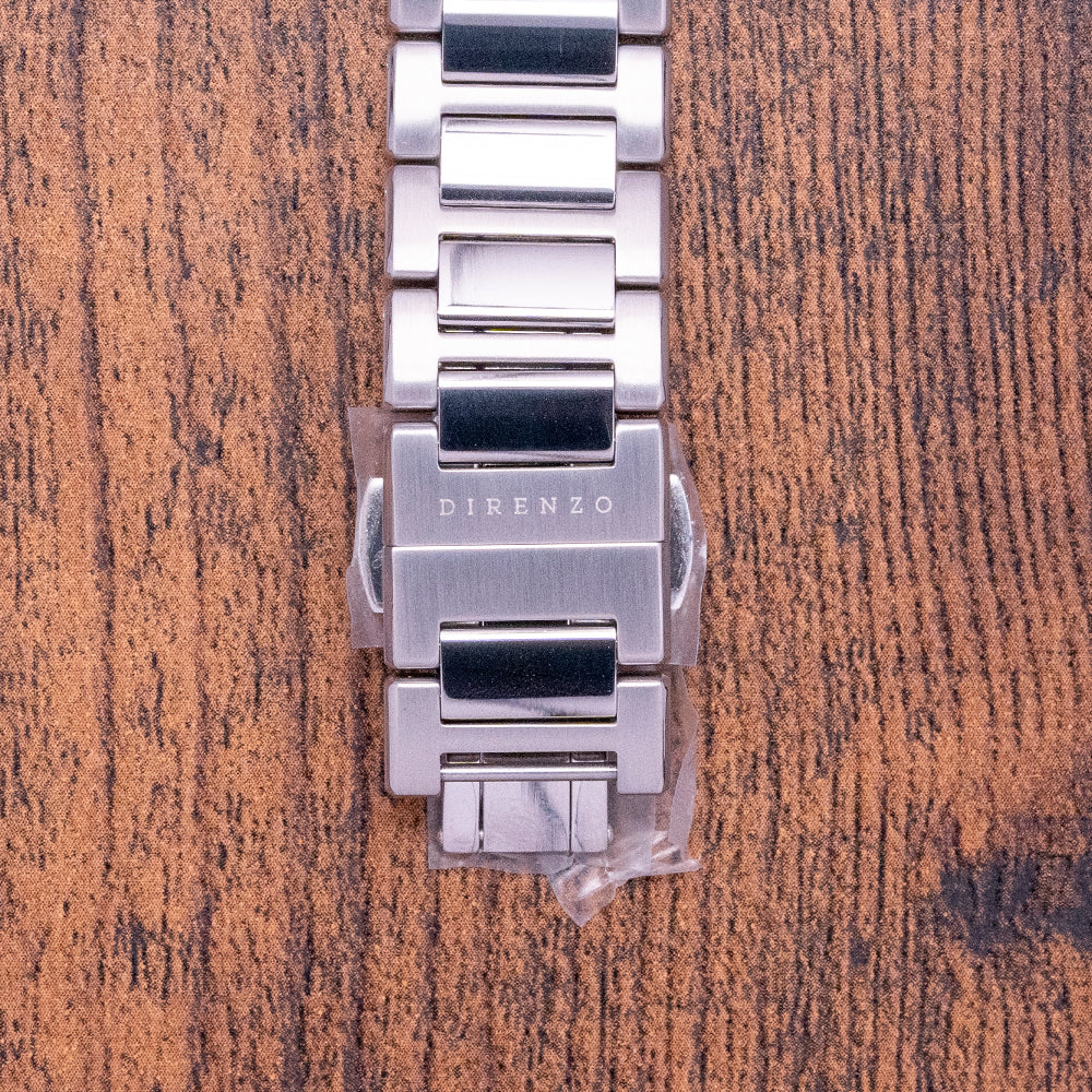 This watch is sold with its original Direnzo case and paperwork. The watch comes paired with its Direnzo integrated polished and brushed stainless steel bracelet fitted with a signed butterfly clasp, and screwed links and has a folded clasp with 3-micro adjustments in the box, all links are provided. The watch is from June 2021 and is in very good, lightly used condition as you can see from the photos. The watch comes with our 12-Months Warranty.