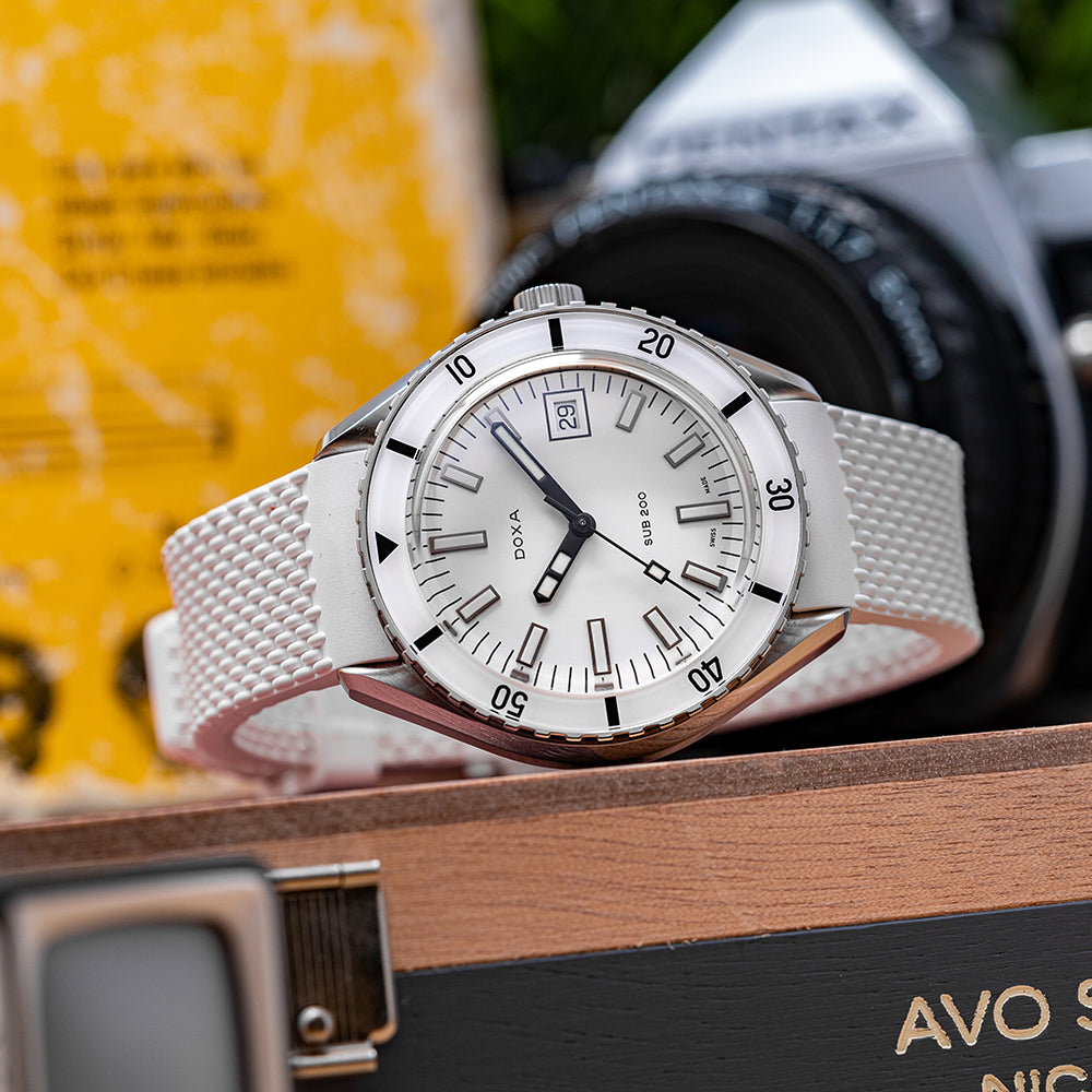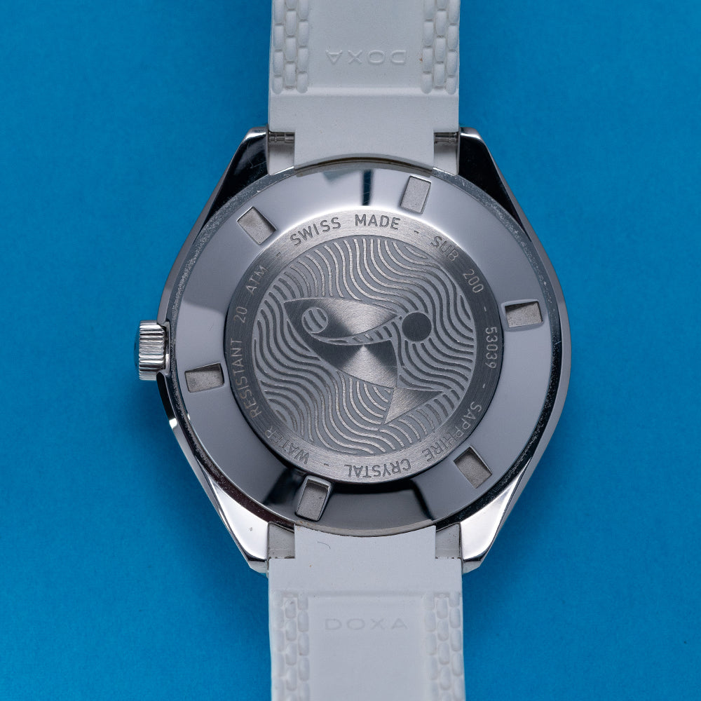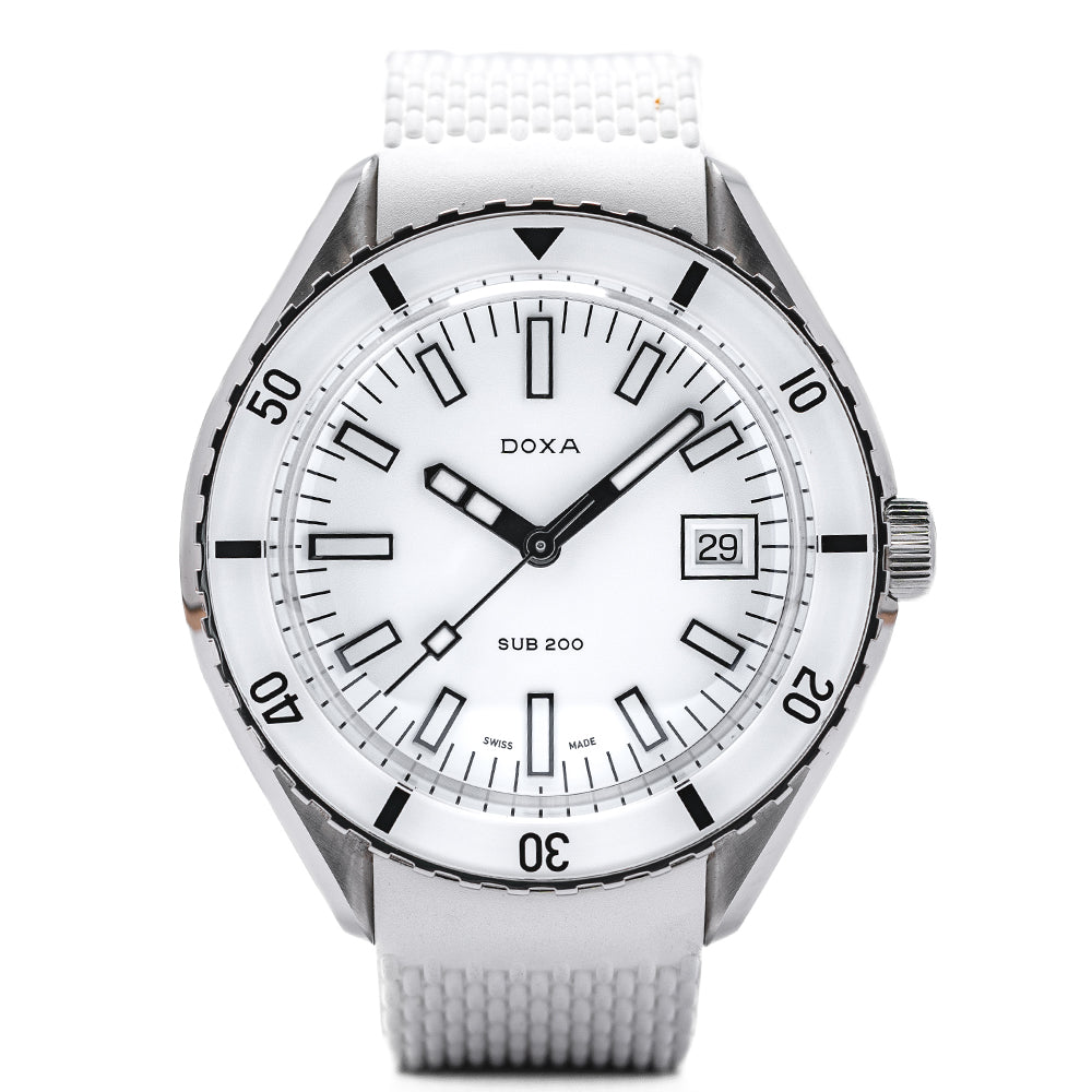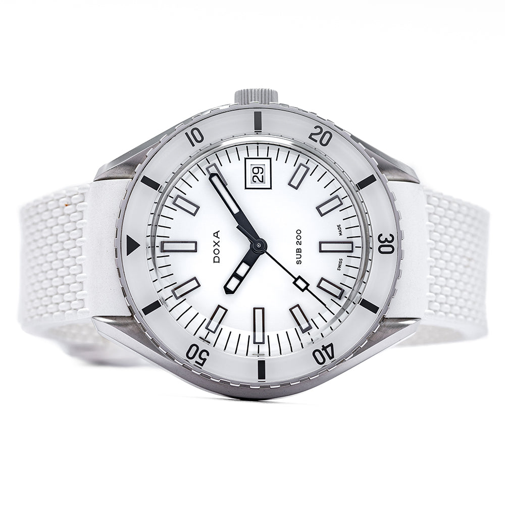 First unveiled at Baselworld 2019 this 2021 Doxa Sub 200 White Pearl 799.10.011.23 has a 42mm 316L stainless steel tonneau case, polished and brushed surfaces transition with crisp lines, bevel edges, a lug-to-lug length of 46mm and a case thickness of 13.5mm giving the watch an impressive wrist presence. On the right side is a signed screw-down crown with a black Doxa fish symbol. The unidirectional dive bezel has a white sapphire insert with a 60-minute scale and holds a scratch-resistant sapphire box crystal with an anti-reflective coating and a distinctive curvature of the dome that reminds us of the plexiglass crystals used in the 1960s. The white pearl dial has an outer minute track with applied baton indexes outlined in black coated in Super‑LumiNova marking the hours, at 3 o’clock a framed date window, and sword hands complemented by a tapered second hand all coated in the same Super‑LumiNova and at 12 o’clock we have the DOXA motif and at 6 o’clock “SUB 200” completes this striking dive tool watch. On the reverse a screw-down case back with the deeply engraved DOXA fish symbol on top of a wave pattern, inside an Automatic Sellita SW200, 26 jewels, 28,800 beats per hour. The watch comes fitted on its DOXA 19mm white rubber strap and a pin buckle with the DOXA fish symbol and the watch comes with its DOXA presentation box, travel case and paperwork.