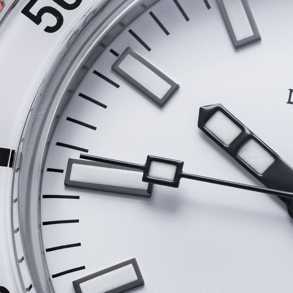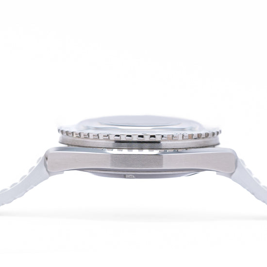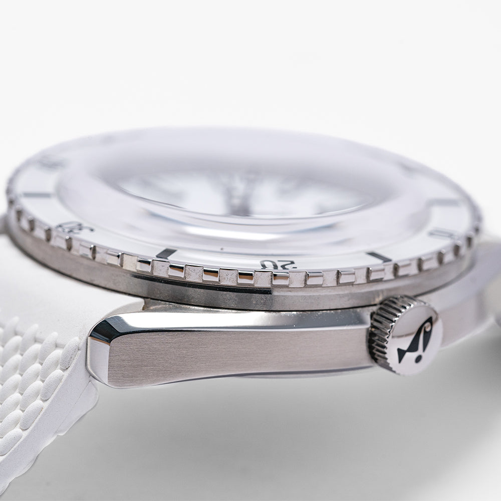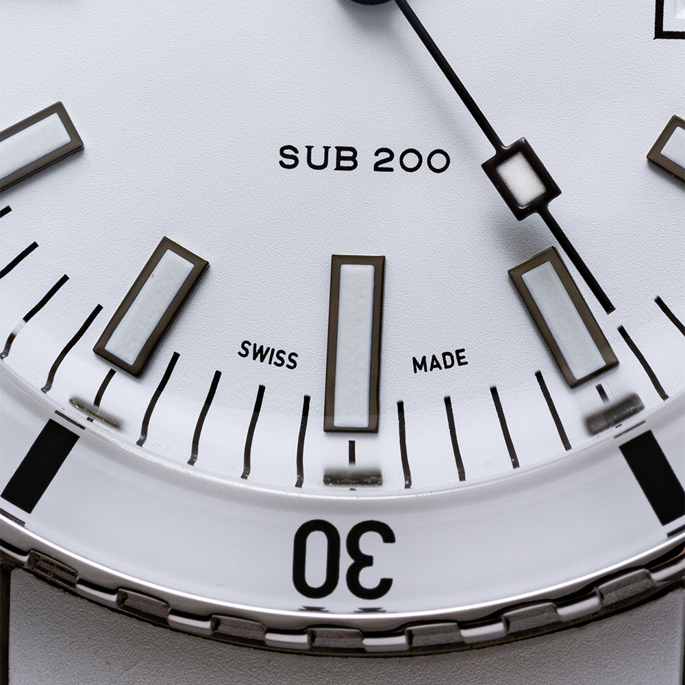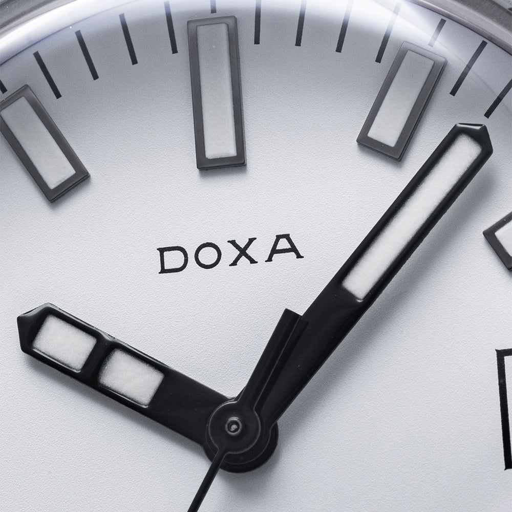 First unveiled at Baselworld 2019 this 2021 Doxa Sub 200 White Pearl 799.10.011.23 has a 42mm 316L stainless steel tonneau case, polished and brushed surfaces transition with crisp lines, bevel edges, a lug-to-lug length of 46mm and a case thickness of 13.5mm giving the watch an impressive wrist presence. On the right side is a signed screw-down crown with a black Doxa fish symbol. The unidirectional dive bezel has a white sapphire insert with a 60-minute scale and holds a scratch-resistant sapphire box crystal with an anti-reflective coating and a distinctive curvature of the dome that reminds us of the plexiglass crystals used in the 1960s. The white pearl dial has an outer minute track with applied baton indexes outlined in black coated in Super‑LumiNova marking the hours, at 3 o’clock a framed date window, and sword hands complemented by a tapered second hand all coated in the same Super‑LumiNova and at 12 o’clock we have the DOXA motif and at 6 o’clock “SUB 200” completes this striking dive tool watch. On the reverse a screw-down case back with the deeply engraved DOXA fish symbol on top of a wave pattern, inside an Automatic Sellita SW200, 26 jewels, 28,800 beats per hour. The watch comes fitted on its DOXA 19mm white rubber strap and a pin buckle with the DOXA fish symbol and the watch comes with its DOXA presentation box, travel case and paperwork.