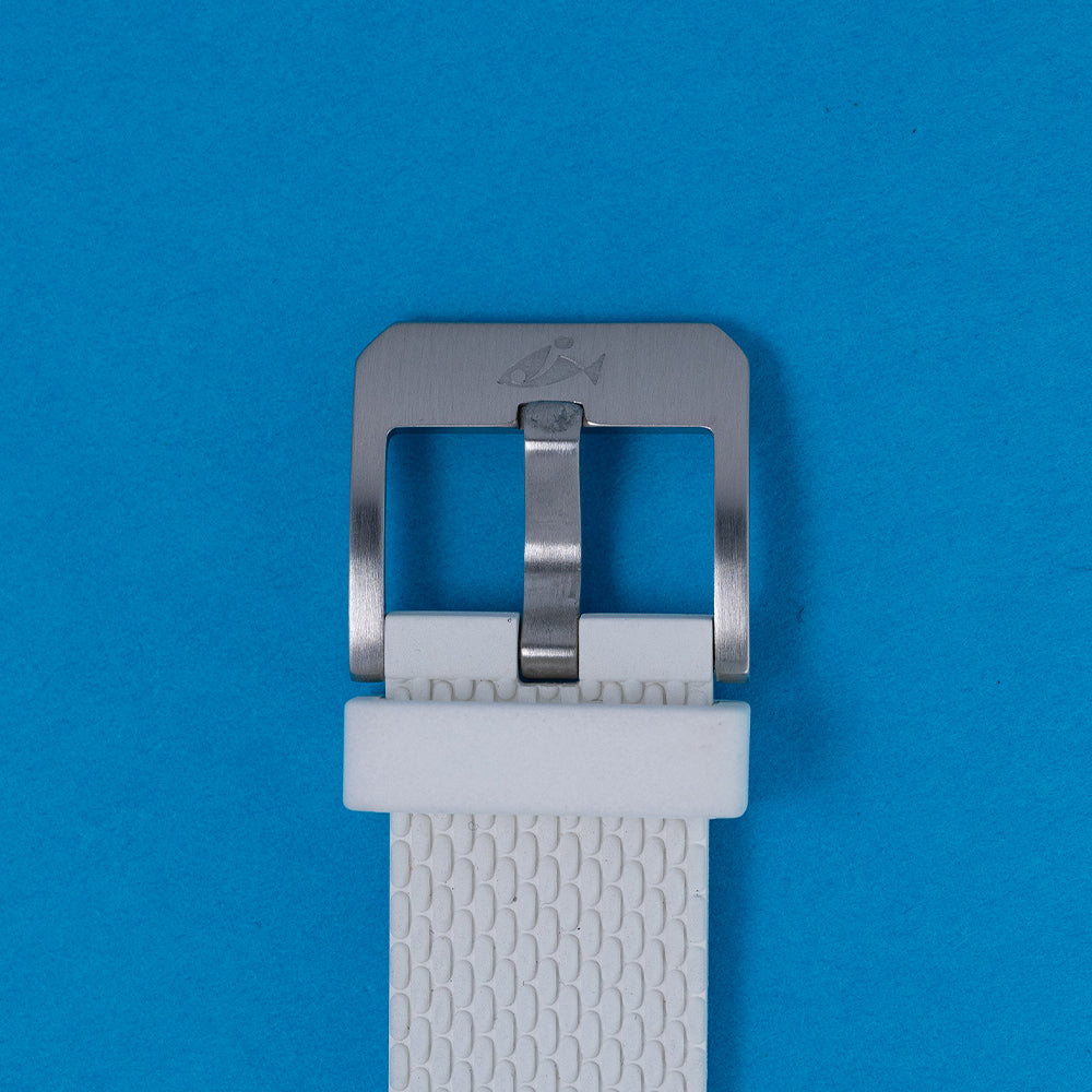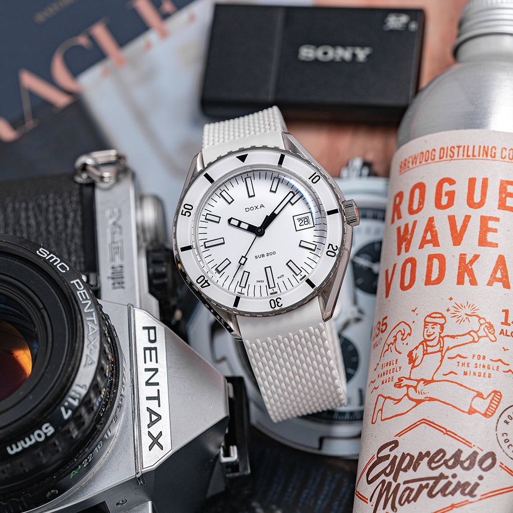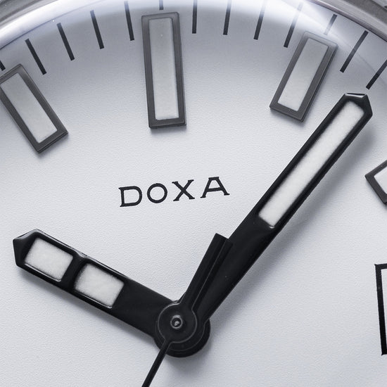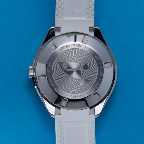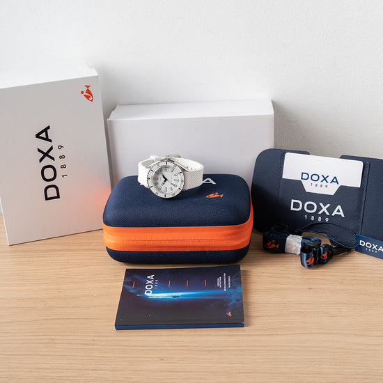This watch is sold with its original DOXA Box, travel case & Paperwork. The watch comes paired with its original DOXA 19mm white rubber strap and a pin buckle with the DOXA fish symbol. The watch is from June 2021 and is sold in worn condition, but overall very good and hardly worn as you can see. The watch comes with our 12-Month Warranty.